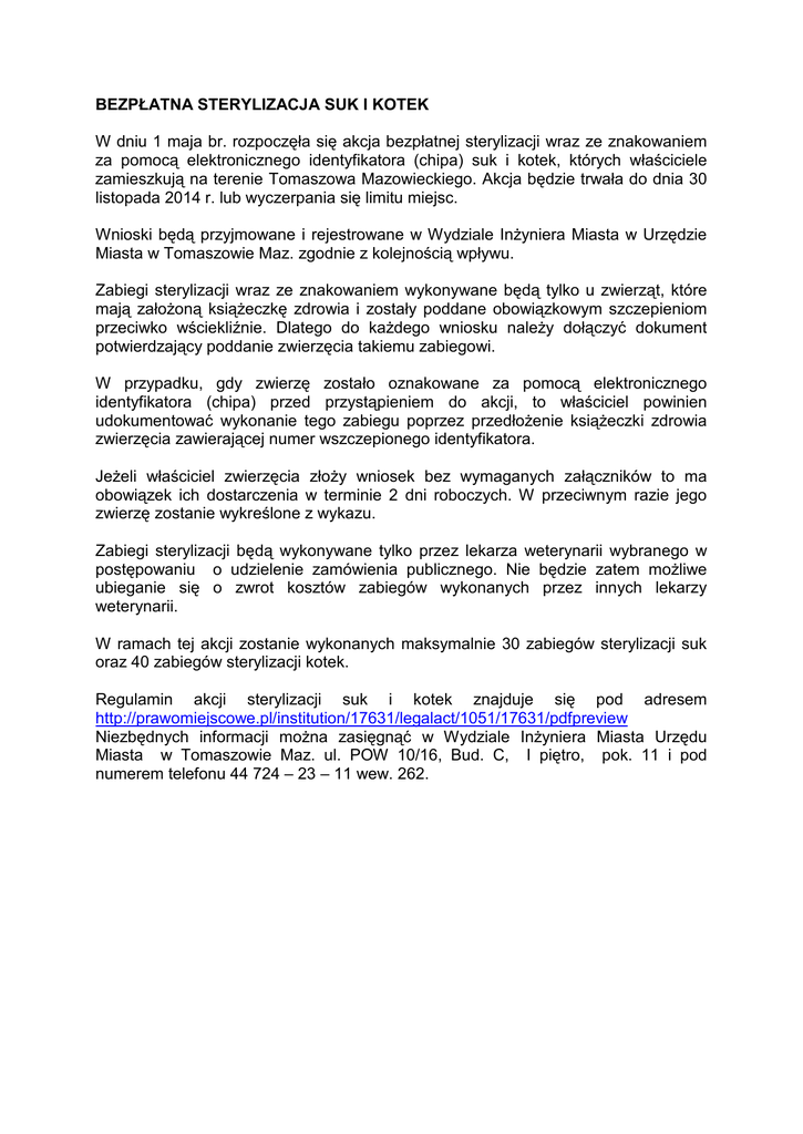 BEZPŁATNA STERYLIZACJA SUK I KOTEK W dniu 1 maja br. rozpoczęła się akcja bezpłatnej sterylizacji wraz ze znakowaniem za pomocą elektronicznego identyfikatora (chipa) suk i kotek, których właściciele zamieszkują na terenie Tomaszowa Mazowieckiego. Akcja będzie trwała do dnia 30 listopada 2014 r. lub wyczerpania się limitu miejsc. Wnioski będą przyjmowane i rejestrowane w Wydziale Inżyniera Miasta w Urzędzie Miasta w Tomaszowie Maz. zgodnie z kolejnością wpływu. Zabiegi sterylizacji wraz ze znakowaniem wykonywane będą tylko u zwierząt, które mają założoną książeczkę zdrowia i zostały poddane obowiązkowym szczepieniom przeciwko wściekliźnie. Dlatego do każdego wniosku należy dołączyć dokument potwierdzający poddanie zwierzęcia takiemu zabiegowi. W przypadku, gdy zwierzę zostało oznakowane za pomocą elektronicznego identyfikatora (chipa) przed przystąpieniem do akcji, to właściciel powinien udokumentować wykonanie tego zabiegu poprzez przedłożenie książeczki zdrowia zwierzęcia zawierającej numer wszczepionego identyfikatora. Jeżeli właściciel zwierzęcia złoży wniosek bez wymaganych załączników to ma obowiązek ich dostarczenia w terminie 2 dni roboczych. W przeciwnym razie jego zwierzę zostanie wykreślone z wykazu. Zabiegi sterylizacji będą wykonywane tylko przez lekarza weterynarii wybranego w postępowaniu o udzielenie zamówienia publicznego. Nie będzie zatem możliwe ubieganie się o zwrot kosztów zabiegów wykonanych przez innych lekarzy weterynarii. W ramach tej akcji zostanie wykonanych maksymalnie 30 zabiegów sterylizacji suk oraz 40 zabiegów sterylizacji kotek. Regulamin akcji sterylizacji suk i kotek znajduje się pod adresem http://prawomiejscowe.pl/institution/17631/legalact/1051/17631/pdfpreview Niezbędnych informacji można zasięgnąć w Wydziale Inżyniera Miasta Urzędu Miasta w Tomaszowie Maz. ul. POW 10/16, Bud. C, I piętro, pok. 11 i pod numerem telefonu 44 724 – 23 – 11 wew. 262.