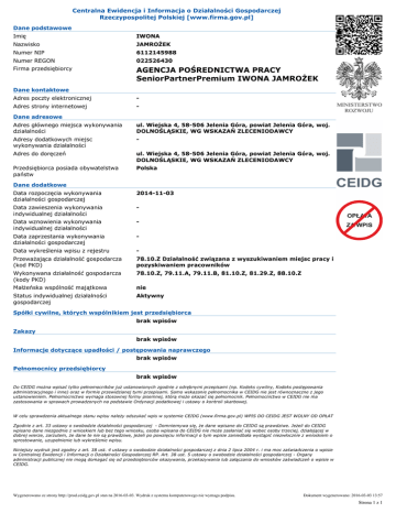 Centralna Ewidencja i Informacja o Działalności Gospodarczej Rzeczypospolitej Polskiej [www.firma.gov.pl] Dane podstawowe Imię IWONA Nazwisko JAMROŻEK Numer NIP 6112145988 Numer REGON 022526430 Firma przedsiębiorcy AGENCJA POŚREDNICTWA PRACY SeniorPartnerPremium IWONA JAMROŻEK Dane kontaktowe Adres poczty elektronicznej Adres strony internetowej Dane adresowe Adres głównego miejsca wykonywania działalności ul. Wiejska 4, 58506 Jelenia Góra, powiat Jelenia Góra, woj. DOLNOŚLĄSKIE, WG WSKAZAŃ ZLECENIODAWCY Adresy dodatkowych miejsc wykonywania działalności Adres do doręczeń ul. Wiejska 4, 58506 Jelenia Góra, powiat Jelenia Góra, woj. DOLNOŚLĄSKIE, WG WSKAZAŃ ZLECENIODAWCY Przedsiębiorca posiada obywatelstwa państw Polska Dane dodatkowe Data rozpoczęcia wykonywania działalności gospodarczej 20141103 Data zawieszenia wykonywania indywidualnej działalności Data wznowienia wykonywania indywidualnej działalności Data zaprzestania wykonywania działalności gospodarczej Data wykreślenia wpisu z rejestru Przeważająca działalność gospodarcza (kod PKD) 78.10.Z Działalność związana z wyszukiwaniem miejsc pracy i pozyskiwaniem pracowników Wykonywana działalność gospodarcza (kody PKD) 78.10.Z, 79.11.A, 79.11.B, 81.10.Z, 81.29.Z, 88.10.Z Małżeńska wspólność majątkowa nie Status indywidualnej działalności gospodarczej Aktywny Spółki cywilne, których wspólnikiem jest przedsiębiorca brak wpisów Zakazy brak wpisów Informacje dotyczące upadłości / postępowania naprawczego brak wpisów Pełnomocnicy przedsiębiorcy brak wpisów Do CEIDG można wpisać tylko pełnomocników już ustanowionych zgodnie z odrębnymi przepisami (np. Kodeks cywilny, Kodeks postępowania administracyjnego i inne) oraz w formie przewidzianej tymi przepisami. Samo wskazanie pełnomocnika w CEIDG nie jest równoznaczne z jego ustanowieniem. Pełnomocnictwo wymaga stosownej formy pisemnej, którą może okazać się pełnomocnik. Pełnomocnictwo w CEIDG nie ma zastosowania w sprawach prowadzonych na podstawie Ordynacji podatkowej i ustawy o kontroli skarbowej. W celu sprawdzenia aktualnego stanu wpisu należy odszukać wpis w systemie CEIDG (www.firma.gov.pl) WPIS DO CEIDG JEST WOLNY OD OPŁAT Zgodnie z art. 33 ustawy o swobodzie działalności gospodarczej Domniemywa się, że dane wpisane do CEIDG są prawdziwe. Jeżeli do CEIDG wpisano dane niezgodnie z wnioskiem lub bez tego wniosku, osoba wpisana do CEIDG nie może zasłaniać się wobec osoby trzeciej, działającej w dobrej wierze, zarzutem, że dane te nie są prawdziwe, jeżeli po powzięciu informacji o tym wpisie zaniedbała wystąpić niezwłocznie z wnioskiem o sprostowanie, uzupełnienie lub wykreślenie wpisu. Niniejszy wydruk jest zgodny z art. 38 ust. 4 ustawy o swobodzie działalności gospodarczej z dnia 2 lipca 2004 r. i ma moc zaświadczenia o wpisie w Centralnej Ewidencji i Informacji o Działalności Gospodarczej RP. Art. 38 ust. 5 ustawy o swobodzie działalności gospodarczej Organy administracji publicznej nie mogą domagać się od przedsiębiorców okazywania, przekazywania lub załączania do wniosków zaświadczeń o wpisie w CEIDG. Wygenerowano ze strony http://prod.ceidg.gov.pl stan na 2016-03-03. Wydruk z systemu komputerowego nie wymaga podpisu. Dokument wygenerowano: 2016-03-03 13:57 Strona 1 z 1