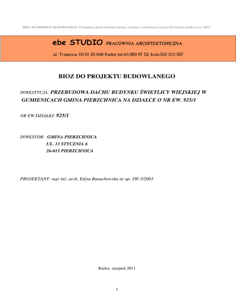 BIOZ DO PROJEKTU BUDOWLANEGO: Przebudowa dachu budynku świetlicy wiejskiej w Gumienicach gmina Pierzchnica działka nr ew. 925/1 ebe STUDIO PRACOWNIA ARCHITEKTONICZNA ul. Triasowa 10/10 25−640 Kielce tel.41/369 97 52, kom.502 312 587 BIOZ DO PROJEKTU BUDOWLANEGO INWESTYCJA: PRZEBUDOWA DACHU BUDYNKU ŚWIETLICY WIEJSKIEJ W GUMIENICACH GMINA PIERZCHNICA NA DZIAŁCE O NR EW. 925/1 NR EW DZIAŁKI: 925/1 INWESTOR: GMINA PIERZCHNICA UL. 13 STYCZNIA 6 26-015 PIERZCHNICA PROJEKTANT: mgr inŜ. arch. Edyta Banachowska nr up. SW-5/2003 Kielce, sierpień 2011 1 BIOZ DO PROJEKTU BUDOWLANEGO: Przebudowa dachu budynku świetlicy wiejskiej w Gumienicach gmina Pierzchnica działka nr ew. 925/1 1. Przedmiot inwestycji Projektuje się przebudowę dachu nad istniejącym budynkiem świetlicy wiejskiej oraz docieplenie ścian zewnętrznych. Zakres projektu nie obejmuje zagospodarowania terenu, przebudowy parteru budynku, zmian w elewacji. 2. Podstawowe dane gabarytowe budynku (wg PN-ISO 9836:1997). Powierzchnia zabudowy po dociepleniu 165.11m2 Powierzchnia dachu po przebudowie 217.69m2 Wysokość budynku (do kalenicy) po przebudowie 7.15m Kąt nachylenia połaci dachowej pozostaje 21 st 3. Stan istniejący Budynek około 40 letni, ściany zewnętrzne grubości ok. 38cm wybudowane z białych pustaków, wewnętrzne 12 i 32 równieŜ cegła biała. Dach czterospadowy, pokryty blachą powlekaną płaską, ponad dach wyniesiona wieŜa w konstrukcji drewnianej słuŜąca do suszenia 8 metrowych węŜy straŜackich. Strop z belek stalowych 7.5x15.5 w rozstawie ok. 110cm z wypełnieniem. Brak wieńca obwodowego. Więźba w stanie technicznym dobrym, okap zaprojektowano na linii gzymsu, co powoduje przeciekanie do wnętrza. 4. Lokalizacja inwestycji. Inwestycja zlokalizowana jest w Gumienicach gmina Pierzchnica na działce nr ew 925/1. 5. Inwestor. GMINA PIERZCHNICA UL. 13 STYCZNIA 6 26-015 PIERZCHNICA część a: ROBOTY BUDOWLANE 6. Zakres robót. Zakres robót obejmuje przebudowę dachu nad istniejącym budynkiem świetlicy wiejskiej oraz docieplenie ścian zewnetrznych. Zakres projektu nie obejmuje zagospodarowania terenu, przebudowy parteru budynku, zmian w elewacji. 7 Wykaz istniejących obiektów budowlanych: Na obszarze terenu objętego wnioskiem znajduje budynek świetlicy wiejskiej. 8. Elementy stwarzające zagroŜenie: ZagroŜenia wynikające z pracy na wysokości: - upadek pracownika lub osoby postronnej z wysokości - upuszczenie materiału budowlanego na pracownika-osobę postronną. ZagroŜenia wynikające z pracy maszyn na placu budowy: – pochwycenie kończyny 2 BIOZ DO PROJEKTU BUDOWLANEGO: Przebudowa dachu budynku świetlicy wiejskiej w Gumienicach gmina Pierzchnica działka nr ew. 925/1 - potrącenie pracownika, − poraŜenie prądem. 9. Wskazania Pracownicy zatrudnieni na budowie powinni posiadać odpowiednie kwalifikacje oraz zostać przeszkoleni w zakresie bezpieczeństwa i higieny pracy. Przed przystąpieniem do robót budowlanych kierownik budowy powinien sporządzić Plan Bezpieczeństwa i Ochrony Zdrowia. Roboty powinny być prowadzone pod fachowym nadzorem przez osoby posiadające odpowiednie kwalifikacje i uprawnienia. Wszystkie uŜyte materiały powinny posiadać aprobatę techniczną, obowiązkowy certyfikat zgodnosci i oznaczenien znakiem bezpieczeństwa „B” lub dobrowolny certyfikat zgodności i oznac nadanymi znakami )”PN”, „E”, „Q”) lub deklarację zgodnosci z obowiązującymi przepisami oraz Polskimi Normami i aprobatę techniczną. część b: ROBOTY ROZBIÓRKOWE 10. Ogólny opis. Obiekt kwalifikuje się do częściowej rozbiórki ze względu na wadliwe wykonanie dachu powodujące przeciekanie w okolicach okapów i zamakanie ścian zewnętrznych i wewnętrznych, oraz stan techniczny dachu i wieźby wskazujący na ich zuŜycie. 11. Zakres robót. Rozbiórka więźby dachowej, kominów, obróbek. Elementy drewniane i murowane z rozbiórki zostaną wywiezione zgodnie z obowiązującymi przepisami tj. ustawą o odpadach i ustawą Prawo ochrony środowiska. 12. Opis sposobu zapewnienia bezpieczeństwa ludzi i mienia. 12.1. Wykonawca przed przystąpieniem do wykonywania robót rozbiórkowych jest zobowiązany opracować instrukcję bezpiecznego ich wykonywania i zaznajomić z nią pracowników w zakresie wykonywanych przez nich robót. 12.2 Teren na którym prowadzone będą roboty rozbiórkowe naleŜy oznakować tablicami ostrzegawczymi. 12.3. Strefę niebezpieczną naleŜy ogrodzić i oznakować w sposób uniemozliwiający dostęp osobom postronnym. 12.4. Strefa niebezpieczna, o której mowa, w swym najmniejszym wymiarze liniowym liczonym od płaszczyzny obiektu budowlanego, nie moŜe wynosić mniej niŜ 10 m. 12.5. Pracownicy przebywający na stanowiskach pracy, znajdujących się na wysokości, co najmniej 1 m od poziomu podłogi lub ziemi, powinny być zabezpieczeni przed upadkiem z wysokości poprzez wykonanie balustrady z deski krawęŜnikowej o wysokości 0,15 m i poręczy ochronnej umieszczonej na wysokości 1,1 m. Wolną przestrzeń pomiędzy deską krawęŜnikową a poręczą naleŜy wypełnić w sposób zabezpieczający pracowników przed upadkiem z wysokości. Alternatywnym rozwiązaniem jest zabezpieczenie będące w instrukcji uŜytkowania określonego systemu rusztowań. 12.6. Prowadzenie robót rozbiórkowych, jeŜeli zachodzi moŜliwość przewrócenia części konstrukcji obiektu przez wiatr, jest zabronione. 13. Wskazanie elementów zagospodarowania działki lub terenu, które mogą stwarzać zagroŜenie bezpieczeństwa i zdrowia ludzi. ZagroŜenie bezpieczeństwa i zdrowia ludzi zachodzi szczególnie podczas: 3 BIOZ DO PROJEKTU BUDOWLANEGO: Przebudowa dachu budynku świetlicy wiejskiej w Gumienicach gmina Pierzchnica działka nr ew. 925/1 − pracy na wysokości (przy rozbiórce pokrycia dachowego, dachu, więźby dachowej), − rozbiórki komina, Wskazanie dotyczące przewidywanych zagroŜeń występujących podczas realizacji robót budowlanych, 