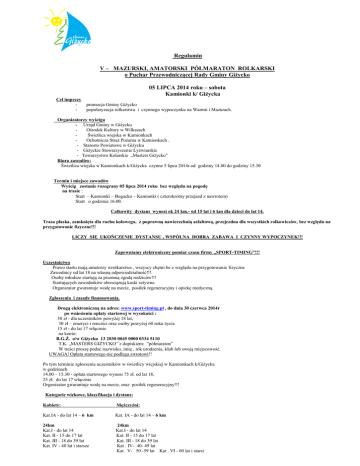 Regulamin V – MAZURSKI, AMATORSKI PÓŁMARATON ROLKARSKI o Puchar Przewodniczącej Rady Gminy Giżycko 05 LIPCA 2014 roku – sobota Kamionki k/ Giżycka Cel imprezy - promocja Gminy Giżycko popularyzacja rolkarstwa i czynnego wypoczynku na Warmii i Mazurach. Organizatorzy wyścigu - Urząd Gminy w Giżycku Ośrodek Kultury w Wilkasach Świetlica wiejska w Kamionkach Ochotnicza Straż Pożarna w Kamionkach . - Starosto Powiatowe w Giżycku - Giżyckie Stowarzyszenie Łyżwiarskie - Towarzystwo Kolarskie „Masters Giżycko” Biuro zawodów: Świetlica wiejska w Kamionkach k/Giżycka czynne 5 lipca 2014r.od godziny 14.00 do godziny 15.30 Termin i miejsce zawodów Wyścig zostanie rozegrany 05 lipca 2014 roku bez względu na pogodę na trasie : Start – Kamionki – Bogacko – Kamionki ( czterokrotny przejazd z nawrotem) Start o godzinie 16.00. Całkowity dystans wynosi ok 24 km.- od 15 lat i 6 km dla dzieci do lat 14. Trasa płaska, zamknięta dla ruchu kołowego, z poprawną nawierzchnią asfaltową, przejezdna dla wszystkich rolkowiczów, bez względu na przygotowanie fizyczne!!! LICZY SIĘ UKOŃCZENIE DYSTANSU , WSPÓLNA DOBRA ZABAWA I CZYNNY WYPOCZYNEK!!! Zapewniamy elektroniczny pomiar czasu firmy „SPORT-TIMING”!!! Uczestnictwo Prawo startu mają amatorzy wrotkarstwa , wszyscy chętni be z względu na przygotowanie fizyczne Zawodnicy od lat 18 na własną odpowiedzialność!!!. Osoby młodsze startują za pisemną zgodą rodziców!!! Startujących zawodników obowiązują kaski sztywne. Organizator gwarantuje wodę na mecie, posiłek regeneracyjny i opiekę medyczną. Zgłoszenia i zasady finansowania. Drogą elektroniczną na adres: www.sport-timing.pl , do dnia 30 czerwca 2014r po wniesieniu opłaty startowej w wysokości : 50 zł - dla uczestników powyżej 18 lat, 30 zł – emeryci i renciści oraz osoby powyżej 60 roku życia 15 zł - do lat 17 włącznie na konto: B.G.Ż. o/w Giżycku 13 2030 0045 0000 0334 5110 T.K. „MASTERS GIŻYCKO” z dopiskiem: ”półmaraton” W treści proszę podać nazwisko, imię , rok urodzenia, klub lub swoją miejscowość. UWAGA! Opłata startowego nie podlega zwrotowi!! Po tym terminie zgłoszenia uczestników w świetlicy wiejskiej w Kamionkach k/Giżycka w godzinach 14.00 – 15.30 - opłata startowego wynosi 75 zł. od lat 18, 25 zł. do lat 17 włącznie Organizator gwarantuje wodę na mecie, oraz posiłek regeneracyjny!!! Kategorie wiekowe, klasyfikacja i dystans: Kobiety: Mężczyżni: Kat.IA - do lat 14 – 6 km Kat. IA - do lat 14 – 6 km 24km Kat.I - do lat 14 Kat. II - 15 do 17 lat Kat. III - 18 do 39 lat Kat. IV - 40 lat i starsze 24km Kat.I - do lat 14 Kat. II - 15 do 17 lat Kat. III - 18 do 39 lat Kat . IV- 40- 49 lat Kat. V- 50 -59 lat Kat . VI - 60 lat i starsi Nagrody I -III miejsca w każdej kategorii wiekowej : puchar i dyplom, Wszystkim uczestnikom za ukończenie wyścigu wręczone zostaną pamiątkowe medale!!! Postanowienia końcowe . Każdy zawodnik ubezpiecza się od następstw nieszczęśliwych wypadków we własnym zakresie / OC i NW/ i uczestniczy w wyścigu na własną odpowiedzialność!!! Organizator nie odpowiada za szkody wyrządzone przez lub na rzecz uczestników wyścigów i osób towarzyszących Organizator zastrzega sobie prawo do interpretacji niniejszego regulaminu w porozumieniu z Sędzią Głównym wyścigu . Odpowiedzialnym za przebieg i bezpieczeństwo imprezy z ramienia organizatora jest Jerzy Gawarecki – Prezes Towarzystwa Kolarskiego „ Masters Giżycko” tel. 0 – 502 84 10 33 E – mail : masters7@ wp.pl Adres szpitala : Samodzielny Publiczny Zakład Opieki Zdrowotnej w Giżycku ul.Warszawska 41 tel. centrali : 0 – 87 428 52 71 Zapraszamy - życzymy sukcesów i radości ze sportowej rywalizacji . Organizatorzy: T O W A R Z Y S T W O K O L A R S K I E G IŻ Y C K O “ M A S T E R S G I Ż Y C K O ” ul. Warszawska 28 11 – 500 Giżycko tel. 0 – 502 84 10 33 e – mail: [email protected] MAPKA LOKALIZACJI PÓŁMARATONU ROLKARSKIEGO 05 lipca 2014 r.