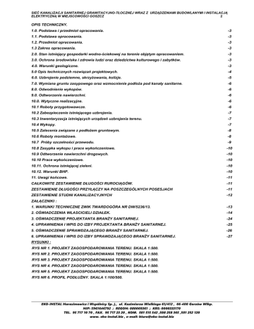 SIEĆ KANALIZACJI SANITARNEJ GRAWITACYJNO-TŁOCZNEJ WRAZ Z URZĄDZENIAMI BUDOWLANYMI I INSTALACJĄ ELEKTRYCZNĄ W MIEJSCOWOŚCI GOSZCZ 2 OPIS TECHNICZNY. 1.0. Podstawa i przedmiot opracowania. -3 1.1. Podstawa opracowania. -3 1.2. Przedmiot opracowania. -3 1.3 Zakres opracowania. -3 2.0. Stan istniejący gospodarki wodno-ściekowej na terenie objętym opracowaniem. -3 3.0. Ochrona środowiska i zdrowia ludzi oraz dziedzictwa kulturowego i zabytków. -3 4.0. Warunki geologiczne. -3 5.0 Opis technicznych rozwiązań projektowych. -4 6.0. Uzbrojenie podziemne, skrzyżowania, kolizje. -5 7.0. Wymiana gruntu zasypowego oraz wzmocnienie podłoża pod kanały sanitarne. -6 8.0. Odwodnienie wykopów. -6 9.0. Odtworzenie nawierzchni. -6 10.0. Wytyczne realizacyjne. -6 10.1 Roboty przygotowawcze. -6 10.2 Zabezpieczenie istniejącego uzbrojenia. -7 10.3 Inwentaryzacja istniejących urządzeń uzbrojenia terenu. -7 10.4 Wykopy. -7 10.5 Zalecenia związane z podłożem gruntowym. -8 10.6 Roboty montażowe. -8 10.7 Próby szczelności przewodu. -9 10.8 Zasypka wykopu i prace wykończeniowe. -10 10.9 Odtworzenie nawierzchni drogowych. -10 10.10 Prace wykończeniowe. -10 10.11. Ochrona istniejącej zieleni. -10 10.12. Warunki BHP. -10 11. Uwagi końcowe. -11 CAŁKOWITE ZESTAWIENIE DŁUGOŚCI RUROCIĄGÓW. -11 ZESTAWIENIE DŁUGOŚCI PRZYŁĄCZY NA POSZCZEGÓLNYCH POSESJACH -11 ZESTAWIENIE STUDNI KANALIZACYJNYCH -12 ZAŁĄCZNIKI : 1. WARUNKI TECHNICZNE ZWIK TWARDOGÓRA NR DW/5236/13. -13 2. OŚWIADCZENIA WŁASCICIELI DZIAŁEK. -14 3. OŚWIADCZENIE PROJEKTANTA BRANŻY SANITARNEJ. -24 4. UPRAWNIENIA I WPIS DO IZBY PROJEKTANTA BRANŻY SANITARNEJ. -25 5. OŚWIADCZENIE SPRAWDZAJĄCEGO BRANŻY SANITARNEJ. -26 6. UPRAWNIENIA I WPIS DO IZBY SPRAWDZAJĄCEGO BRANŻY SANITARNEJ. -27 RYSUNKI : RYS NR 1. PROJEKT ZAGOSPODAROWANIA TERENU. SKALA 1:500. RYS NR 2. PROJEKT ZAGOSPODAROWANIA TERENU. SKALA 1:500. RYS NR 3. PROJEKT ZAGOSPODAROWANIA TERENU. SKALA 1:500. RYS NR 4. PROJEKT ZAGOSPODAROWANIA TERENU. SKALA 1:500. RYS NR 5. PROJEKT ZAGOSPODAROWANIA TERENU. SKALA 1:500. RYS NR 6. PROFIL PODŁUŻNY. SKALA 1:100/500. EKO-INSTAL Harasimowicz i Wspólnicy Sp. j., ul. Kazimierza Wielkiego 61/412 , 66-400 Gorzów Wlkp. NIP: 5961646792 ; REGON: 080009361 ; KRS: 0000333170 TEL. 95 717 10 70 , FAX. 95 717 23 20 , KOM. 501 515 542 ,508 258 365 ,501 252 120 www. eko-instal.biz , e-mail: [email protected] SIEĆ KANALIZACJI SANITARNEJ GRAWITACYJNO-TŁOCZNEJ WRAZ Z URZĄDZENIAMI BUDOWLANYMI I INSTALACJĄ ELEKTRYCZNĄ W MIEJSCOWOŚCI GOSZCZ 3 OPIS TECHNICZNY. 1.0. Podstawa i przedmiot opracowania. 1.1. Podstawa opracowania : Projekt realizowany jest na podstawie umowy pomędzy Inwestorem tj. Gmina Twardogóra ,ul. ul. Ratuszowa 14,56-416 Twardogóra , a Wykonawcą tj. EKO-INSTAL Harasimowicz i Wspólnicy Spółka Jawna, ul. Kazimierza Wielkiego 61/412, 66-400 Gorzów Wlkp mapy sytuacyjno-wysokościowe w skali 1:500 wstępne uzgodnienia z inwestorem, uzgodnienia branżowe, warunki techniczne włączenia normy i przepisy prawne, uzgodnienia branżowe wizja lokalna w terenie, 1.2. Przedmiot opracowania. Przedmiotem opracowania jest projekt budowlany branży sanitarnej, na budowę przyłączy kanalizacji sanitarnej w miejscowości Goszcz w ramach zadania inwestycyjnego pt. "KANALIZACJA SANITARNA DLA MIEJSCOWOŚCI GOSZCZ, GMINA TWARDOGÓRA." 1.3 Zakres opracowania. Zakres opracowania obejmuje przyłącza kanalizacyjne w miejscowości Goszcz w ilości 5szt. zgodnie z załączonym projektem zagospodarowania terenu. Przyłącza kanalizacji sanitarnej zaprojektowano w systemie grawitacyjnym. W skład tak zaplanowanego systemu wchodzi system grawitacyjny z rur Ø 0,2m i Ø0,16m PVC SN8 SDR34 litych 2.0. Stan istniejący gospodarki wodno-ściekowej na terenie objętym opracowaniem. Na terenie objętym opracowaniem występuje sieć deszczowa, energetyczna, telekomunikacyjna, gazowa i wodociągowa. Kanalizacja sanitarna grawitacyjno-tłoczna mająca za zadanie odoprowadzenie ścieków sanitarnych z m-ści Goszcz do istniejącej oczyszczalni ścieków w miejscowości Twardogóra jest w trakcie realizacji. 3.0. Ochrona środowiska i zdrowia ludzi oraz dziedzictwa kulturowego i zabytków. Stosować sie do postanowień decyzj o ustaleniu lokalizacji inwestycji celu publicznego oraz decyzjI o środowiskowych uwarunkowaniach zgody na realizację przedsięwzięcia które stanowią załączniki do dokumentacji projektowej kanalizacji sanitarnej dla miejscowości Goszcz. 4.0. Warunki geologiczne. W gruntach skalistych dno wykopu powinno być wykonane od 0,10 do 0,15 m głębiej od projektowanego poziomu dna. W gruntach suchych piaszczystych, żwirowo-piaszczystych i piaszczysto-gliniastych podłożem jest grunt naturalny o nienaruszonej strukturze dna wykopu. W gruntach nawodnionych (odwadnianych w trakcie robót) podłoże należy wykonać z warstwy tłucznia lub żwiru z piaskiem o grubości od 15 do 20 cm łącznie z ułożonymi sączkami odwadniającymi. EKO-INSTAL Harasimowicz i Wspólnicy Sp. j., ul. Kazimierza Wielkiego 61/412 , 66-400 Gorzów Wlkp. NIP: 5961646792 ; REGON: 080009361 ; KRS: 0000333170 TEL. 95 717 10 70 , FAX. 95 717 23 20 , KOM. 501 515 542 ,508 258 365 ,501 252 120 www. eko-instal.biz , e-mail: [email protected] SIEĆ KANALIZACJI SANITARNEJ GRAWITACYJNO-TŁOCZNEJ WRAZ Z URZĄDZENIAMI BUDOWLANYMI I INSTALACJĄ ELEKTRYCZNĄ W MIEJSCOWOŚCI GOSZCZ 4 W gruntach skalistych gliniastych lub stanowiących zbite iły należy wykonać podłoże z pospółki, żwiru lub tłucznia o grubości od 15 do 20 cm. UWAGA !!! PRZED WYKOYWANIEM ROBÓT NALEŻY ZAPOZNAĆ SIĘ Z DOKUMENTACJĄ GEOLOGICZNĄ STANOWIĄCĄ ZAŁĄCZNIK DO DOKUMENTACJI TECHNICZNEJ. 5.0 Opis technicznych rozwiązań projektowych. Przyłącza kanalizacji sanitarnej zaprojektowano w systemie grawitacyjnym. W skład tak zaplanowanego systemu wchodzi system grawitacyjny z rur Ø 0,2m i Ø0,16m PVC SN8 SDR34 litych Rury gwarantują wysoki stopień szczelności i zabezpieczają przed 