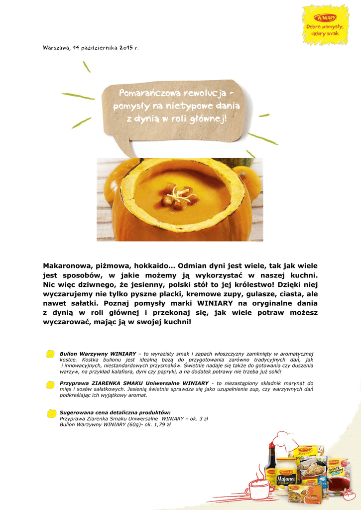 Warszawa, 14 października 2015 r. Pomarańczowa rewolucja pomysły na nietypowe dania z dynią w roli głównej! Makaronowa, piżmowa, hokkaido… Odmian dyni jest wiele, tak jak wiele jest sposobów, w jakie możemy ją wykorzystać w naszej kuchni. Nic więc dziwnego, że jesienny, polski stół to jej królestwo! Dzięki niej wyczarujemy nie tylko pyszne placki, kremowe zupy, gulasze, ciasta, ale nawet sałatki. Poznaj pomysły marki WINIARY na oryginalne dania z dynią w roli głównej i przekonaj się, jak wiele potraw możesz wyczarować, mając ją w swojej kuchni! Bulion Warzywny WINIARY – to wyrazisty smak i zapach włoszczyzny zamknięty w aromatycznej kostce. Kostka bulionu jest idealną bazą do przygotowania zarówno tradycyjnych dań, jak i innowacyjnych, niestandardowych przysmaków. Świetnie nadaje się także do gotowania czy duszenia warzyw, na przykład kalafiora, dyni czy papryki, a na dodatek potrawy nie trzeba już solić! Przyprawa ZIARENKA SMAKU Uniwersalne WINIARY - to niezastąpiony składnik marynat do mięs i sosów sałatkowych. Jesienią świetnie sprawdza się jako uzupełnienie zup, czy warzywnych dań podkreślając ich wyjątkowy aromat. Sugerowana cena detaliczna produktów: Przyprawa Ziarenka Smaku Uniwersalne WINIARY – ok. 3 zł Bulion Warzywny WINIARY (60g)- ok. 1,79 zł Wyczekiwany sezon na dynie nareszcie się rozpoczął. Te bogate w witaminy warzywa przez cały październik kuszą nie tylko delikatnie słodkim smakiem, ale także intensywnym kolorem. Pamiętajmy, że dynia jest przede wszystkim źródłem B-karotenu i potasu, a do tego ma naprawdę niewiele kalorii. Możemy więc zajadać się nią bez wyrzutów sumienia! Sprawmy, by dynia królowała na naszych stołach dłużej niż jedynie przy okazji Halloween. Wypróbujmy nowe, zaskakujące wykorzystanie tej pomarańczowej bomby witaminowej z produktami marki WINIARY! Zupa krem z dyni to jedna z najpopularniejszych wariacji kremowych i gęstych zup. Proponujemy jej przyrządzenie w nieco odmienionej wersji z dodatkiem imbiru, Przyprawy w płynie MAGGI, prażonych orzechów laskowych oraz wiórek kokosowych. Wystarczy pokrojoną w dużą kostkę dynię i marchewkę wymieszać w misce z MAGGI, łyżką oliwy i czosnkiem. Następnie w rozgrzanym do 200°C piekarniku upiec warzywa do miękkości. W międzyczasie podprażyć orzechy i wiórki kokosowe na suchej patelni. Później upieczone warzywa przełożyć do garnka i zalać 2 litrami wrzątku i gotować przez około 20 minut. Po tym czasie zmiksować całość blenderem, doprawić imbirem, pieprzem oraz Przyprawą w płynie MAGGI. Tak przygotowaną zupę podajemy z posiekaną natką pietruszki, pokruszonymi orzechami, szczyptą wiórków kokosowych i odrobiną oliwy, która nada dyniowej zupie aksamitną konsystencję. Ostrości dodaje oczywiście imbir – jeżeli przepadamy za wyrazistymi i aromatycznymi daniami, zetrzyjmy więcej świeżego imbiru do zupy. Smacznego! Dynia to jednak nie tylko zupa krem. Z tego pysznego warzywa możemy wyczarować znacznie więcej różnorodnych dań! Przygotujmy na przykład odświeżoną wersję makaronu z warzywami i przyrządźmy go z dynią i dodatkiem grzybów. Takie danie z pewnością wpisze się w nasze sezonowe menu! Możemy przyrządzić je z borowikami, podgrzybkami albo kurkami – w zależności od tego, na co mamy ochotę. Dynię podsmażamy ok. 10 minut z zeszkloną wcześniej cebulą, czosnkiem oraz kostką Bulionu warzywnego WINIARY. Jeśli potrzeba, dolewamy wody. Następnie dodajemy pokrojone grzyby i świeży tymianek. Dyniowo-grzybowy sos doprawiamy słodką śmietanką i podajemy z ugotowanym al dente makaronem tagliatelle. Danie posypujemy rozmarynem, tartym parmezanem i gotowe! Wystarczy już tylko zanurzyć widelec w makaronie, aby rozkoszować się wyśmienitą, jesienną potrawą. Na pyszną, dyniową przekąskę polecamy natomiast wyjątkową pastę z dyni z dodatkiem ciecierzycy i pasty sezamowej tahini. Aby ją przygotować, wystarczy obraną i pokrojoną, w kostkę dynię ułożyć na blaszce do pieczenia wyłożonej pergaminem, dodać czosnek, i skropić oliwą oraz posypać szczyptą Przyprawy Ziarenka Smaku Uniwersalne WINIARY, a następnie zapiec do miękkości w nagrzanym do 200 stopni piekarniku. Gotową i ostudzoną dynię miksujemy w blenderze na gładką masę z odsączoną i przepłukaną ciecierzycą z puszki, pastą sezamową, łyżką oliwy i czosnkiem. Jeżeli masa jest za gęsta, wystarczy dodać trochę zimnej wody mineralnej, aby uzyskać pożądaną konsystencję. Pastę jeszcze tylko doprawiamy do smaku solą, pieprzem, papryką i sokiem z cytryny i gotowe! Pajdy chleba z pastą dyniową z ciecierzycą to świetny duet nie tylko na śniadanie! Potrzebujesz więcej inspiracji na oryginalne dania z dynią w roli głównej? Wejdź na www.winiary.pl i zaskocz swoich bliskich pyszną dyniową ucztą! ## WINIARY to marka, która od lat jest gwarancją sukcesu w kuchni. Jej produkty inspirują współczesne panie domu do przygotowywania najsmaczniejszych potraw dla całej rodziny. Zupy, majonezy, buliony, sosy, Pomysły na…, dania instant, przyprawy, galaretki, kisiele czy budynie – w sumie ponad 230 różnych produktów kulinarnych WINIARY, które pozwalają w szybki i prosty sposób przyrządzić domowy posiłek. Na stronie www.winiary.pl panie domu znajdą przepisy oraz inspiracje kulinarne na każdy dzień. Produkty marki WINIARY rokrocznie zdobywają liczne nagrody przyznawane przez konsumentów i detalistów. W 2011 oraz 2012 roku redakcja „Rzeczpospolitej” przyznała marce WINIARY prestiżowy tytuł Najmocniejszej Marki Roku. Kontakt do biura prasowego marki WINIARY: Kamila Dębniak kom. +48 508 988 861 email: [email protected] Edyta Szyszło kom. +48 519 429 226 email: [email protected]