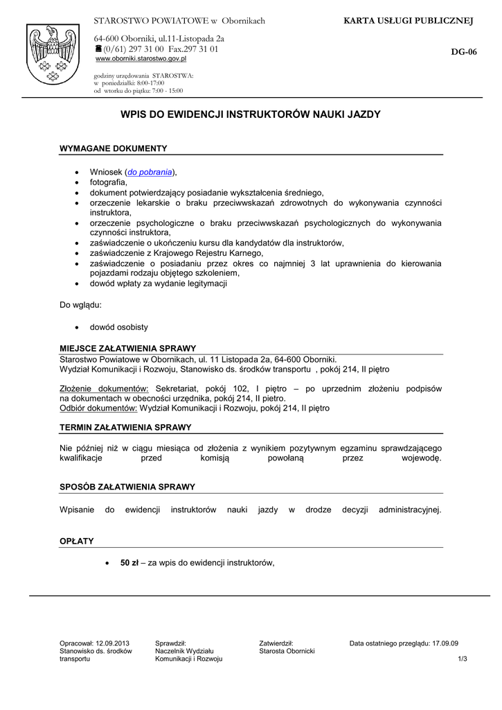 STAROSTWO POWIATOWE w Obornikach KARTA USŁUGI PUBLICZNEJ 64-600 Oborniki, ul.11-Listopada 2a (0/61) 297 31 00 Fax.297 31 01 DG-06 www.oborniki.starostwo.gov.pl godziny urzędowania STAROSTWA: w poniedziałki: 8:00-17:00 od wtorku do piątku: 7:00 - 15:00 WPIS DO EWIDENCJI INSTRUKTORÓW NAUKI JAZDY WYMAGANE DOKUMENTY Wniosek (do pobrania), fotografia, dokument potwierdzający posiadanie wykształcenia średniego, orzeczenie lekarskie o braku przeciwwskazań zdrowotnych do wykonywania czynności instruktora, orzeczenie psychologiczne o braku przeciwwskazań psychologicznych do wykonywania czynności instruktora, zaświadczenie o ukończeniu kursu dla kandydatów dla instruktorów, zaświadczenie z Krajowego Rejestru Karnego, zaświadczenie o posiadaniu przez okres co najmniej 3 lat uprawnienia do kierowania pojazdami rodzaju objętego szkoleniem, dowód wpłaty za wydanie legitymacji Do wglądu: dowód osobisty MIEJSCE ZAŁATWIENIA SPRAWY Starostwo Powiatowe w Obornikach, ul. 11 Listopada 2a, 64-600 Oborniki. Wydział Komunikacji i Rozwoju, Stanowisko ds. środków transportu , pokój 214, II piętro Złożenie dokumentów: Sekretariat, pokój 102, I piętro – po uprzednim złożeniu podpisów na dokumentach w obecności urzędnika, pokój 214, II pietro. Odbiór dokumentów: Wydział Komunikacji i Rozwoju, pokój 214, II piętro TERMIN ZAŁATWIENIA SPRAWY Nie później niż w ciągu miesiąca od złożenia z wynikiem pozytywnym egzaminu sprawdzającego kwalifikacje przed komisją powołaną przez wojewodę. SPOSÓB ZAŁATWIENIA SPRAWY Wpisanie do ewidencji instruktorów nauki jazdy w drodze decyzji administracyjnej. OPŁATY 50 zł – za wpis do ewidencji instruktorów, Opracował: 12.09.2013 Stanowisko ds. środków transportu Sprawdził: Naczelnik Wydziału Komunikacji i Rozwoju Zatwierdził: Starosta Obornicki Data ostatniego przeglądu: 17.09.09 1/3 STAROSTWO POWIATOWE w Obornikach KARTA USŁUGI PUBLICZNEJ 64-600 Oborniki, ul.11-Listopada 2a (0/61) 297 31 00 Fax.297 31 01 DG-06 www.oborniki.starostwo.gov.pl godziny urzędowania STAROSTWA: w poniedziałki: 8:00-17:00 od wtorku do piątku: 7:00 - 15:00 Opłatę należy uiścić na konto: Starostwa Powiatowego w Obornikach, konto w PKO BP O/Oborniki NR: 40 1020 4128 0000 1802 0006 9492 Opłatę można uiścić w Agencji PKO (parter, pok. 025) lub poza urzędem, w dowolnej placówce, w której istnieje możliwość dokonania przelewu TRYB ODWOŁAWCZY Odwołanie, od decyzji odmawiającej wydania zaświadczenia potwierdzającego wpis do rejestru, wnosi się do Samorządowego Kolegium Odwoławczego w Pile za pośrednictwem Starosty Obornickiego w terminie 14 dni od dnia doręczenia decyzji stronie. DODATKOWE INFORMACJE Instruktorem jest osoba , która: 1. posiada co najmniej wykształcenie średnie; 2. posiada prawo jazdy: a) kategorii A co najmniej przez okres 3 lat - dotyczy instruktorów osób ubiegających się o uzyskanie uprawnienia do kierowania pojazdami, którzy uzyskują uprawnienia instruktora wyłącznie w zakresie prawa jazdy kategorii A, b) kategorii B co najmniej przez okres 3 lat - dotyczy instruktorów osób ubiegających się o uzyskanie uprawnienia do kierowania pojazdami ubiegających się o uprawnienia do prowadzenia szkolenia w zakresie prawa jazdy kategorii B, c) kategorii B+E, C1, C1+E, C, C+E, D1, D1+E, D lub D+E odpowiednio do zakresu prowadzonych zajęć co najmniej przez okres roku oraz co najmniej 3-letnie doświadczenie w prowadzeniu szkolenia osób ubiegających się o uprawnienia do kierowania pojazdami w zakresie prawa jazdy kategorii B dotyczy instruktorów osób ubiegających się o uzyskanie uprawnienia do kierowania pojazdami rozszerzających uprawnienia do prowadzenia szkolenia o jedną z wymienionych kategorii; 1. posiada prawo jazdy kategorii B co najmniej przez okres 3 lat oraz pozwolenie na kierowanie tramwajem - dotyczy instruktorów osób ubiegających się o uzyskanie uprawnienia do kierowania tramwajem; 2. posiada ważne orzeczenie lekarskie o braku przeciwwskazań zdrowotnych do wykonywania czynności instruktora; 3. posiada ważne orzeczenie psychologiczne o braku przeciwwskazań psychologicznych do wykonywania czynności instruktora, 4. ukończyła z wynikiem pozytywnym kurs dla kandydatów na instruktorów i posiada zaświadczenie o jego ukończeniu - dotyczy instruktorów osób ubiegających się o uzyskanie uprawnienia do kierowania pojazdami silnikowymi; 5. złożyła z wynikiem pozytywnym egzamin sprawdzający kwalifikacje przed komisją powołaną przez wojewodę; Opracował: 12.09.2013 Stanowisko ds. środków transportu Sprawdził: Naczelnik Wydziału Komunikacji i Rozwoju Zatwierdził: Starosta Obornicki Data ostatniego przeglądu: 17.09.09 2/3 STAROSTWO POWIATOWE w Obornikach KARTA USŁUGI PUBLICZNEJ 64-600 Oborniki, ul.11-Listopada 2a (0/61) 297 31 00 Fax.297 31 01 DG-06 www.oborniki.starostwo.gov.pl godziny urzędowania STAROSTWA: w poniedziałki: 8:00-17:00 od wtorku do piątku: 7:00 - 15:00 6. nie była skazana prawomocnym wyrokiem sądu za: a) przestępstwo przeciwko bezpieczeństwu w komunikacji, b) przestępstwo popełnione w celu osiągnięcia korzyści majątkowej lub osobistej, c) przestępstwo przeciwko wiarygodności dokumentów, d) prowadzenie pojazdu w stanie po użyciu alkoholu lub w stanie po użyciu innego podobnie działającego środka, e) przestępstwo umyślne przeciwko życiu i zdrowiu, f) przestępstwo przeciwko wolności seksualnej i obyczajności; 7. jest wpisana do ewidencji instruktorów. Właściwość miejscowa: organem właściwym do wydania legitymacji instruktora nauki jazdy jest starosta właściwy ze względu na miejsce zamieszkania instruktora PODSTAWA PRAWNA Ustawa z dnia 5 stycznia 2011r. o kierujących pojazdami (Dz. U. z 2011r., Nr 30, poz. 151 ze zm.) Rozporządzenie Ministra Transportu, Budownictwa i Gospodarki Morskiej z dnia 16 stycznia 2013r. w sprawie uzyskiwania przez instruktorów i wykładowców, opłat oraz wzorów dokumentów stoso