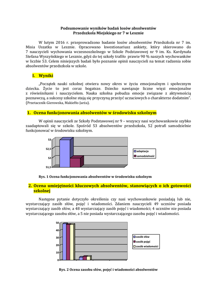 Podsumowanie wyników badań losów absolwentów Przedszkola Miejskiego nr 7 w Lesznie W lutym 2016 r. przeprowadzono badanie losów absolwentów Przedszkola nr 7 im. Misia Uszatka w Lesznie. Opracowano kwestionariusz ankiety, który skierowano do 7 nauczycieli wychowania wczesnoszkolnego w Szkole Podstawowej nr 9 im. Ks. Kardynała Stefana Wyszyńskiego w Lesznie, gdyż do tej szkoły trafiło prawie 90 % naszych wychowanków w liczbie 53. Celem niniejszych badań było poznanie opinii nauczycieli na temat radzenia sobie absolwentów przedszkola w szkole. I. Wyniki „Początek nauki szkolnej otwiera nowy okres w życiu emocjonalnym i społecznym dziecka. Życie to jest coraz bogatsze. Dziecko nawiązuje liczne więzi emocjonalne z rówieśnikami i nauczycielem. Nauka szkolna pobudza emocje związane z aktywnością poznawczą, a sukcesy szkolne stają się przyczyną przeżyć uczuciowych o charakterze dodatnim”. (Przetacznik-Gierowska, Makiełło-Jarża). 1. Ocena funkcjonowania absolwentów w środowisku szkolnym W opinii nauczycieli ze Szkoły Podstawowej nr 9 – wszyscy nasi wychowankowie szybko zaadaptowali się w szkole. Spośród 53 absolwentów przedszkola, 52 potrafi samodzielnie funkcjonować w środowisku szkolnym. 53 52,5 adaptacja samodzielność 52 51,5 Rys. 1 Ocena funkcjonowania absolwentów w środowisku szkolnym 2. Ocena umiejętności kluczowych absolwentów, stanowiących o ich gotowości szkolnej Następne pytanie dotyczyło określenia czy nasi wychowankowie posiadają lub nie, wystarczający zasób słów, pojęć i wiadomości. Zdaniem nauczycieli 49 uczniów posiada wystarczający zasób słów, a 48 wystarczający zasób pojęć i wiadomości; 4 uczniów nie posiada wystarczającego zasobu słów, a 5 nie posiada wystarczającego zasobu pojęć i wiadomości. 50 40 30 zasób słów zasób pojęć 20 zasób wiadomości 10 0 Rys. 2 Ocena zasobu słów, pojęć i wiadomości absolwentów W opinii nauczycieli ze Szkoły Podstawowej nr 9 dzieci: % Umiejętność kluczowa -podejmują samodzielnie działania i wykazują aktywność 58,8 -przestrzegają norm współżycia w grupie 60,3 -potrafią zaprezentować swoje umiejętności z różnych dziedzin 50,9 -są koleżeńscy 98,1 -potrafią pokonywać trudności i przyjmować porażki 47,1 -potrafią słuchać i wypowiadać się w różnych sytuacjach 60,3 -potrafią doprowadzić pracę do końca 84,9 -potrafią korzystać z posiadanej wiedzy 60,3 -potrafią szanować prawa innych 98,1 Tabela nr 1. Zasób umiejętności kluczowych absolwentów Jak wynika z tabeli, nauczyciele SP 9 najwyżej oceniają koleżeńskość uczniów i to, że potrafią oni szanować prawa innych (98,1%). Doceniają, że dzieci są wytrwałe i potrafią doprowadzić pracę do końca (84,9%). Dobrze oceniają umiejętność przestrzegania norm współżycia w grupie (60,3%), samodzielność i aktywność uczniów (58,8%), a także umiejętność korzystania ze swojej wiedzy (60,3%) czy umiejętność słuchania i wypowiadania się w różnych sytuacjach (60,3%). Najniżej oceniono kompetencje dzieci w zakresie prezentowania swoich umiejętności z różnych dziedzin (50,9%) oraz umiejętność pokonywania trudności i przyjmowania porażki (47,1%) Następnie nauczyciele SP 9 określali czy dzieci są wystarczająco sprawne manualnie, plastycznie, muzycznie i fizycznie: Sprawność % manualna 75,5 plastyczna muzyczna fizyczna 62,3 96,2 98,1 Tabela nr 2. Zasób sprawności absolwentów Najwyżej oceniona została sprawność fizyczna, co stanowi istotny czynnik gotowości do podjęcia nauki szkolnej i wpływa na takie jej elementy, jak np. wytrwałość, stopień męczliwości czy koncentrację na zadaniu. Równie wysoko oceniono sprawność muzyczną dzieci. Nauczyciele stwierdzili, że w mniejszym stopniu dzieci są sprawne manualnie czy plastycznie. 3. Obszary, które stanowią „mocne strony” naszych absolwentów Jako niewątpliwie „mocną stronę” naszych absolwentów ankietowani nauczyciele wskazali kompetencje społeczne w zakresie adaptacji do zespołu klasowego, chęci współpracy z rówieśnikami i dorosłymi, pozytywnego nastawienia do działania i otoczenia. Ponadto podkreślili, że dzieci są otwarte, szczere, pracowite, punktualne, potrafią odpowiednio zachować się w konkretnych sytuacjach, mają szacunek do innych i kulturę osobistą. Wskazali także na bardzo dobry poziom umysłowy i dobry poziom rozwoju fizycznego. Z zakresu edukacji językowej jako mocną stronę wskazano umiejętność wypowiadania się na swobodne tematy oraz podział wyrazów na sylaby. 4. Obszary, które sprawiają dzieciom trudności W pięciu z siedmiu analizowanych klas pojawiły się dzieci z trudnościami. Jako „słabe strony„ dzieci nauczyciele wskazali przede wszystkim obszar rozwoju emocjonalnego: - nieumiejętność dostosowania się do zasad kodeksu klasowego, - skarżenie na kolegów, - nieumiejętność pogodzenia się z przegraną, - niewypełnianie poleceń, - małą samodzielność. Z zakresu rozwoju procesów poznawczych wskazali na pojawiające się problemy z koncentracją uwagi, brak umiejętności słuchania ze zrozumieniem, kojarzenia. Istotnym problemem są również wady wymowy, które wpływają na zaburzenie procesu analizy słuchowej wyrazów. Część dzieci ma natomiast problemy ze sprawnością manualną – słabo wycinają. II. Podsumowanie i wnioski Informacje o losach absolwentów przedszkola potwierdzają dobry poziom przygotowania dzieci do podjęcia nauki w szkole. W opinii nauczycieli edukacji wczesnoszkolnej ponad 90% dzieci posiada wystarczający zasób słów, pojęć i wiadomości. Ponad 90% dzieci jest też wystarczająco sprawna fizycznie, muzycznie i manualnie. Wysokie kompetencje społeczne naszych wychowanków wpłynęły z pewnością pozytywnie na proces adaptacji do warunków szkolnych. Mimo jednak, że wszystkie dzieci osiągnęły dojrzałość szkolną w badanych obszarach, to zauważon