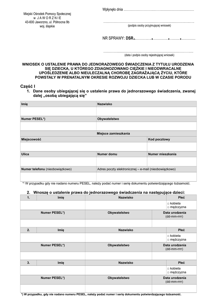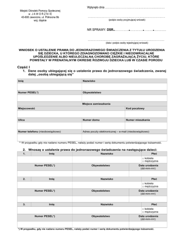 Wpłynęło dnia ..………………………….….……..................…….................... Miejski Ośrodek Pomocy Społecznej w JAWORZNIE 43-600 Jaworzno, ul. Północna 9b woj. śląskie …………………………………………….........…….…................………..…....….. (podpis osoby przyjmującej wniosek) NR SPRAWY: DSR ..…………..…..…...........…...….............................. ……………...................…...........…….….......................................…………...... (data i podpis osoby rejestrującej wniosek) WNIOSEK O USTALENIE PRAWA DO JEDNORAZOWEGO ŚWIADCZENIA Z TYTUŁU URODZENIA SIĘ DZIECKA, U KTÓREGO ZDIAGNOZOWANO CIĘŻKIE I NIEODWRACALNE UPOŚLEDZENIE ALBO NIEULECZALNĄ CHOROBĘ ZAGRAŻAJĄCĄ ŻYCIU, KTÓRE POWSTAŁY W PRENATALNYM OKRESIE ROZWOJU DZIECKA LUB W CZASIE PORODU Część I 1. Dane osoby ubiegającej się o ustalenie prawa do jednorazowego świadczenia, zwanej dalej „osobą ubiegającą się” Imię Nazwisko Numer PESEL*) Obywatelstwo Miejsce zamieszkania Miejscowość Kod pocztowy Ulica Numer domu Numer mieszkania Numer telefonu (nieobowiązkowo) Adres poczty elektronicznej – e-mail (nieobowiązkowo) *) W przypadku gdy nie nadano numeru PESEL, należy podać numer i serię dokumentu potwierdzającego tożsamość. 2. Wnoszę o ustalenie prawa do jednorazowego świadczenia na następujące dzieci: 1. Imię Nazwisko Płeć □ kobieta □ mężczyzna Numer PESEL*) 2. Imię Obywatelstwo Nazwisko Data urodzenia (dd-mm-rrrr) Płeć □ kobieta □ mężczyzna Numer PESEL*) 3. Imię Obywatelstwo Nazwisko Data urodzenia (dd-mm-rrrr) Płeć □ kobieta □ mężczyzna Numer PESEL*) Obywatelstwo Data urodzenia (dd-mm-rrrr) *) W przypadku, gdy nie nadano numeru PESEL, należy podać numer i serię dokumentu potwierdzającego tożsamość. Część II Oświadczenie dotyczące ustalenia prawa do jednorazowego świadczenia Oświadczam, że: zapoznałam/zapoznałem się z warunkami uprawniającymi do jednorazowego świadczenia, jestem świadczeniobiorcą świadczeń opieki zdrowotnej lub osobą uprawnioną do świadczeń opieki zdrowotnej na podstawie przepisów o koordynacji - w rozumieniu przepisów ustawy z dnia 27 sierpnia 2004r. o świadczeniach opieki zdrowotnej finansowanych ze środków publicznych (Dz. U. z 2016r. poz. 1793, 1807, 1860, 1948, 2138 i 2173). na dziecko/dzieci, na które ubiegam się o jednorazowe świadczenie na dziecko, nie jest pobierane w tej lub innej instytucji jednorazowe świadczenie, dziecko/dzieci, na które ubiegam się o jednorazowe świadczenie nie zostało/nie zostały umieszczone w pieczy zastępczej ani w domu pomocy społecznej zapewniającym nieodpłatne pełne utrzymanie, członkowi rodziny nie przysługuje na dziecko jednorazowe świadczenie lub świadczenie o charakterze podobnym do jednorazowego świadczenia za granicą, chyba że przepisy o koordynacji systemów zabezpieczenia społecznego lub dwustronne umowy międzynarodowe o zabezpieczeniu społecznym stanowią inaczej, □ nie przebywam ani członek mojej rodziny nie przebywa poza granicami Rzeczypospolitej Polskiej*) □ w państwie, w którym mają zastosowanie przepisy o koordynacji systemów zabezpieczenia społecznego**), przebywam lub członek mojej rodziny przebywa poza granicami Rzeczypospolitej Polskiej*) w państwie, w którym mają zastosowanie przepisy o koordynacji systemów zabezpieczenia społecznego**) (w przypadku zaznaczenia wypełnić poniższe pola): 1. …………………………………………………………………………………………………………………..………………………. ………………………………………………………………………………………………………………………………….…….......... (imię i nazwisko oraz numer PESEL członka/członków rodziny przebywających za granicą) *) Nie dotyczy wyjazdu lub pobytu turystycznego, leczniczego lub związanego z podjęciem przez dziecko kształcenia poza granicami Rzeczypospolitej Polskiej. **) Przepisy o koordynacji systemów zabezpieczenia społecznego mają zastosowanie na terenie: Austrii, Belgii, Chorwacji, Danii, Finlandii, Francji, Grecji, Hiszpanii, Holandii, Irlandii, Luksemburga, Niemiec, Portugalii, Szwecji, Włoch, Wielkiej Brytanii, Cypru, Czech, Estonii, Litwy, Łotwy, Malty, Polski, Słowacji, Słowenii, Węgier, Bułgarii, Rumunii, Norwegii, Islandii, Liechtensteinu, Szwajcarii. Proszę o wypłatę jednorazowego świadczenia na następujący numer rachunku bankowego/ w spółdzielczej kasie oszczędnościowo-kredytowej: w banku/spółdzielczej kasie oszczędnościowo-kredytowej ….................................................................……….. (nazwa banku/spółdzielczej kasy oszczędnościowo-kredytowej) Właścicielem rachunku jest: ................................................................................................................................................................................................ (imię, nazwisko i adres właściciela rachunku) natomiast współwłaścicielem / osobą upoważnioną do rachunku* jest: ................................................................................................................................................................................................ (imię, nazwisko i adres współwłaściciela / osoby upoważnionej do rachunku) *niepotrzebne skreślić Do wniosku dołączam następujące dokumenty: 1) □ zaświadczenie potwierdzające ciężkie i nieodwracalne upośledzenie albo nieuleczalną chorobę zagrażającą życiu, które powstały w prenatalnym okresie rozwoju dziecka lub w czasie porodu, wystawione przez lekarza ubezpieczenia zdrowotnego, w rozumieniu ustawy z dnia 27 sierpnia 2004 r. o świadczeniach opieki zdrowotnej finansowanych ze środków publicznych, posiadającego specjalizację II stopnia lub tytuł specjal