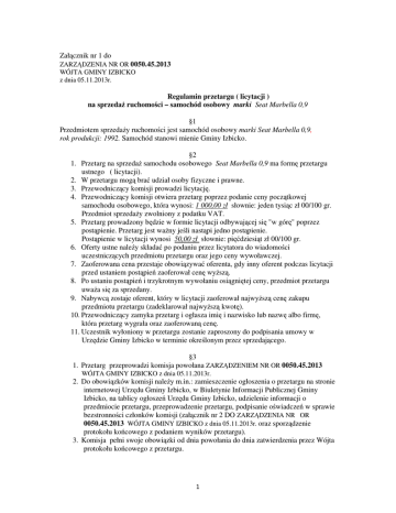 Zał cznik nr 1 do ZARZ DZENIA NR OR 0050.45.2013 WÓJTA GMINY IZBICKO z dnia 05.11.2013r. Regulamin przetargu ( licytacji ) na sprzeda ruchomo ci – samochód osobowy marki Seat Marbella 0,9 §1 Przedmiotem sprzeda y ruchomo ci jest samochód osobowy marki Seat Marbella 0,9, rok produkcji: 1992. Samochód stanowi mienie Gminy Izbicko. §2 1. Przetarg na sprzeda samochodu osobowego Seat Marbella 0,9 ma form przetargu ustnego ( licytacji). 2. W przetargu mog bra udział osoby fizyczne i prawne. 3. Przewodnicz cy komisji prowadzi licytacj . 4. Przewodnicz cy komisji otwiera przetarg poprzez podanie ceny pocz tkowej samochodu osobowego, która wynosi: 1 000,00 zł słownie: jeden tysi c zł 00/100 gr. Przedmiot sprzeda y zwolniony z podatku VAT. 5. Przetarg prowadzony b dzie w formie licytacji odbywaj cej si "w gór " poprzez post pienie. Przetarg jest wa ny je li nast pi jedno post pienie. Post pienie w licytacji wynosi 50,00 zł słownie: pi dziesi t zł 00/100 gr. 6. Oferty ustne nale y składa po podaniu przez licytatora do wiadomo ci uczestnicz cych przedmiotu przetargu oraz jego ceny wywoławczej. 7. Zaoferowana cena przestaje obowi zywa oferenta, gdy inny oferent podczas licytacji przed ustaniem post pie zaoferował cen wy sz . 8. Po ustaniu post pie i trzykrotnym wywołaniu osi gni tej ceny, przedmiot przetargu uwa a si za sprzedany. 9. Nabywc zostaje oferent, który w licytacji zaoferował najwy sz cen zakupu przedmiotu przetargu (zadeklarował najwy sz kwot ). 10. Przewodnicz cy zamyka przetarg i ogłasza imi i nazwisko lub nazw albo firm , która przetarg wygrała oraz zaoferowan cen . 11. Uczestnik wyłoniony w przetargu zostanie zaproszony do podpisania umowy w Urz dzie Gminy Izbicko w terminie okre lonym przez sprzedaj cego. §3 1. Przetarg przeprowadzi komisja powołana ZARZ DZENIEM NR OR 0050.45.2013 WÓJTA GMINY IZBICKO z dnia 05.11.2013r. 2. Do obowi zków komisji nale y m.in.: zamieszczenie ogłoszenia o przetargu na stronie internetowej Urz du Gminy Izbicko, w Biuletynie Informacji Publicznej Gminy Izbicko, na tablicy ogłosze Urz du Gminy Izbicko, udzielenie informacji o przedmiocie przetargu, przeprowadzenie przetargu, podpisanie o wiadcze w sprawie bezstronno ci członków komisji (zał cznik nr 2 DO ZARZ DZENIA NR OR 0050.45.2013 WÓJTA GMINY IZBICKO z dnia 05.11.2013r. oraz sporz dzenie protokołu ko cowego z podaniem wyników przetargu). 3. Komisja pełni swoje obowi zki od dnia powołania do dnia zatwierdzenia przez Wójta protokołu ko cowego z przetargu. 4. W przetargu ustnym ( licytacji ) nie mog uczestniczy osoby wchodz ce w skład komisji przetargowej oraz ich mał onkowie, dzieci, rodzice i rodze stwo. §4 1. Uczestnik przetargu mo e działa przez pełnomocnika. W takim przypadku powinien przedstawi oryginał pełnomocnictwa §5 Wójt Gminy Izbicko zastrzega sobie prawo uniewa nienia lub odwołania przetargu bez podania przyczyny. Niniejszy regulamin dost pny jest na stronie internetowej www.bip.izbicko.pl, www.izbicko.pl oraz na tablicy ogłosze w Urz dzie Gminy Izbicko.