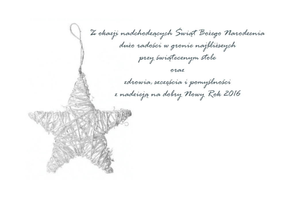 Z okazji nadchodzących Świąt Bożego Narodzenia dużo radości w gronie najbliższych przy świątecznym stole oraz zdrowia, szczęścia i pomyślności z nadzieją na dobry Nowy Rok 2016
