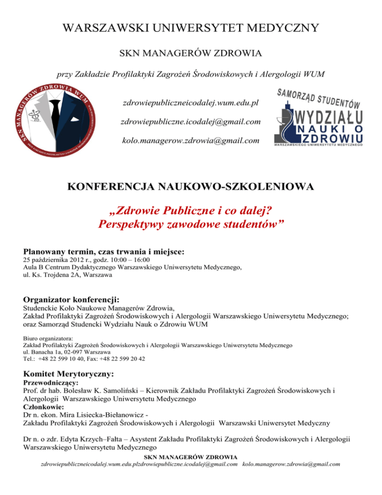 WARSZAWSKI UNIWERSYTET MEDYCZNY SKN MANAGERÓW ZDROWIA przy Zakładzie Profilaktyki Zagrożeń Środowiskowych i Alergologii WUM zdrowiepubliczneicodalej.wum.edu.pl [email protected] [email protected] KONFERENCJA NAUKOWO-SZKOLENIOWA „Zdrowie Publiczne i co dalej? Perspektywy zawodowe studentów” Planowany termin, czas trwania i miejsce: 25 października 2012 r., godz. 10:00 – 16:00 Aula B Centrum Dydaktycznego Warszawskiego Uniwersytetu Medycznego, ul. Ks. Trojdena 2A, Warszawa Organizator konferencji: Studenckie Koło Naukowe Managerów Zdrowia, Zakład Profilaktyki Zagrożeń Środowiskowych i Alergologii Warszawskiego Uniwersytetu Medycznego; oraz Samorząd Studencki Wydziału Nauk o Zdrowiu WUM Biuro organizatora: Zakład Profilaktyki Zagrożeń Środowiskowych i Alergologii Warszawskiego Uniwersytetu Medycznego ul. Banacha 1a, 02-097 Warszawa Tel.: +48 22 599 10 40, Fax: +48 22 599 20 42 Komitet Merytoryczny: Przewodniczący: Prof. dr hab. Bolesław K. Samoliński – Kierownik Zakładu Profilaktyki Zagrożeń Środowiskowych i Alergologii Warszawskiego Uniwersytetu Medycznego Członkowie: Dr n. ekon. Mira Lisiecka-Biełanowicz Zakładu Profilaktyki Zagrożeń Środowiskowych i Alergologii Warszawski Uniwersytet Medyczny Dr n. o zdr. Edyta Krzych–Fałta – Asystent Zakładu Profilaktyki Zagrożeń Środowiskowych i Alergologii Warszawskiego Uniwersytetu Medycznego SKN MANAGERÓW ZDROWIA zdrowiepubliczneicodalej.wum.edu.plzdrowiepubliczne.icodalej@gmail.com [email protected] WARSZAWSKI UNIWERSYTET MEDYCZNY konferencja naukowo-szkoleniowa „Zdrowie Publiczne i co dalej – perspektywy zawodowe studentów” Komitet Organizacyjny: Przewodniczący: Aleksander Zarzeka – Prezes SKN Managerów Zdrowia Sekretarz: Joanna Bogusz Członkowie: Emilia Gawlińska, Magdalena Mińko, Dominika Modzelewska Łukasz Samoliński, Aneta Mela, Katarzyna Żokowska, Martyna Giedrojć Beata Tyszko Klaudia Sieńska, Monika Bielińska, Radosław Wiśniewski, Grzegorz Stachacz Monika Kurkowska Zasięg konferencji: Ogólnopolska, z udziałem studentów z innych uczelni medycznych w Polsce, na których istnieje możliwość studiowania kierunku Zdrowie Publiczne oraz przedstawicieli przyszłych pracodawców oraz osób i instytucji związanych ze zdrowiem publicznym. Język konferencji: Polski Przewidywana liczba uczestników ogółem: 400 osób Cel konferencji: Celem organizowanej konferencji jest przybliżenie kierunku Zdrowie Publiczne oraz jego studentów i absolwentów wśród przyszłych pracodawców poprzez: zaprezentowanie wieloaspektowego kształcenia na kierunku zdrowie publiczne, przedstawienie sylwetki studenta oraz absolwenta, przedstawienie perspektyw na rynku pracy, przedstawienie oczekiwań pracodawców z zakresu nauk o zdrowia w stosunku to potencjalnych pracowników (absolwentów zdrowia publicznego) informacje na temat zmian kierunku rozwoju nauk związanych ze zdrowiem publicznym. SKN MANAGERÓW ZDROWIA zdrowiepubliczneicodalej.wum.edu.plzdrowiepubliczne.icodalej@gmail.com [email protected] WARSZAWSKI UNIWERSYTET MEDYCZNY konferencja naukowo-szkoleniowa „Zdrowie Publiczne i co dalej – perspektywy zawodowe studentów” Ramowy program konferencji: 9:00 rejestracja uczestników 10:00 rozpoczęcie konferencji, powitanie gości Sesja I – przedstawienie kierunku zdrowie publiczne, sylwetki studenta i absolwenta 10:05 Prof. Bolesław Samoliński – Kierownik Zakładu Profilaktyki Zagrożeń Środowiskowych i Alergologii WNoZ WUM – „Interdyscyplinarność i wieloaspektowość kierunku zdrowie publiczne” 10:20 Igor Radziewicz – Winnicki - Podsekretarz Stanu (w potwierdzeniu) 10:35 10:50 11:05 11:20 11:35 Radosław Wiśniewski – student Warszawskiego Uniwersytetu Medycznego – „Aktywność studentów zdrowia publicznego oraz ich perspektywy i oczekiwania zawodowe” Jakub Sokolnicki – kierownik biura karier WUM – prezentacja działalności biura karier w kontekście zdrowia publicznego oraz programu śledzenia losów absolwentów. Dr n med. Maciej Piróg – doradca Prezydenta RP ds. zdrowia – „Ustawa o zdrowiu publicznym a nowe możliwości absolwentów” mgr Danuta Wawrzyniak-Dulińska – „Czy absolwent WUM jest interesującym kandydatem do zatrudnienie przez koncerny farmaceutyczne? Pytania i wątpliwości rekrutera." Debata 12:30 – 13:00 PRZERWA Sesja II – przedstawienie oczekiwań pracodawców względem kandydatów w obszarze zdrowia 13:00 Michał Borkowski - dyrektor departamentu zdrowia urzędu wojewódzkiego 13:15 Agnieszka Szydłowska – dyrektor centrum diagnostycznego LUXMED 13:30 Grzegorz Maciążka – Dyrektor Działu Badań Klinicznych GlaxoSmithKline 13:45 Dr n. med. Rafał Rdzany - Kierownik Działu Programów Zdrowotnych AOTM 14:00 Dr Krzysztof Grzyliński - Prezes Zarządu i Dyrektor Zarządzający GenRe Warsaw Sp. z o.o. 14:15 Przedstawiciel PZU (w potwierdzeniu) 14:30 Przedstawiciel Ernst&Young (w potwierdzeniu) 14:45 Anna Janczewska-Radwan – BCC (w potwierdzeniu) 15:00 Dr Grzegorz Juszczyk – podsumowanie konferencji SKN MANAGERÓW ZDROWIA zdrowiepubliczneicodalej.wum.edu.plzdrowiepubliczne.icodalej@gmail.com [email protected]