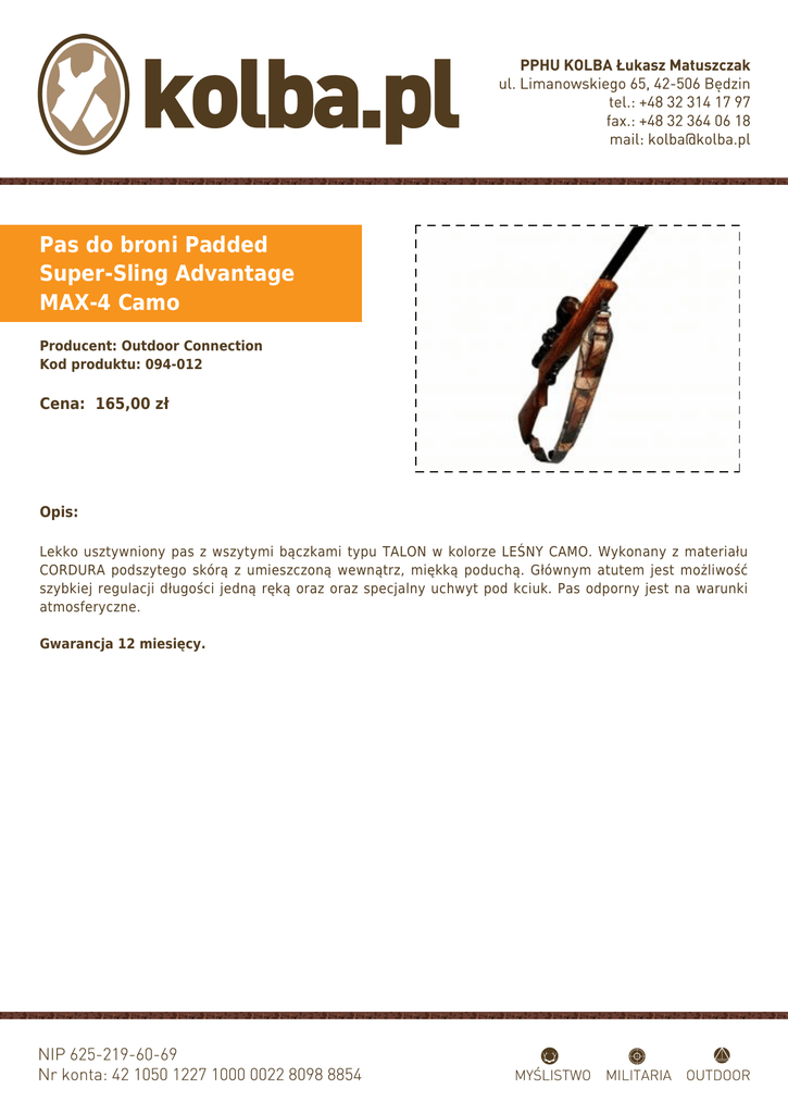 Pas do broni Padded Super-Sling Advantage MAX-4 Camo Producent: Outdoor Connection Kod produktu: 094-012 Cena: 165,00 zł Opis: Lekko usztywniony pas z wszytymi bączkami typu TALON w kolorze LEŚNY CAMO. Wykonany z materiału CORDURA podszytego skórą z umieszczoną wewnątrz, miękką poduchą. Głównym atutem jest możliwość szybkiej regulacji długości jedną ręką oraz oraz specjalny uchwyt pod kciuk. Pas odporny jest na warunki atmosferyczne. Gwarancja 12 miesięcy.