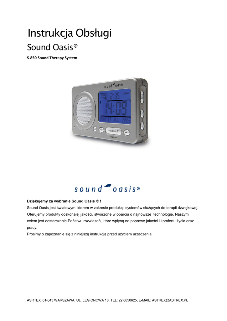 Instrukcja Obsługi Sound Oasis® S-850 Sound Therapy System Dziękujemy za wybranie Sound Oasis ® ! Sound Oasis jest światowym liderem w zakresie produkcji systemów służących do terapii dźwiękowej. Oferujemy produkty doskonałej jakości, stworzone w oparciu o najnowsze technologie. Naszym celem jest dostarczenie Państwu rozwiązań, które wpłyną na poprawę jakości i komfortu życia oraz pracy. Prosimy o zapoznanie się z niniejszą instrukcją przed użyciem urządzenia ASRTEX, 01-343 WARSZAWA, UL. LEGIONOWA 10, TEL: 22 6650625, E-MAIL: [email protected] Zasady użytkowania Aby uniknąć niebezpieczeństwa porażenia prądem elektrycznym zwróć szczególną uwagę aby przez obudowę nie dostała się do środka woda lub inne płyny. Nie rozkręcaj urządzenia. Nie włączaj urządzenia jeżeli przewód zasilający lub obudowa uległy uszkodzeniu. Urządzenie nie powinno być narażone na bezpośrednie działanie promieni słonecznych oraz źródeł ciepła takich jak grzejniki lub piece. Urządzenie powinno być podłączone do zasilana tylko przy pomocy zasilacza znajdującego się w zestawie. Do czyszczenia używaj miękkiej ściereczki, zwilżonej wodą lub wodą z mydłem. Następnie wytrzyj urządzenie do sucha. Nie używaj do czyszczenia rozpuszczalników lub detergentów. ASRTEX, 01-343 WARSZAWA, UL. LEGIONOWA 10, TEL: 22 6650625, E-MAIL: [email protected] INSTRUKCJA OBSŁUGI INSTRUKCJA OBSŁUGI Zasilanie S-850 jest zasilany przy pomocy baterii lub dołączonego uniwesalnego zasilacza sieciowego. Wymienne końcówki umożliwiają wykorzystanie generatora w wiekszosci krajów. Użycie baterii W celu zainstalowania baterii należy otworzyć pokrywę znajdującą się z tyłu urządzenia. Baterie należy włożyć zgodnie z rysunkiem. Następnie należy zamknąć pokrywę . Należy używać tylko baterii alkalicznych. Użycie zasilacza Po włączeniu zasilania zewnętrznego, generator nawet jeżeli zainstalowane zostały baterie, będzie wykorzystywał zasilanie zewnętrzne. W przypadku przerwy w zasilaniu zewnętrznym, system automatycznie przełączy się na zasilanie bateryjne. Należy używać tylko dołączonego zasilacza. Włączenie/wyłączenie dźwieku W celu wyłączenia lub włączania dźwięku naciśnij przycisk SOUND ON/OFF który znajduje się z przodu generatora. Jeżeli S-850 jest włączony po raz pierwszy system zacznie odtwarzać pierwszy dźwięk z zainstalowanej karty. Aby zmienić temat dźwiękowy należy nacisnąć klawisze (+) lub (-), które znajdują się z lewej i prawej strony przycisku SOUND ON/OFF odpowiednią ilość razy. Ustawienie zegara S-850 posiada możliwość ustawienia 2 czasów/stref czasowych – dom (HOME) oraz w podróży (TRAVEL). W dowolnym momencie możesz korzystać z jednego z dwóch czasów naciskając przycisk HOME/TRAVEL. Alarm może zostać zaprogramowany dla dowolnego z wymienionych czasów. Ustawienie zegara i kalendarza Upewnij się, że znajdujący się z tyłu generatora przycisk TRAVEL LOCK jest w pozycji UNLOCKED (otwarta kłódka). Wybierz czas – dom (HOME) lub w podróży (TRAVEL) naciskając na klawisz HOME/TRAVEL, następnie naciśnij i przytrzymaj klawisz TIME SET przez ok. 2 sek . Sygnał dźwiękowy i mrugające cyfry oznaczające godziny potwierdzą, że jesteś w trybie wprowadzania czasu. Naciskają klawisz UP (+) lub DOWN (-) możesz ustawić właściwą godzinę. Ponowne naciśnięcie klawisza TIME SET umożliwi w podobny sposób ustawienie minut, roku, miesiąca, dnia oraz wersji 12 lub 24 wyświetlania godzin. Ponowne naciśniecie TIME SET spowoduje wyjście z trybu ustawiania czasu. Ustawienie alarmu i wybór odpowiedniego dźwięku budzenia Upewnij się, że znajdujący się z tyłu generatora przycisk TRAVEL LOCK jest w pozycji UNLOCKED (otwarta kłódka). Wybierz czas – dom (HOME) lub w podróży (TRAVEL) naciskając na klawisz HOME/TRAVEL, następnie naciśnij i przytrzymaj klawisz ALARM SET przez ok. 2 sek. Sygnał dźwiękowy i mrugające cyfry oznaczające godziny potwierdzą, że jesteś w trybie ustawiania alarmu. Naciskają klawisz UP (+) lub DOWN (-) możesz ustawić właściwą godzinę alarmu. Ponowne naciśnięcie klawisza ALARM SET umożliwi w podobny sposób ustawienie minut, wybór dźwięku oraz ustawienie głośności alarmu. Ponowne naciśnięcie ALARM SET spowoduje wyjście z trybu ustawiania alarmu. Uwaga: Jeżeli chcesz ustawić alarm klasyczny (beep) przejdź do opisu Włączanie/wyłączanie alarmu. Zabezpieczenie ustawień Jeżeli chcesz zabezpieczyć ustawienia czasu oraz alarmu przed przypadkowa zmianą przesuń przycisk TRAVEL LOCK w pozycje LOCKED (zamknięta kłódka). ASRTEX, 01-343 WARSZAWA, UL. LEGIONOWA 10, TEL: 22 6650625, E-MAIL: [email protected] Włączanie/wyłączanie alarmu oraz wybór odtwarzanego dźwięku W celu wybrania alarmu klasycznego (beep) lub nagranego dźwięku wybierz czas – dom (HOME) lub w podróży (TRAVEL). Naciskając klawisz ALARM SET możesz ustawić rodzaj alarmu. Odpowiednio ALARM BEEP – dźwięk klasyczny, ALARM SOUND – temat dźwiękowy, ALARM OFF- alarm wyłączony Uwaga Przycisk sound on/off umożliwia również odtwarzanie ostatnio słuchanego tematu dźwiękowego. Odtwarzany dźwięk lub alarm możesz również wyłączyć naciskając sound on/off, który znajduje się pod wyświetlaczem. Wbudowane tematy dźwiękowe S-850 posiada wbudowanych 19 tematów dźwiękowych. Możliwe jest również nagranie i odtwarzanie wiadomości głosowej. Jednym ze specjalnie przygotowanych dźwięków jest dźwięk ułatwiający pokonanie zespołu nagłej zmiany czasowej (ang. jet lag syndrom), który jest związany ze zmianą stref czasowych. Jest to rozwiązanie szczególnie przydatne przy częstych i długich podróżach lotniczych. Sprawdzenie alarmu Możesz w każdej chwili sprawdzić ustawienie alarmu, tzn. godzinę, wybrany dźwięk budzenia oraz jego głośność naciskają przycisk Alarm Check. Nagrywanie i odsłuchiwani