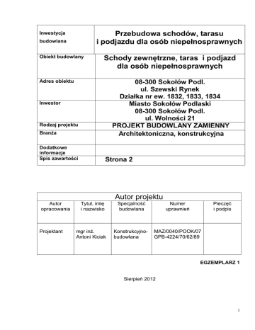 Przebudowa schodów, tarasu i podjazdu dla osób niepełnosprawnych Inwestycja budowlana Obiekt budowlany Schody zewnętrzne, taras i podjazd dla osób niepełnosprawnych Adres obiektu 08-300 Sokołów Podl. ul. Szewski Rynek Działka nr ew. 1832, 1833, 1834 Miasto Sokołów Podlaski 08-300 Sokołów Podl. ul. Wolności 21 PROJEKT BUDOWLANY ZAMIENNY Architektoniczna, konstrukcyjna Inwestor Rodzaj projektu Branża Dodatkowe informacje Spis zawartości Strona 2 Autor projektu Autor opracowania Projektant Tytuł, imię i nazwisko Specjalność budowlana Numer uprawnień Pieczęć i podpis mgr inż. Antoni Kiciak Konstrukcyjnobudowlana MAZ/0040/POOK/07 GPB-4224/70/62/89 EGZEMPLARZ 1 Sierpień 2012 1 SPIS ZAWARTOŚCI PROJEKTU ZAMIENNEGO Schodów zewnętrznych, tarasu i podjazdu dla osób niepełnosprawnych A. Część opisowa konstrukcji do projektu: 1. Strona tytułowa 2. Spis zawartości projektu 3. Opis techniczny schodów, tarasu i podjazdu dla osób niepełnosprawnych 4. Uprawnienia, oświadczenia, zaświadczenia str. str. 1 2 str. 3-6 str. 7-11 B. Część rysunkowa do projektu: 5. Rzut fundamentów przebudowa 6. Rzut schodów przebudowa 7. Przekrój podłużny przebudowa 8. Przekrój poprzeczny I-I przebudowa 9. Przekrój poprzeczny II-II przebudowa 10. Przekrój poprzeczny III-III przebudowa 11. Przekrój poprzeczny IV-IV przebudowa 12. Przekrój poziomy A-A przebudowa 13. Mocowanie słupków przebudowa 14. Konstrukcja ściany oporowej przebudowa Projekt zawiera w części: - budowlano-architektonicznej zawiera ponumerowanych - w tym w rysunkowej zawiera ponumerowanych 10 rysunków. str. 12 str. 13 str. 14 str. 15 str. 16 str. 17 str. 18 str. 19 str. 20 str. 21 21 stron. I 2 OPIS TECHNICZNY do projektu zamiennego schodów zewnętrznych, tarasu i podjazdu dla osób A. Opis ogólny inwestycji : Przedmiotem opracowania jest projekt budowlano-architektoniczny zamienny schodów zewnętrznych , tarasu i podjazdu dla osób niepełnosprawnych w Sokołowie Podlaskim przy ul. Szewski Rynek. Zamianie podlegać będzie rodzaj materiału na słupki, okładziny poziome i pionowe, ścian i pochylni z klinkieru na granit w trzech rodzajach oraz z kostki betonowej na granitową. Zmianie podlegają opisy i rysunki dotyczące zmianie słupków i okładzin schodów, pochylni. Informacja bezpieczeństwa pozostaje aktualna według pierwotnego projektu. 1. Przeznaczenie, program użytkowy obiektu budowlanego, zestawienie powierzchni. Schody , taras oraz podjazd dla osób niepełnosprawnych będą stanowiły dojście do istniejących lokali usługowych , zlokalizowanych w wysokim parterze kamienic usytuowanych przy ulicy Szewski Rynek w Sokołowie Podlaskim , których poziom tzw. „zera” wynosi średnio 90,0cm ponad poziom terenu . Kilka lokali usługowych ma zawyżony poziom tzw. „zera” ,dlatego zaprojektowano kilka stopni pośrednich bezpośrednio z poziomu tarasu. Kamienice , których zlokalizowane są przedmiotowe lokale usługowe są obiektami starymi , tylko jedna kamienica została pobudowana kilka lat temu i posiada fundamenty betonowe oraz ławy fundamentowe żelbetowe, pozostałe budynki posadowione są na fundamentach kamienno-betonowych / podczas budowy nowego budynku dokonano odkrywek fundamentów kamienic sąsiednich i stwierdzono, że ich stan techniczny jest słaby, bloki kamienne powiązane zaprawą /. Schody zewnętrzne z tarasem będące przedmiotem przebudowy są w złym stanie technicznym i nie spełniają obowiązujących norm i przepisów, nie zapewniają dostępu do lokali usługowych dla osób niepełnosprawnych, wykonane są na podłożu pisakowo-żwirowym, na wierzchu płyty betonowe, które są spękane i z licznymi ubytkami, mur oporowy częściowo murowany – tynkowany, częściowo-wylewany betonowy, tynkowany, słupki murowane tynkowane o wymiarach jak rysunku przekroju podłużnego inwentaryzacja, barierka z rury stalowej mocowane w słupku, stopnie schodów betonowe, z licznymi spękaniami i ubytkami. Stan techniczny schodów zewnętrznych i tarasu jest w złym stanie technicznym, schody należy przebudować, rozbierając je w całości. 3 Uwaga! Podczas rozbiórki schodów zewnętrznych i tarasu należy zachować nie naruszony pas budowli przylegający do starych kamienic o szerokości około 1,0m –licząc od ścian budynków , ten obszar należy usuwać odcinkami o długości 1,0m pozostawiając 1,0 m budowli na przemian, miejsca te dla wzmocnienia fundamentów istniejących kamienic należy wzmocnić poprzez wykonanie ściany betonowej fundamentowej wg rysunku przekroju poprzecznego I-I przebudowa , który stanowi załącznik do projektu budowlanego. Po wykonaniu robót polegających na wykonaniu fundamentu wzmacniającego fundamenty starych kamienic, można przystąpić do prac budowlanych przy budowie schodów zewnętrznych , tarasu i podjazdu dla osób niepełnosprawnych. Dane ogólne: - powierzchnia zabudowy istniejących schodów zewnętrznych i tarasu 198,26 m2 - powierzchnia zabudowy przebudowanych schodów zewnętrznych, tarasu i podjazdu dla osób niepełnosprawnych 20,65 m2 + 183,95 m2 + 41,20 m2= 245,80 m2 Wysokość tarasu Długość Szerokość - 0,90 m - 62,08 m - 3,19 m do 4,49 m. Fundament pod schody betonowe tj. ścianę oporową i słupki wykonać zgodnie z załączonym rysunkiem konstrukcyjnym ściany oporowej i rysunkiem rzutu fundamentów, zbrojenie słupków –rdzeń betonowy z betonu B-20, zbrojenie słupków schodów 4 pręty o średnicy 16 mm powiązanymi strzemionami o średnicy 6mm w rozstawie co 20cm, zbrojenie ściany oporowej schodów wg rysunku konstrukcyjnego załączonego do projektu budowlanego, który zawiera wykaz stali zbrojeniowej oraz rodzaj betonu . Ściana oporowa wykończona od zewnątrz będzie okładzinami granitowymi groszkowanymi o barwie szarej o grubości 6cm, zaś pod słupkami okładziną granitową groszkowaną o barwie średnio-jasny grafit o grubości 12cm, jako przedłużenie słupka. Narożniki zewnętrzne z