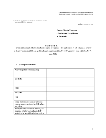 Załącznik do rozporządzenia Ministra Pracy i Polityki Społecznej z dnia 8 października 2009 r. (poz. 1367) …………………………………………….. ( nazwa spółdzielni socjalnej ) data ……………... Gmina Miasta Tarnowa - Powiatowy Urząd Pracy w Tarnowie WNIOSEK o zwrot opłaconych składek na ubezpieczenia społeczne, o których mowa w art. 12 ust. 3a ustawy z dnia 27 kwietnia 2006 r. o spółdzielniach socjalnych (Dz. U. Nr 94, poz.651 oraz z 2009 r. Nr 91 poz. 742) I. Dane podstawowe: Nazwa spółdzielni socjalnej Siedziba KRS REGON NIP Imię, nazwisko i numer telefonu osoby reprezentującej spółdzielnię socjalną Numer i data zawarcia umowy ze starostą właściwym dla siedziby spółdzielni a spółdzielnią socjalną 1 II. Dane rozliczeniowe wypadkowe chorobowe rentowe Podstawa wymiaru składek w zł emerytalne Lp. Okres opłacenia składek (od dnia do dnia) Kwota opłaconych składek w zł i gr Kwota opłaconych składek w zł i gr Kwota składek podlegająca zwrotowi w zł i gr 1. Dane personalne osoby, której dotyczy rozliczenie: Imię i nazwisko:…………………………………………………………………………….. PESEL:………………………………………………………………………………………. NIP:………………………………………………………………………………………….. Okres, na który został zawarty stosunek pracy między spółdzielnią socjalną, a jej członkiem, nawiązany na podstawie spółdzielczej umowy o pracę oraz formach określonych w art. 201 ustawy z dnia 16 września 1982 r. – Prawo spółdzielcze (Dz. U. z 2003 r. Nr 188, poz. 1848 z późn.zm.) ..……………………………………………………………………………………………… Data przystąpienia do spółdzielni socjalnej:…………………………………………………. Przynależność osoby przed przystąpieniem do spółdzielni socjalnej (podkreślić właściwe ) Osoby bezrobotne w rozumieniu art. 2 ust 1 pkt 2 ustawy z dnia 20 kwietnia 2004 o promocji zatrudnienia i instytucjach rynku pracy (Dz. U. z 2015 r. poz. 149, z późn. zm.), Osoby, o których mowa w art. 1 ust. 2 pkt 1-4, 6,7 ustawy z dnia 13 czerwca 2003r. o zatrudnieniu socjalnym (Dz. U. z 2011 r., Nr 43, poz. 225, z późn. zm.), Osoby niepełnosprawne w rozumieniu ustawy z dnia 27 sierpnia 1997 r. o rehabilitacji zawodowej i społecznej oraz zatrudnianiu osób niepełnosprawnych (Dz. U. z 2011 r., Nr 127, poz. 721, z późn. zm.) 2. Dane personalne osoby, której dotyczy rozliczenie: Imię i nazwisko:…………………………………………………………………………….. PESEL:………………………………………………………………………………………. NIP:………………………………………………………………………………………….. Okres, na który został zawarty stosunek pracy między spółdzielnią socjalną, a jej członkiem, nawiązany na podstawie spółdzielczej umowy o pracę oraz formach określonych w art. 201 ustawy z dnia 16 września 1982 r. – Prawo spółdzielcze (Dz. U. z 2003 r. Nr 188, poz. 1848 z późn.zm.) ..……………………………………………………………………………………………… Data przystąpienia do spółdzielni socjalnej:…………………………………………………. Przynależność osoby przed przystąpieniem do spółdzielni socjalnej (podkreślić właściwe ) Osoby bezrobotne w rozumieniu art. 2 ust 1 pkt 2 ustawy z dnia 20 kwietnia 2004 o promocji zatrudnienia i instytucjach rynku pracy (Dz. U. z 2015 r. poz. 149, z późn. zm.), Osoby, o których mowa w art. 1 ust. 2 pkt 1-4, 6,7 ustawy z dnia 13 czerwca 2003r. o zatrudnieniu socjalnym (Dz. U. z 2011 r., Nr 43, poz. 225, z późn. zm.), Osoby niepełnosprawne w rozumieniu ustawy z dnia 27 sierpnia 1997 r. o rehabilitacji zawodowej i społecznej oraz zatrudnianiu osób niepełnosprawnych (Dz. U. z 2011 r., Nr 127, poz. 721, z późn. zm.) 3. Dane personalne osoby, której dotyczy rozliczenie: Imię i nazwisko:…………………………………………………………………………….. PESEL:………………………………………………………………………………………. NIP:………………………………………………………………………………………….. Okres, na który został zawarty stosunek pracy między spółdzielnią socjalną, a jej członkiem, nawiązany 2 na podstawie spółdzielczej umowy o pracę oraz formach określonych w art. 201 ustawy z dnia 16 września 1982 r. – Prawo spółdzielcze (Dz. U. z 2003 r. Nr 188, poz. 1848 z późn.zm.) ..……………………………………………………………………………………………… Data przystąpienia do spółdzielni socjalnej:…………………………………………………. Przynależność osoby przed przystąpieniem do spółdzielni socjalnej (podkreślić właściwe ) Osoby bezrobotne w rozumieniu art. 2 ust 1 pkt 2 ustawy z dnia 20 kwietnia 2004 o promocji zatrudnienia i instytucjach rynku pracy (Dz. U. z 2015 r. poz. 149, z późn. zm.), Osoby, o których mowa w art. 1 ust. 2 pkt 1-4, 6,7 ustawy z dnia 13 czerwca 2003r. o zatrudnieniu socjalnym (Dz. U. z 2011 r., Nr 43, poz. 225, z późn. zm.), Osoby niepełnosprawne w rozumieniu ustawy z dnia 27 sierpnia 1997 r. o rehabilitacji zawodowej i społecznej oraz zatrudnianiu osób niepełnosprawnych (Dz. U. z 2011 r., Nr 127, poz. 721, z późn. zm.) 4. Dane personalne osoby, której dotyczy rozliczenie: Imię i nazwisko:…………………………………………………………………………….. PESEL:………………………………………………………………………………………. NIP:………………………………………………………………………