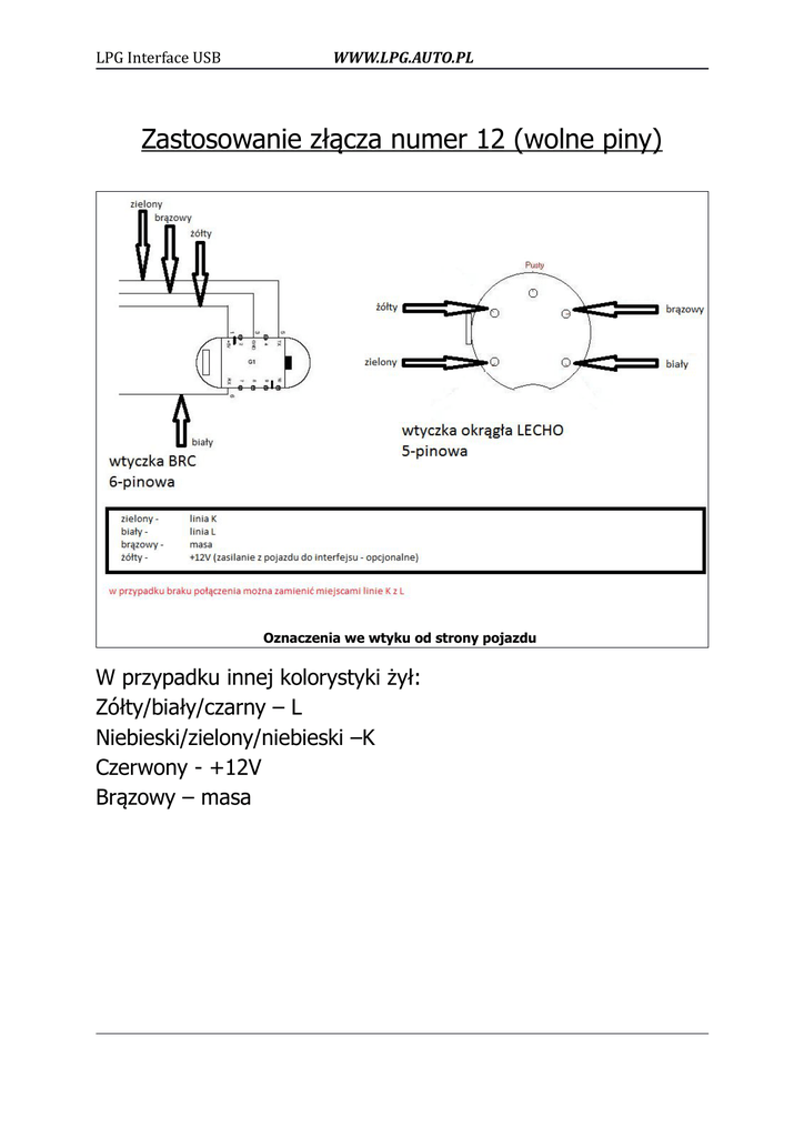 LPG Interface USB WWW.LPG.AUTO.PL Zastosowanie złącza numer 12 (wolne piny) Oznaczenia we wtyku od strony pojazdu W przypadku innej kolorystyki żył: Zółty/biały/czarny – L Niebieski/zielony/niebieski –K Czerwony - +12V Brązowy – masa