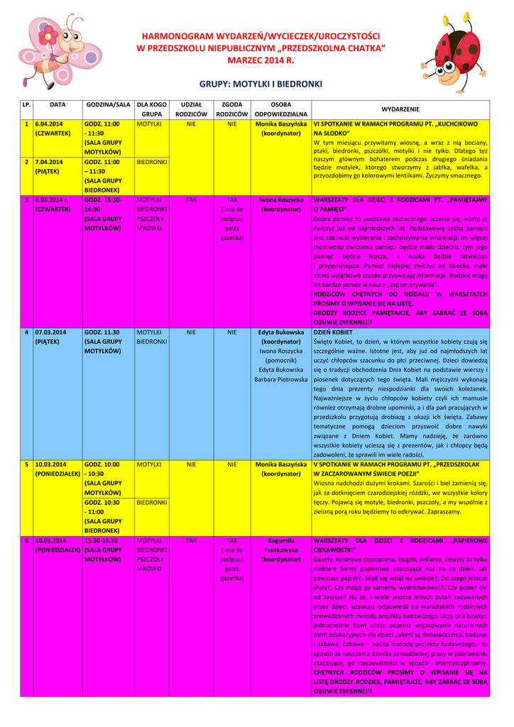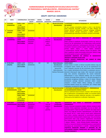 HARMONOGRAM WYDARZEŃ/WYCIECZEK/UROCZYSTOŚCI W PRZEDSZKOLU NIEPUBLICZNYM „PRZEDSZKOLNA CHATKA” MARZEC 2014 R. GRUPY: MOTYLKI I BIEDRONKI LP. DATA GODZINA/SALA 1 6.04.2014 (CZWARTEK) 2 7.04.2014 (PIĄTEK) 3 6.03.2014 r. (CZWARTEK) 4 07.03.2014 (PIĄTEK) 5 10.03.2014 GODZ. 10:00 (PONIEDZIAŁEK) - 10:30 (SALA GRUPY MOTYLKÓW) GODZ. 10:30 - 11:00 (SALA GRUPY BIEDRONEK) 10.03.2014 15.30-16.30 (PONIEDZIAŁEK) (SALA GRUPY MOTYLKÓW) 6 GODZ. 11:00 - 11:30 (SALA GRUPY MOTYLKÓW) GODZ. 11:00 – 11:30 (SALA GRUPY BIEDRONEK) GODZ. 15:3016:30 (SALA GRUPY MOTYLKÓW) GODZ. 11.30 (SALA GRUPY MOTYLKÓW) DLA KOGO GRUPA MOTYLKI UDZIAŁ RODZICÓW NIE BIEDRONKI ZGODA OSOBA WYDARZENIE RODZICÓW ODPOWIEDZIALNA NIE Monika Baszyńska VI SPOTKANIE W RAMACH PROGRAMU PT. „KUCHCIKOWO (koordynator) NA SŁODKO” W tym miesiącu przywitamy wiosnę, a wraz z nią bociany, ptaki, biedronki, pszczółki, motylki i nie tylko. Dlatego też naszym głównym bohaterem podczas drugiego śniadania będzie motylek, którego stworzymy z jabłka, wafelka, a przyozdobimy go kolorowymi lentilkami. Życzymy smacznego. MOTYLKI BIEDRONKI PSZCZOŁY MRÓWKI TAK TAK (lista do podpisu; patrz gazetka) MOTYLKI BIEDRONKI NIE NIE MOTYLKI NIE NIE TAK TAK (lista do podpisu; patrz gazetka) BIEDRONKI MOTYLKI BIEDRONKI PSZCZOŁY MRÓWKI Iwona Roszycka (koordynator) WARSZTATY DLA DZIECI Z RODZICAMI PT. „PAMIĘTAJMY O PAMIĘCI” Dobra pamięć to podstawa skutecznego uczenia się, warto ją ćwiczyć już od najmłodszych lat. Podstawową cechą pamięci jest zdolność wybierania i zachowywania informacji. Im więcej możliwości ćwiczenia pamięci będzie miało dziecko, tym jego pamięć będzie lepsza, a nauka będzie łatwiejsza i przyjemniejsza. Pamięć najlepiej ćwiczyć od dziecka, małe dzieci wyjątkowo szybko przyswajają informacje. Rodzice mogą im bardzo pomóc w nauce „zapamiętywania”. RODZICÓW CHĘTNYCH DO UDZIAŁU W WARSZTATCH PROSIMY O WPISANIE SIĘ NA LISTĘ. DRODZY RODZICE PAMIĘTAJCIE, ABY ZABRAĆ ZE SOBĄ OBUWIE ZMIENNE!!! Edyta Bukowska DZIEŃ KOBIET (koordynator) Święto Kobiet, to dzień, w którym wszystkie kobiety czują się Iwona Roszycka szczególnie ważne. Istotne jest, aby już od najmłodszych lat (pomocnik) uczyć chłopców szacunku do płci przeciwnej. Dzieci dowiedzą Edyta Bukowska się o tradycji obchodzenia Dnia Kobiet na podstawie wierszy i Barbara Piotrowska piosenek dotyczących tego święta. Mali mężczyźni wykonają tego dnia prezenty niespodzianki dla swoich koleżanek. Najważniejsze w życiu chłopców kobiety czyli ich mamusie również otrzymają drobne upominki, a i dla pań pracujących w przedszkolu przygotują drobiazg z okazji ich święta. Zabawy tematyczne pomogą dzieciom przyswoić dobre nawyki związane z Dniem Kobiet. Mamy nadzieję, że zarówno wszystkie kobiety ucieszą się z prezentów, jak i chłopcy będą zadowoleni, że sprawili im wiele radości. Monika Baszyńska V SPOTKANIE W RAMACH PROGRAMU PT. „PRZEDSZKOLAK (koordynator) W ZACZAROWANYM ŚWIECIE POEZJI” Wiosna nadchodzi dużymi krokami. Szarości i biel zamienią się, jak za dotknięciem czarodziejskiej różdżki, we wszystkie kolory tęczy. Pojawią się motyle, biedronki, pszczoły, a my wspólnie z zieloną porą roku będziemy to odkrywać. Zapraszamy. Bogumiła Frankowska (koordynator) WARSZTATY DLA DZIECI Z RODZICAMI „PAPIEROWE CIEKAWOSTKI” Gazety, kolorowe czasopisma, książki, reklamy, zeszyty to tylko niektóre formy papierowe otaczające nas na co dzień. Jak powstaje papier?, Skąd się wziął na świecie?, Do czego jeszcze służy?, Czy mogę go samemu wyprodukować?, Czy papier był od zawsze? Na te, i wiele jeszcze innych pytań zadawanych przez dzieci, uzyskasz odpowiedź na warsztatach rodzinnych prowadzonych metodą projektu badawczego. Uczy ona bawiąc, jednocześnie bawi ucząc poprzez angażowanie naturalnych form edukacyjnych dla dzieci ,jakimi są doświadczenia, badanie i zabawa. Zabawa – nauka metodą projektu badawczego, to sposób za nauczenia dziecka samodzielnej pracy w poznawaniu otaczającej go rzeczywistości w sposób interdyscyplinarny. CHĘTNYCH RODZICÓW PROSIMY O WPISANIE SIĘ NA LISTĘ.DRODZY RODZICE, PAMIĘTAJCIE, ABY ZABRAĆ ZE SOBĄ OBUWIE ZMIENNE!!! 7 14.03.2014 r. (PIĄTEK) GODZ. 15:00 - 15:30 (SALA GRUPY MOTYLKÓW) MOTYLKI BIEDRONKI TAK TAK (lista do podpisu; patrz gazetka) Zuzanna Bekisz-Michalska (koordynator) WARSZTATY RODZICAMI Z JĘZYKA ANGIELSKIEGO DLA DZIECI Z Warsztaty będą miały charakter partnerskich działań dzieci i ich rodziców. Głównym celem jest podsumowanie i utrwalenie poznanego zakresu materiału z języka angielskiego. Podczas zajęć przeniesiemy się w świat małego przedszkolaka, obecność rodziców to wspaniała szansa dla naszych pociech aby poczuły się bezpiecznie i miały możliwość pokazania czego się nauczyły. Przekonamy się jak wiele przyjemności daje nauka języka angielskiego poprzez zabawę, piosenki i wierszyki. Zaobserwujemy jak zabawy edukacyjne uczą a także pobudzają zdolność kreatywnego myślenia, rozwijają pewność siebie i wspierają działanie w grupie. Serdecznie zapraszam do wspólnych zmagań i nauki języka angielskiego w tak doborowym towarzystwie jakim są nasze dzieci. RODZICÓW CHĘTNYCH DO UDZIAŁU W WARSZTATACH PROSIMY O WPISANIE SIĘ NA LISTĘ. DRODZY RODZICE, PAMIĘTAJCIE O OBUWIU ZMIENNYM!!! 8 9 20.03.2014 (CZWARTEK) 21.03.2014 (PIĄTEK) 10 DO USTALENIA GODZ. 15:3016:30 (SALA GRUPY BIEDRONEK) MOTYLKI BIEDRONKI PSZCZÓŁKI MRÓWKI TAK GODZ. 14:00 (SALA GRUPY MOTYLKÓW) MOTYLKI BIEDRONKI NIE NIE Zakład krawiecki MOTYLKI przy kładce BIEDRONKI NIE NIE Aleksandra Zmudzińska Iwona Roszycka Barbara Piotrowska Edyta Bukowska WYCIECZKA DO ZAKŁADU KRAWIECKIEGO Marzec jest miesiącem, w którym dzieci poznają różne zawody. Wspólnie z maluszkami wybierzemy się na małą wycieczkę do zakładu krawieckiego, w którym dzieci będą mogły zobaczyć, jakimi akcesoriami posług
