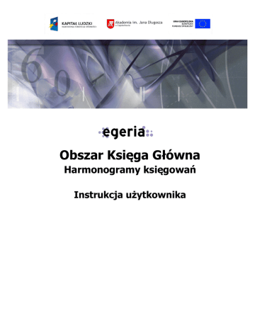 Obszar Księga Główna Harmonogramy księgowań Instrukcja użytkownika Spis treści SPIS TREŚCI .................................................................................................................................................................................... 2 NAWIGACJA PO SYSTEMIE ........................................................................................................................................................ 3 1. Podstawowa nawigacja po systemie ..................................................................................................................................... 3 OPERACJE ....................................................................................................................................................................................... 6 2. 2. Harmonogramy Księgowań .................................................................................................................................................. 6 Utworzenie Harmonogramu Księgowań ............................................................................................................................... 8 Nawigacja po systemie 1. Podstawowa nawigacja po systemie W formularzach można poruszać się czterema sposobami, a mianowicie za pomocą: • myszy - można poruszać się po widocznych w formularzu polach klikając lewym przyciskiem myszy na wybranym polu, • poleceń podręcznego menu rozwijalnego, • przycisków paska narzędzi, • klawiatury. W tabeli zamieszczonej poniżej znajduje się zestawienie operacji służących do poruszania się w formularzu i sposoby ich wykonania: Nazwa operacji Klawisz Przycisk narzędzi Polecenie menu podręcznego Przejście do następnego pola [Tab], [Enter] - Pole>Następne Przejście do poprzedniego pola [Schift+Tab] - Pole>Poprzednie Przejście do następnego bloku [Ctrl+Page Down] Blok>Następny Przejście do poprzedniego bloku [Ctrl+Page Up] Blok>Poprzedni Poruszanie się wewnątrz pola Klawisze kierunkowe - - Poruszanie się w liście wyboru Klawisze kierunkowe ↑↓ - - - - Przejście na zapisu w polu początek/koniec [Home]/[End] Na pasku narzędziowym umieszczone są najczęściej wykorzystywane narzędzia aplikacji. Uruchomienie polecenia następuje poprzez kliknięcie lewym przyciskiem myszy na wskazanym przycisku formularza. Poprzez wskazanie przycisku wskaźnikiem myszy i odczekanie około dwóch sekund, uzyskuje się krótkie objaśnienie procedury uruchamianej przez wskazany przycisk. Wszystkie przyciski dostępne są również przy pomocy skrótów klawiszowych. Opis funkcji realizowanych przez przyciski narzędzi: 3 Zachowaj [F10] Zapisuje do bazy danych zmiany rekordów wprowadzone do formularza. Wstaw rekord [F6] Wstawia w aktywnym formularzu czysty rekord, gotowy do wypełniania danymi. Usuń rekord [Shift+F6] Usuwa aktywny rekord. Aby akcja zaszła w bazie należy w następnej kolejności uruchomić polecenie Zachowaj. Usunięcie rekordu jest niemożliwe, jeżeli istnieją powiązane z nim inne rekordy. W takim przypadku należy najpierw usunąć zależne rekordy. Wyczyść [Shift+F4] rekord Czyści aktywny rekord i wszystkie z nim powiązane. Jeżeli nie jest to ostatni z wybranych z bazy rekordów, to na pustym miejscu w formularzu po anulowanym rekordzie automatycznie pojawia się rekord następny wraz z odpowiednimi powiązanymi rekordami. Kopiuj rekord [F4] Kopiuje do nowego rekordu wartości z poprzedniego rekordu w obrębie danego bloku. Kopiuj pole [F3] Kopiuje do nowego pola wartość analogicznego pola w poprzednim rekordzie, w obrębie danego bloku. Wprowadź zapytanie [F7] Ustawia formularz w tryb wprowadzania zapytania. W pola rekordów należy wprowadzić warunki (parametry) zapytania. Po uruchomieniu zapytania, zostaną znalezione w bazie wszystkie rekordy spełniające podane warunki. Znaki specjalne: % - zastępuje dowolny ciąg znaków, _ - zastępuje 1 znak. Wykonaj zapytanie [F8] Aplikacja znajduje w bazie wszystkie rekordy spełniające parametry zapytania i odczytuje je z bazy. Znalezione rekordy można przeglądać w formularzu. Zlicz rekordy zapytania Liczy rekordy znalezione w bazie podczas wykonywania zapytania i wyświetla ich liczbę [Shift+F2] w pasku komunikatów. 4 Poprzedni blok [Ctrl+Page Up] Jeżeli formatka składa się z kilku bloków, kursor przechodzi do poprzedniego bloku. Następny blok [Ctrl+Page Down] Kursor przechodzi do następnego bloku w formatce. Pierwszy rekord Formularz ustawia jako aktywny i wyświetla pierwszy rekord spośród wszystkich odczytanych przez wykonanie zapytania do bazy. Poprzedni rekord [] Formularz ustawia jako aktywny i wyświetla poprzedni rekord spośród wszystkich odczytanych przez zapytanie do bazy. Następny rekord [] Formularz ustawia jako aktywny i wyświetla następny rekord spośród wszystkich odczytanych przez zapytanie do bazy. Ostatni rekord Formularz ustawia jako aktywny i wyświetla ostatni rekord spośród wszystkich odczytanych przez wykonanie zapytania do bazy. Edytor tekstu Wywołuje formularz służący do edycji wartości znajdującej się w aktywnym polu. Informacje dodatkowe Wyświetla informację o dacie utworzenia i modyfikacji aktywnego rekordu i o użytkowniku, który te operacje wykonał. Pola definiowalne Możliwe jest zdefiniowanie w CSS dodatkowego pola, które nie będzie pokazywany na formularzu standardowo, lecz dopiero po użyciu tegoż przycisku. Filtr Umożliwia filtrowanie danych według filtrów zdefiniowanych w module CSS. Sortowanie Umożliwia sortowanie danych według definicji dokonanej w module CSS. Raporty użytkownika Przycisk uruchamia Generator Raportów umożliwiający stworzenie pożądanego raportu, jeżeli użytkownik posiada odpowiednie uprawnienia. Pomoc [F1] Uruchamia formularz z pomocą kontekstową. Pomoc może dotyczyć bloków lub pól. Wyjście [Ctrl+q] Zakończenie pracy w aktywnym formularzu. Lista wartości [F9] Rozwija listę możliwych wartości