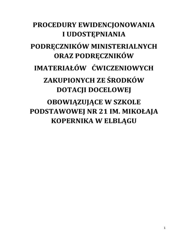 PROCEDURY EWIDENCJONOWANIA I UDOSTĘPNIANIA PODRĘCZNIKÓW MINISTERIALNYCH ORAZ PODRĘCZNIKÓW IMATERIAŁÓW ĆWICZENIOWYCH ZAKUPIONYCH ZE ŚRODKÓW DOTACJI DOCELOWEJ OBOWIĄZUJĄCE W SZKOLE PODSTAWOWEJ NR 21 IM. MIKOŁAJA KOPERNIKA W ELBLĄGU 1 Podstawa prawna: Ustawa z dnia 21 lutego 2014 r. o zmianie ustawy o systemie oświaty Ustawa z dnia 30 maja 2014 r. o zmianie ustawy o systemie oświaty oraz niektórych innych ustaw Rozporządzenie Ministra Edukacji Narodowej z dnia 7 lipca 2014 r. w sprawie udzielania dotacji celowej na wyposażenie szkół w podręczniki, materiały edukacyjne i materiały ćwiczeniowe Rozporządzenie Ministra Edukacji Narodowej z dnia 8 lipca 2014 r. w sprawie dopuszczania do użytku szkolnego podręczników Ustawa z dnia 29 września 1994 r. o rachunkowości (DZ.U. z 2009 r. Nr 152, poz. 1223 z późn. zm.) Ustawa z dnia 27 czerwca 1997 r. o bibliotekach (Dz. U. z 1997 r. Nr 85, poz. 539 z późn. zm.) Rozporządzenie Ministra Kultury i Dziedzictwa Narodowego z dnia 29 października 2008 r. w sprawie sposobu ewidencji materiałów bibliotecznych (Dz. U. z 2008 r. Nr 205, poz. 1283) Wewnętrzne zasady rachunkowości obowiązujące w szkole, w skład której wchodzi biblioteka 2 Definicje Podręcznik – należy przez to rozumieć podręcznik dopuszczony do użytku szkolnego; Materiał ćwiczeniowy – należy przez to rozumieć materiał przeznaczony dla uczniów służący utrwalaniu przez nich wiadomości i umiejętności. 3 1. Podręczniki, materiały edukacyjne oraz materiały ćwiczeniowe, których zakupu dokonano z dotacji celowej MEN są własnością organu prowadzącego szkołę. 2. Podręczniki i materiały edukacyjne są ewidencjonowane w zasobach bibliotecznych, zgodnie z zasadami określonymi w Rozporządzeniu Ministra Kultury i Dziedzictwa Narodowego z dnia 29 października 2008 r. w sprawie zasad ewidencji materiałów bibliotecznych (Dz. U. z 2008 r. nr 205 poz.1283) i podlegają kontroli zbiorów (skontrum, inwentaryzacja). Podręczniki w formie papierowej objęte są ewidencją uproszczoną wpisywane są do ewidencji podręczników i nie podnoszą wartości majątku biblioteki (ewidencja ilościowa). 3. Materiały ćwiczeniowe nie podlegają ewidencji bibliotecznej, są przekazywane uczniom bez obowiązku zwrotu. W dokumentacji szkolnej przez okres użytkowania materiałów ćwiczeniowych (najczęściej rok) przechowywane są klasowe listy potwierdzające odbiór tych materiałów. W przypadku odejścia ze szkoły ucznia w ciągu roku szkolnego, jest on zobowiązany do zwrotu ćwiczeń. 4. Biblioteka nieodpłatnie: 1. wypożycza uczniom podręczniki i materiały edukacyjne mające postać papierową; 2. przekazuje uczniom materiały ćwiczeniowe. 5. Uczniowie zobowiązani są do przestrzegania REGULAMINU WYPOŻYCZENIA BEZPŁATNYCH PODRĘCZNIKÓW I MATERIAŁÓW ĆWICZENIOWYCH, stanowiącego aneks do Regulaminu Biblioteki: 1. Podręczniki i materiały edukacyjne gromadzone są w bibliotece szkolnej i wypożyczane kolejnym trzem rocznikom uczniów na okres jednego roku szkolnego. 2. Książki należy zwrócić w terminie wyznaczonym przez nauczyciela bibliotekarza. 3. Udostępniane książki należy chronić przed zniszczeniem i zgubieniem. 4. Wypożyczający powinien zwrócić uwagę na ich stan, a zauważone uszkodzenia niezwłocznie zgłosić nauczycielowi bibliotekarzowi. 5. Czytelnik ponosi odpowiedzialność materialną w przypadku zagubienia lub zniszczenia wypożyczonych książek. 4 6. Podręczniki należy szanować jako dobro wspólne. W podręczniku nie wolno niczego pisać, zaznaczać, należy go obłożyć, zabezpieczając przed zniszczeniem. 7. Rodzice/opiekunowie ucznia wypożyczającego podręczniki podpisując listę odbioru podręczników zobowiązuje się do stosowania zasad niniejszego regulaminu. 6. Postępowanie z podręcznikami i materiałami edukacyjnymi w przypadkach przejścia ucznia z jednej szkoły do innej szkoły w trakcie roku szkolnego: 1. uczeń odchodzący ze szkoły jest zobowiązany do zwrócenia wypożyczonych podręczników do biblioteki najpóźniej w ostatnim dniu nauki w szkole, z której je wypożyczył. 7. Czytelnik ponosi pełną odpowiedzialność materialną za wszelkie uszkodzenia zbiorów biblioteki stwierdzone przy ich zwrocie. 8. W przypadku zniszczenia, uszkodzenia (z winy ucznia) lub niezwrócenia podręcznika lub materiału edukacyjnego w terminie do którego uczeń został zobligowany do zwrotu, szkoła może żądać od rodziców ucznia zwrotu kosztu ich zakupu. Szkoła nie może zażądać zwrotu kosztów za zniszczony podręcznik po trzech latach użytkowania. 9. W przypadku podręcznika ministerialnego zwrócona kwota będzie stanowić dochód budżetu państwa. Wpłaty dokonuje rodzic ucznia na rachunek dochodów MEN obsługiwany przez Narodowy Bank Polski w Warszawie, numer rachunku: 59 1010 1010 0031 2822 3100 0000. W treści przelewu należy wpisać: ,,zwrot za podręcznik część…” podając numer jednej z części oraz nazwisko i klasę dziecka. Koszt każdej z czterech części ,,Naszego Elementarza” jest zgodny z cennikiem MEN i wydawnictwa. W przypadku podręczników lub materiałów edukacyjnych zakupionych ze środków dotacji celowej – do języka obcego nowożytnego do klas I-III do obowiązkowych zajęć edukacyjnych w klasie IV oraz V szkoła ma prawo żądać od rodziców ucznia zwrotu kosztów podręczników /materiałów edukacyjnych lub dostarczenia nowego egzemplarza w zamian za zniszczony/zagubiony. Wpłaty dokonuje rodzic na rachunek SP 21 obsługiwany 5 przez Bank Citi Handlowy, numer rachunku: 83 1030 1218 0000 0000 9030 9005. Koszt podręcznika wieloletniego (1 egz.) jest zgodny z cennikiem ustalonym przez wydawnictwa. W treści przelewu należy wpisać: ,,zwrot za podręcznik do ……..” podając tytuł podręcznika, nazwisko i klasę dziecka. Podręcznik może również zostać odkupiony i dostarczony do biblioteki szkolnej. Materiał ćwiczeniowy jak