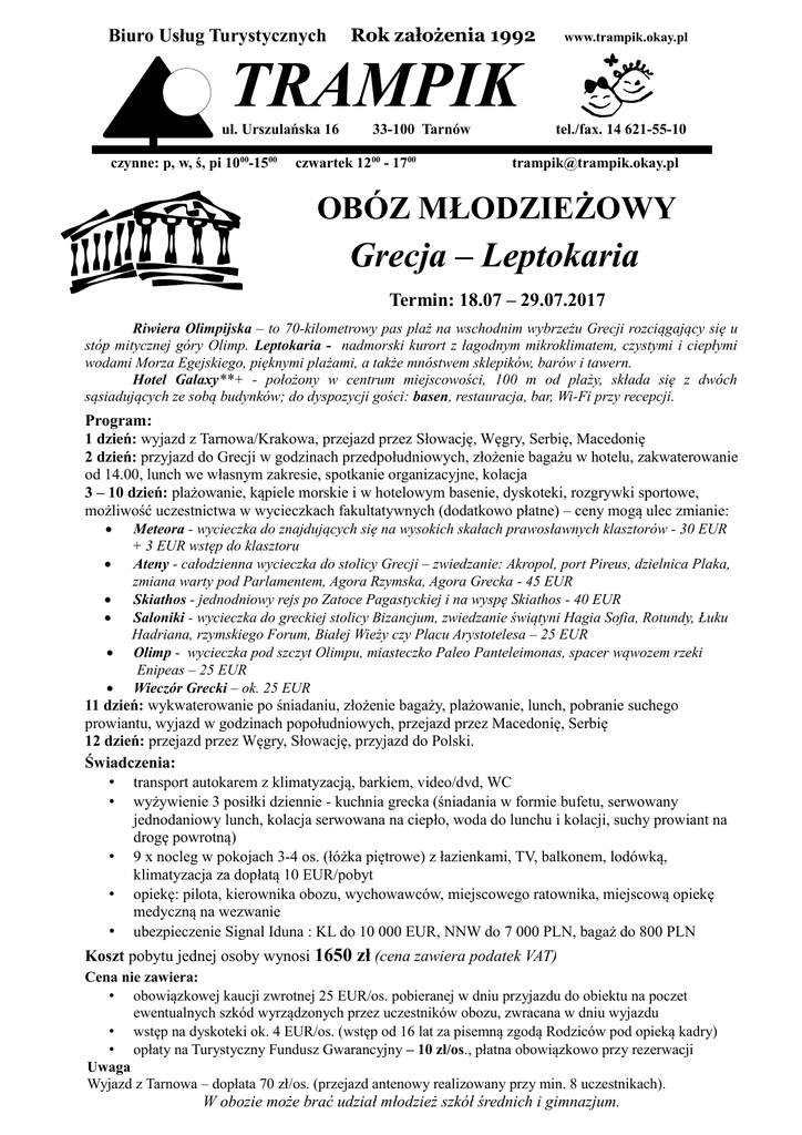 Biuro Usług Turystycznych Rok założenia 1992 www.trampik.okay.pl TRAMPIK ul. Urszulańska 16 czynne: p, w, ś, pi 1000-1500 33-100 Tarnów czwartek 1200 - 1700 tel./fax. 14 621-55-10 [email protected] OBÓZ MŁODZIEŻOWY Grecja – Leptokaria Termin: 18.07 – 29.07.2017 Riwiera Olimpijska – to 70-kilometrowy pas plaż na wschodnim wybrzeżu Grecji rozciągający się u stóp mitycznej góry Olimp. Leptokaria - nadmorski kurort z łagodnym mikroklimatem, czystymi i ciepłymi wodami Morza Egejskiego, pięknymi plażami, a także mnóstwem sklepików, barów i tawern. Hotel Galaxy**+ - położony w centrum miejscowości, 100 m od plaży, składa się z dwóch sąsiadujących ze sobą budynków; do dyspozycji gości: basen, restauracja, bar, Wi-Fi przy recepcji. Program: 1 dzień: wyjazd z Tarnowa/Krakowa, przejazd przez Słowację, Węgry, Serbię, Macedonię 2 dzień: przyjazd do Grecji w godzinach przedpołudniowych, złożenie bagażu w hotelu, zakwaterowanie od 14.00, lunch we własnym zakresie, spotkanie organizacyjne, kolacja 3 – 10 dzień: plażowanie, kąpiele morskie i w hotelowym basenie, dyskoteki, rozgrywki sportowe, możliwość uczestnictwa w wycieczkach fakultatywnych (dodatkowo płatne) – ceny mogą ulec zmianie: Meteora - wycieczka do znajdujących się na wysokich skałach prawosławnych klasztorów - 30 EUR + 3 EUR wstęp do klasztoru Ateny - całodzienna wycieczka do stolicy Grecji – zwiedzanie: Akropol, port Pireus, dzielnica Plaka, zmiana warty pod Parlamentem, Agora Rzymska, Agora Grecka - 45 EUR Skiathos - jednodniowy rejs po Zatoce Pagastyckiej i na wyspę Skiathos - 40 EUR Saloniki - wycieczka do greckiej stolicy Bizancjum, zwiedzanie świątyni Hagia Sofia, Rotundy, Łuku Hadriana, rzymskiego Forum, Białej Wieży czy Placu Arystotelesa – 25 EUR Olimp - wycieczka pod szczyt Olimpu, miasteczko Paleo Panteleimonas, spacer wąwozem rzeki Enipeas – 25 EUR Wieczór Grecki – ok. 25 EUR 11 dzień: wykwaterowanie po śniadaniu, złożenie bagaży, plażowanie, lunch, pobranie suchego prowiantu, wyjazd w godzinach popołudniowych, przejazd przez Macedonię, Serbię 12 dzień: przejazd przez Węgry, Słowację, przyjazd do Polski. Świadczenia: • transport autokarem z klimatyzacją, barkiem, video/dvd, WC • wyżywienie 3 posiłki dziennie - kuchnia grecka (śniadania w formie bufetu, serwowany jednodaniowy lunch, kolacja serwowana na ciepło, woda do lunchu i kolacji, suchy prowiant na drogę powrotną) • 9 x nocleg w pokojach 3-4 os. (łóżka piętrowe) z łazienkami, TV, balkonem, lodówką, klimatyzacja za dopłatą 10 EUR/pobyt • opiekę: pilota, kierownika obozu, wychowawców, miejscowego ratownika, miejscową opiekę medyczną na wezwanie • ubezpieczenie Signal Iduna : KL do 10 000 EUR, NNW do 7 000 PLN, bagaż do 800 PLN Koszt pobytu jednej osoby wynosi 1650 zł (cena zawiera podatek VAT) Cena nie zawiera: • obowiązkowej kaucji zwrotnej 25 EUR/os. pobieranej w dniu przyjazdu do obiektu na poczet ewentualnych szkód wyrządzonych przez uczestników obozu, zwracana w dniu wyjazdu • wstęp na dyskoteki ok. 4 EUR/os. (wstęp od 16 lat za pisemną zgodą Rodziców pod opieką kadry) • opłaty na Turystyczny Fundusz Gwarancyjny – 10 zł/os., płatna obowiązkowo przy rezerwacji Uwaga Wyjazd z Tarnowa – dopłata 70 zł/os. (przejazd antenowy realizowany przy min. 8 uczestnikach). W obozie może brać udział młodzież szkół średnich i gimnazjum.