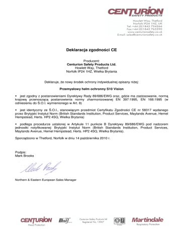 Deklaracja zgodno ci CE Producent: Centurion Safety Products Ltd. Howlett Way, Thetford Norfolk IP24 1HZ, Wielka Brytania Deklaruje, e nowy rodek ochrony indywidualnej opisany ni ej: Przemysłowy hełm ochronny S10 Vision jest zgodny z postanowieniami Dyrektywy Rady 89/686/EWG oraz, gdzie ma zastosowanie, norm krajow przenosz c postanowienia normy zharmonizowanej EN 397:1995, EN 166:1995 (w odniesieniu do .O.I. wymienionego w Art. 8) jest identyczny ze .O.I., stanowi cym przedmiot Certyfikatu Zgodno ci CE nr 58317 wydanego przez Brytyjski Instytut Norm (British Standards Institution, Product Services, Maylands Avenue, Hemel Hempstead, Herts. HP2 4SQ, Wielka Brytania) podlega procedurze ustalonej w Artykule 11 punkcie B Dyrektywy 89/686/EWG pod nadzorem jednostki notyfikowanej: Brytyjski Instytut Norm (British Standards Institution, Product Services, Maylands Avenue, Hemel Hempstead, Herts. HP2 4SQ, Wielka Brytania). Sporz dzono w Thetford, Norfolk w dniu 14 pa dziernika 2010 r. Podpis: Mark Brooks Northern & Eastern European Sales Manager Deklaracja zgodno ci CE Producent: Centurion Safety Products Ltd. Howlett Way, Thetford Norfolk IP24 1HZ, Wielka Brytania Deklaruje, e nowy rodek ochrony indywidualnej opisany ni ej: S578 Osłona do hełmu VISION jest zgodny z postanowieniami Dyrektywy Rady 89/686/EWG oraz, gdzie ma zastosowanie, norm krajow przenosz c postanowienia normy zharmonizowanej EN 166:1995 (w odniesieniu do .O.I. wymienionego w Art. 8) jest identyczny ze .O.I., stanowi cym przedmiot Certyfikatu Zgodno ci CE nr 58317 wydanego przez Brytyjski Instytut Norm (British Standards Institution, Product Services, Maylands Avenue, Hemel Hempstead, Herts. HP2 4SQ, Wielka Brytania) podlega procedurze ustalonej w Artykule 11 punkcie B Dyrektywy 89/686/EWG pod nadzorem jednostki notyfikowanej: Brytyjski Instytut Norm (British Standards Institution, Product Services, Maylands Avenue, Hemel Hempstead, Herts. HP2 4SQ, Wielka Brytania). Sporz dzono w Thetford, Norfolk w dniu 14 pa dziernika 2010 r. Podpis: Mark Brooks Northern & Eastern European Sales Manager