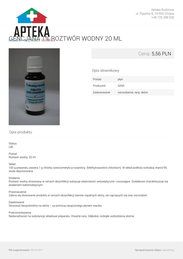 Apteka Rodzinna ul. Piastów 8, 74-500 Chojna +48 725 298 530 GENCJANA 1% ROZTWÓR WODNY 20 ML Cena: 5,56 PLN Opis słownikowy Postać płyn Producent GEMI Zastosowanie owrzodzenia, rany, skóra Opis produktu Status Lek. Postać Roztwór wodny, 20 ml Skład 100 g preparatu zawiera 1 g chlorku sześciometylo-p-rozaniliny. (Methylrosanilinii chloridum). W skład podłoża wchodzą: etanol 95, woda dejonizowana. Działanie Roztwór wodny stosowany w ramach dezynfekcji wykazuje właściwości antyseptyczne i osuszające. Dodatkowo charakteryzuje się działaniem bakteriobójczym. Przeznaczenie Zaleca się stosowanie produktu w ramach dezynfekcji stanów zapalnych skóry, ran sączących się oraz owrzodzeń. Dawkowanie Stosować bezpośrednio na skórę – za pomocą nasączonego płynem wacika. Przeciwwskazania Nadwrażliwość na substancje składowe preparatu. Otwarte rany. Głębokie, rozległe uszkodzenia skórne. Plik wygenerowano: 06-03-2017 Powered by TCPDF (www.tcpdf.org) Oprogramowanie sklepu: AptusShop