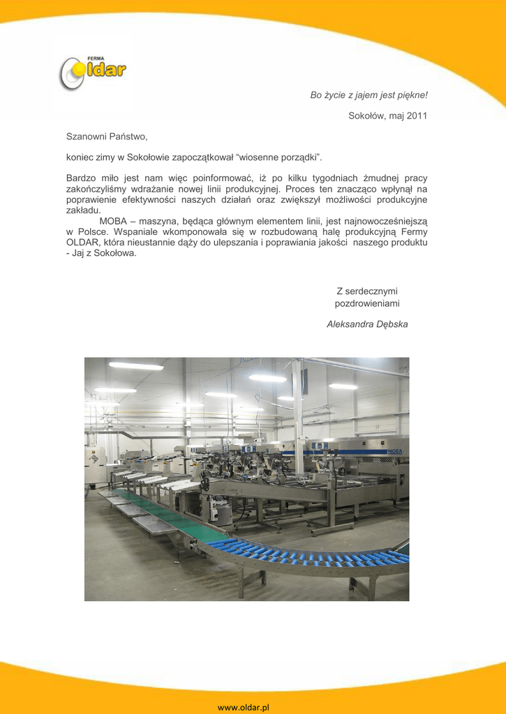 Bo życie z jajem jest piękne! Sokołów, maj 2011 Szanowni Państwo, koniec zimy w Sokołowie zapoczątkował “wiosenne porządki”. Bardzo miło jest nam więc poinformować, iż po kilku tygodniach żmudnej pracy zakończyliśmy wdrażanie nowej linii produkcyjnej. Proces ten znacząco wpłynął na poprawienie efektywności naszych działań oraz zwiększył możliwości produkcyjne zakładu. MOBA – maszyna, będąca głównym elementem linii, jest najnowocześniejszą w Polsce. Wspaniale wkomponowała się w rozbudowaną halę produkcyjną Fermy OLDAR, która nieustannie dąży do ulepszania i poprawiania jakości naszego produktu - Jaj z Sokołowa. Z serdecznymi pozdrowieniami Aleksandra Dębska www.oldar.pl Jaja z Sokołowa w Parku Sokoła czyli Ekologiczny Dzień Ziemi w Pruszkowie Na początku maja w Pruszkowskim Parku Sokoła odbył się Ekologiczny Dzieo Ziemi. Na spacerowiczów czekały wspaniałe występy dzieci i młodzieży. Można było m. in. zobaczyd jak w prosty sposób zamienid zwykłe rzeczy na niezwykłe zabawki, np. skonstruowany z kartonów, wielki czołg. Promowany ekologiczny styl życia, sprzyjał dużemu zainteresowaniu Jajami Ekologicznymi z Sokołowa, prezentowanymi na stanowisku firmowym Fermy OLDAR. Umieszczone w papierowych ekologicznych opakowaniach, kusiły nie tylko wyglądem, ale przede wszystkim właściwościami zdrowotnymi , wynikającymi ze szczególnej dbałości o warunki hodowli kur. www.oldar.pl Ciekawostka W okresie świątecznym w sklepach jak co roku pojawiły się jaja strusie. Co warto o nich wiedzied? Jajo strusia waży ok. 1650 g. zawiera ok. 1000 g białka i 320 g żółtka. Jeżeli chodzi o zawartośd cholesterolu, klasyfikuje się pomiędzy kaczką i indykiem, a perlicą czy przepiórką. Całkowita zawartośd jest zbliżona do zawartości w jajku kurzym. Jajka strusia pod względem dietetycznym są wyborne, ponieważ zawierają wielonienasycone kwasy tłuszczowe. Należy pamiętad, aby przed kupieniem jaja poddad je na miejscu szybkiemu badaniu na świeżośd. Podobnie jak w przypadku jaj kurzych najłatwiej dostrzegalną zmianą jest wyparowanie z niego wody - ubędzie masa, a zwiększy się wielkośd komory powietrznej. Test świeżości będzie więc bardzo prosty trzeba lekko potrząsnąd jajem – jaja nie świeże dadząnbulgocącynczynchlupiącynodgłos. Rozbicie skorupy na połowę nie należy do rzeczy prostych, gdyż grubośd skorupy jaja strusiego wynosi 2-3 mm i jest 10-krotnie grubsza od skorupki jaja kurzego. W przypadku, gdy zamierzamy zachowad skorupę jaja w całości, należy ostrożnie wyszczerbid małą dziurkę ostrym dłutem lub wywiercid wiertarką, a żółtko z białkiem wypłynie na zewnątrz tworząc ogromnych rozmiarów wydmuszkę. Jajanstrusiennantwardo. Jajo strusie wrzucamy do wody i gotujemy około 2,5 godziny. Po ostudzeniu można wykorzystad częściowo skorupkę jaja np. robiąc z jej połówki oryginalną miseczkę na muszelki ( przecinając ją w poprzek piłką do cięcia metalu). Jajecznicanzenstrusichnjaj. Przydatna będzie wiertarka, jeżeli jajo chcemy zachowad jako pamiątkę . Wiertarką nawiercamy z obu kooców jaja otwory i wydmuchujemy zawartośd na talerz. Smażymy jak klasyczną jajecznicę. Należy pamiętad, że jajecznicą taką możemy nakarmid od 8 do 10 osób. www.oldar.pl Placki ziemniaczane na słodko Lody dla ochłody przygotowanie: 1,5 h przygotowanie: 45 minut Co będzie potrzebne: - tarka - duże naczynie - duża patelnia - tłuszcz - łopatka do przewracania Co będzie potrzebne: - garnek - mikser - trzepaczka - 2 miski - 2 formy np. prostokątne - folia do żywności Składniki: - 2 jaja z Sokołowa - 5 dużych ziemniaków - dżem/cukier 1. Obieramy ziemniaki i ścieramy na tarce do naczynia. Czekamy 30 minut. 2. Następnie odlewamy wodę i dodajemy 2 jajka. Dokładnie mieszamy. Na patelnię wylewamy tłuszcz i czekamy aż się podgrzeje. Nabieramy masę łopatką do przewracania i kładziemy na patelni. Smażymy z obu stron na średnim ogniu ok. 30 minut. 3. Placki można podawad z dżemem lub cukrem. Składniki: - 8 jaj z Sokołowa - litr mleka - 300g śmietany - laska wanilii - 300g cukru 1. W pierwszej misce ubijamy żółtka z cukrem. W drugiej ubijamy śmietanę. Do garnka wlewamy mleko i dodajemy wanilię. Rozgrzewamy, ale nie gotujemy. Wyjmujemy wanilię. 2. Do miski z żółtkami i cukrem wlewamy powoli mleko. Dokładnie mieszamy i ubijamy. Dodajemy śmietanę. Masę wlewamy do formy i wkładamy do zamrażalki na 30 minut. 3. Wyjmujemy formę, mieszamy i przelewamy do drugiej formy. Przykrywamy folią i ponownie wkładamy do zamrażalki. 4. Lody można podawad z szarlotką lub pysznymi ciasteczkami. www.oldar.pl