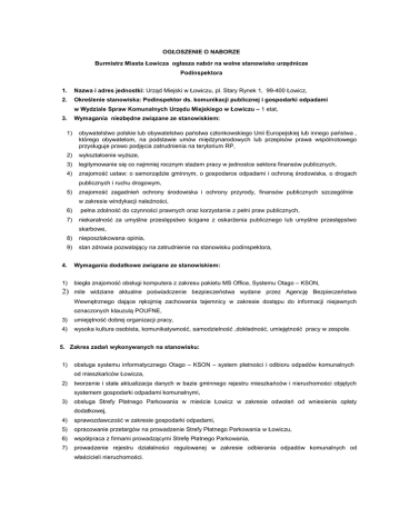 OGŁOSZENIE O NABORZE Burmistrz Miasta Łowicza ogłasza nabór na wolne stanowisko urzędnicze Podinspektora 1. Nazwa i adres jednostki: Urząd Miejski w Łowiczu, pl. Stary Rynek 1, 99-400 Łowicz, 2. Określenie stanowiska: Podinspektor ds. komunikacji publicznej i gospodarki odpadami w Wydziale Spraw Komunalnych Urzędu Miejskiego w Łowiczu – 1 etat, 3. Wymagania niezbędne związane ze stanowiskiem: 1) obywatelstwo polskie lub obywatelstwo państwa członkowskiego Unii Europejskiej lub innego państwa , którego obywatelom, na podstawie umów międzynarodowych lub przepisów prawa wspólnotowego przysługuje prawo podjęcia zatrudnienia na terytorium RP, 2) wykształcenie wyższe, 3) legitymowanie się co najmniej rocznym stażem pracy w jednostce sektora finansów publicznych, 4) znajomość ustaw: o samorządzie gminnym, o gospodarce odpadami i ochroną środowiska, o drogach publicznych i ruchu drogowym, 5) znajomość zagadnień ochrony środowiska i ochrony przyrody, finansów publicznych szczególnie w zakresie windykacji należności, 6) pełna zdolność do czynności prawnych oraz korzystanie z pełni praw publicznych, 7) niekaralność za umyślne przestępstwo ścigane z oskarżenia publicznego lub umyślne przestępstwo skarbowe, 8) nieposzlakowana opinia, 9) stan zdrowia pozwalający na zatrudnienie na stanowisku podinspektora, 4. Wymagania dodatkowe związane ze stanowiskiem: 1) biegła znajomość obsługi komputera z zakresu pakietu MS Office, Systemu Otago – KSON, 2) mile widziane aktualne poświadczenie bezpieczeństwa wydane przez Agencję Bezpieczeństwa Wewnętrznego dające rękojmię zachowania tajemnicy w zakresie dostępu do informacji niejawnych oznaczonych klauzulą POUFNE, 3) umiejętność dobrej organizacji pracy, 4) wysoka kultura osobista, komunikatywność, samodzielność ,dokładność, umiejętność pracy w zespole. 5. Zakres zadań wykonywanych na stanowisku: 1) obsługa systemu informatycznego Otago – KSON – system płatności i odbioru odpadów komunalnych od mieszkańców Łowicza, 2) tworzenie i stała aktualizacja danych w bazie gminnego rejestru mieszkańców i nieruchomości objętych systemem gospodarki odpadami komunalnymi, 3) obsługa Strefy Płatnego Parkowania w mieście Łowicz w zakresie odwołań od wniesienia opłaty dodatkowej, 4) sprawozdawczość w zakresie gospodarki odpadami, 5) opracowanie przetargów na prowadzenie Strefy Płatnego Parkowania w Łowiczu, 6) współpraca z firmami prowadzącymi Strefę Płatnego Parkowania, 7) prowadzenie rejestru działalności regulowanej w zakresie odbierania odpadów komunalnych od właścicieli nieruchomości. 6. Warunki pracy na stanowisku: 1) wymiar czasu pracy – 1 etat, 2) miejsce pracy – siedziba Urzędu Miejskiego w Łowiczu, Wydział Spraw Komunalnych, 3) praca jednozmianowa świadczona wg ustalonego czasu pracy w regulaminie pracy Urzędu Miejskiego w Łowiczu, 4) praca wykonywana przy monitorze ekranowym powyżej 4 godzin dziennie, 5) praca wymagająca wysokiego stopnia samodzielności i współpracy z innymi stanowiskami pracy Urzędu Miejskiego, z jednostkami organizacyjnymi miasta oraz zewnętrznymi instytucjami publicznymi, 6) w przypadku osób podejmujących po raz pierwszy pracę na stanowisku urzędniczym, umowa o pracę zostanie zawarta na czas określony (6 miesięcy) z obowiązkiem odbycia służby przygotowawczej (art. 16 ust. 2 i 3 ustawy z dnia 21 listopada 2008 r. o pracownikach samorządowych). 7. Informacja o wskaźniku zatrudnienia osób niepełnosprawnych: Wskaźnik zatrudnienia osób niepełnosprawnych w Urzędzie Miejskim w Łowiczu w miesiącu poprzedzającym datę upublicznienia ogłoszenia w rozumieniu przepisów o rehabilitacji zawodowej i społecznej oraz zatrudnianiu osób niepełnosprawnych był niższy niż 6 %. 8. Wymagane dokumenty: 1) list motywacyjny z uzasadnieniem przystąpienia do naboru, 2) życiorys (CV) z opisem przebiegu pracy zawodowej, 3) kwestionariusz osobowy dla osoby ubiegającej się o zatrudnienie, 4) kserokopie świadectw pracy, 5) kserokopie dokumentów potwierdzających wykształcenie, 6) kserokopie innych dokumentów o posiadanych kwalifikacjach, uprawnieniach i umiejętnościach, 7) dokumenty potwierdzające wymagany staż pracy, 8) oświadczenie kandydata, że ma pełną zdolność do czynności prawnych oraz korzysta z pełni praw publicznych, 9) oświadczenie kandydata, że kandydat nie był skazany prawomocnym wyrokiem sądu za umyślne przestępstwo ścigane z oskarżenia publicznego lub umyślne przestępstwo skarbowe, 10) oświadczenie kandydata o braku przeciwwskazań zdrowotnych do wykonywania pracy na określonym stanowisku, 11) oświadczenie kandydata o wyrażeniu zgody na przetwarzanie danych osobowych na potrzeby postępowania rekrutacyjnego, zgodnie z ustawą z dnia 29 sierpnia 1997 r. o ochronie danych osobowych (t. j. Dz. U. z 2015 r. poz. 2135 z późn. zm), 12) w przypadku osoby niepełnosprawnej, kserokopia dokumentu potwierdzającego niepełnosprawność (art. 13 a ust. 2 ustawy z dnia 21 listopada 2008 r. o pracownikach samorządowych). 9. Termin i miejsce składania dokumentów: Wymagane dokumenty aplikacyjne należy składać osobiście w sekretariacie Urzędu lub pocztą na adres Urzędu Miejskiego w Łowiczu, w nieprzekraczalnym terminie do dnia 24.08.2016 r. włącznie (w godzinach pracy Urzędu), w zamkniętej kopercie opatrzonej imieniem i nazwiskiem oraz adresem do korespondencji i numerem telefonu kandydata, z dopiskiem „Nabór na stanowisko podinspektora w WSK”. Dokumenty, które wpłyną do Urzędu Miejskiego po upływie wyżej określonego terminu nie będą rozpatrywane. Dokumenty aplikacyjne :list motywacyjny lub CV powinny być opatrzone klauzulą : Wyrażam zgodę na przetwarzanie moich danych osobowych w zakresie niezbędnym do przeprowadzenie naboru”. Dokumenty kandydata wybranego w naborze i zatrudnionego w Urzędzie Miejskim w Łowiczu zostaną dołączone do jego akt
