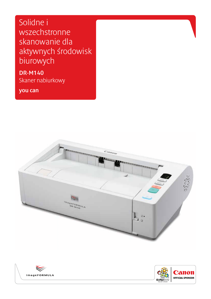 Solidne i wszechstronne skanowanie dla aktywnych środowisk biurowych DR-M140 Skaner nabiurkowy you can Wszechstronny, bardzo wydajny, kompaktowy skaner zajmujący wyjątkowo niewiele miejsca. Wszechstronne działanie skanera imageFORMULA DR-M140 doskonale sprawdza się w obciążonych pracą biurach, wydziałach firm i grupach roboczych. Szybkie skanowanie o wysokiej jakości i mnóstwo intuicyjnie obsługiwanych funkcji sprawia, że korzystanie z niego doskonale podnosi wydajność pracy. Innowacyjna, zwarta konstrukcja Skaner imageFORMULA DR-M140 został zaprojektowany w sposób, pozwalający na jak największą oszczędność miejsca. To idealne rozwiązanie dla miejsc, w których powierzchnia jest często ograniczona, np. recepcji, punktów obsługi klienta i dynamicznych środowisk korporacyjnych. Wysokość skanera DR-M140 nie przekracza 10 cm, dzięki czemu może się on zmieścić nawet w szufladzie biurka. Szybki i trwały Skaner DR-M140 jest bardzo wydajnym urządzeniem, którego szybkość skanowania w kolorze wynosi do 80 obrazów/min. w rozdzielczości 300 dpi, a sugerowany dzienny cykl pracy do 6000 skanowanych stron. Wyposażony w podajnik dokumentów mieszczący do 50 arkuszy, skaner DR-M140 stanowi idealne rozwiązanie w środowiskach, gdzie skanowanie seryjne wraz z funkcją dokładnego rozpoznawania tekstu stanowi nieodłączną część procesu obiegu dokumentów i systemów zarządzania. Inteligentna technologia obsługi papieru, na której możesz polegać Przeznaczeniem skanera DR-M140 jest pomoc w utrzymywaniu wydajności pracy na wyjątkowo wysokim poziomie. Funkcja ultradźwiękowego wykrywania podwójnego podawania papieru szybko wykrywa błędy, natomiast przycisk zwalniania podwójnego podawania papieru pozwala użytkownikowi, w szczególnych przypadkach, zignorować ten problem i kontynuować skanowanie dokumentów, takich jak koperty i dokumenty z przyklejonymi do nich karteczkami. Wyjątkowe przetwarzanie obrazu Dzięki wydajnym funkcjom przetwarzania obrazu skaner DR-M140 niezmiennie zapewnia najwyższą jakość działania. Funkcje takie jak automatyczne wykrywanie koloru, zaawansowana poprawa czytelności tekstu, automatyczne wykrywanie rozmiaru strony i prostowanie sprawiają, że jakość skanowania dokumentów będzie optymalna za każdym razem. Dla jeszcze większej wygody, dokumenty w formacie A3 można również łatwo przetwarzać w trybie folio. Sterownik skanera DR-M140 został wyposażony w funkcję MultiStream, która umożliwia skanowanie w dwóch trybach jednocześnie, na przykład przechwytywanie monochromatycznych obrazów do optycznego rozpoznawania tekstu i kolorowych tekstów w celu archiwizacji. Wszechstronna obsługa nośników Konstrukcja skanera DR-M140 pozwala wybrać pomiędzy ścieżką papieru w kształcie litery U, a ścieżką prostą. Umożliwia skanowanie wielu rodzajów dokumentów, w tym cienkich i grubych arkuszy, wytłaczanych kart, a nawet dokumentów o długości do 3 m. Dzięki solidnemu mechanizmowi separacji dokumentów skaner DR-M140 szybko i niezawodnie przetwarza mieszane zestawy dokumentów w różnych rozmiarach i o różnorodnej grubości — nawet przy maksymalnym lub intensywnym obłożeniu pracą. Ścieżka w kształcie litery "U" Podawanie dokumentów Ścieżka prosta Dodatkowy tryb pracy z prostą ścieżka papieru umożliwia bezproblemowe skanowanie plastikowych kart i grubych dokumentów. Czerń i biel Prędkość 40 stron/min. Kolor Prędkość 40 stron/min. Dzienny cykl pracy 6 000 skanowanych stron/dzień Automatyczny podajnik dokumentów 50 arkuszy Łatwe w użyciu oprogramowanie, które przynosi znakomite efekty. Do skanera DR-M140 dołączono rozbudowaną gamę intuicyjnego oprogramowania, dzięki któremu jakość skanowania stoi na niezmiennie wysokim, profesjonalnym poziomie. CaptureOnTouch jeszcze bardziej niż kiedykolwiek przyspiesza i ułatwia tworzenie materiałów wysokiej jakości dzięki zmodyfikowanemu interfejsowi użytkownika. Wbudowana funkcja trybu automatycznego upraszcza proces skanowania, umożliwiając skanowanie za pomocą jednego przycisku, tym samym przyspieszając i usprawniając realizację zadań skanowania. Oprogramowanie CaptureOnTouch obsługuje skanowanie do wielu formatów plików, w tym PDF, PDF-A, TIFF, JPEG, BMP i PPTX (PowerPoint). Umożliwia ono również przesyłanie skanowanych dokumentów bezpośrednio do aplikacji zarządzania danymi, takich jak SharePoint, ułatwiając tworzenie wygodnych i wydajnych obiegów dokumentów. CapturePerfect, to oprogramowanie, które zostało stworzone specjalnie do wykonywania zadań skanowania w środowiskach biznesowych i umożliwia wykorzystanie pełni możliwości produkcyjnych skanera DR-M140. Użytkownicy oprogramowania otrzymują dostęp do szerokiej gamy opcji wyświetlania i skanowania do konkretnych lokalizacji, w tym do folderu, wiadomości e-mail lub systemu SharePoint. Nuance eCopy PDF Pro Office to wydajna i łatwa w obsłudze aplikacja dla komputerów osobistych przeznaczona do tworzenia, edytowania i konwertowania plików PDF oraz umożliwiająca współpracę w niespotykany dotychczas sposób. Kofax VRS Basic umożliwia osiągnięcie doskonałej jakości za każdym razem. Skanowanie jest prostsze i łatwiejsze dzięki automatycznemu przetwarzaniu obrazu i obsłudze dokumentów. Najwyższa w branży jakość uzyskiwanych obrazów pozwala zwiększyć czytelność dokumentów i podnieść współczynniki optycznego rozpoznawania tekstu, dzięki czemu wymaganych jest mniej powtórnych operacji skanowania. Wynik? Klient oszczędza pieniądze, co znacząco zwiększa wydajność pracy. Dodaj przystawkę Flatbed Scanner Unit 101, aby uzyskać maksymalną elastyczność Opcjonalna przystawka Flatbed Scanner Unit 101 jest idealnym dodatkiem do skanera DR-M140. Ten dedykowany do skanowania oprawionych lub delikatnych dokumentów skaner płaski jest wyposażony w takie funkcje, jak usuwanie światła z otoczenia, co umo