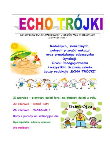 CZASOPISMO DLA NAJMŁODSZYCH UCZNIÓW MZS W BIŁGORAJU CZERWIEC 2015 R Radosnych, słonecznych, pełnych przygód wakacji oraz prawdziwego odpoczynku Dyrekcji, Gronu Pedagogicznemu i wszystkim Uczniom szkoły życzy redakcja „ECHA TRÓJKI” 21czerwca – pierwszy dzień lata, najdłuższy dzień w roku 23 czerwca – Dzień Taty 26 czerwca – WAKACJE ! Rady i porady na wakacyjne dni Ogólnopolskie sukcesy uczniów Dla Rodziców MOJEMU TACIE... 23 CZERWCA - DZIEŃ OJCA Dzisiaj Dzień Taty ! Mojego Taty! I wszystkich Ojców na świecie! Niosę dla Taty z ogródka kwiaty... Zarzucę Tacie na szyję ciepłe ręce... Powiem do ucha: Tatku , posłuchaj... Chcę Cię uściskać... nic więcej... ***** Z okazji Twojego Święta zdrowia, sił i codziennej radości wraz ze słowami największej wdzięczności za wszystkie trudy i starania składam dzisiaj podziękowania... W szkole pani kazała narysować dzieciom swoich rodziców. Po chwili podchodzi do małego Jasia i pyta: - Dlaczego twój tata ma niebieskie włosy? - Bo nie było łysej kredki. Nauczycielka oddaje Jasiowi zeszyt z wypracowaniem domowym i mówi: - Same błędy! Znów niedostateczny! Jasio mruczy pod nosem: Biedny tato... Kochany Tato zacznę zwyczajnie, że z Tobą w domu zawsze jest fajnie i w deszcz i w słotę, w smutku, w radości, wspierasz i uczysz życia w miłości. Dzisiaj za wszystko chcę Ci dziękować, skromny bukiecik kwiatów darować. ***** A teraz już czas zaprosić wszystkich Was na zasłużony odpoczynek w lasach, w górach, nad jeziorami, na wędrówki z plecakami. Wakacje, wakacje- to zielony las, kwitnące akacje i słoneczny blask. MÓJ TATUŚ Mój Tata jest wesoły, silny, mądry i wspaniały. Bawię się często z nim, gramy w piłkę, chodzimy na lody, na spacery. Tato jest dla mnie najważniejszy i bardzo kochany. Życzę mu szczęścia, zdrowia i pomyślności na Dzień Taty. Olena Misztal kl. I b Mój Tatuś dużo ogląda telewizję i często chodzi grać w piłkę, jeździ z całą rodziną na przejażdżki rowerowe i na lody. Pomaga nam odrabiać lekcje i różne prace. Czasami Tatuś gotuje obiad. Najlepiej robi pieczeń z ziemniakami i mizerią. Pomaga też Mamie. Tata lubi dużo jeść, ale jest szczupły i wysportowany. Życzę mu dużo zdrowia, pieniędzy i dobrego humoru. Magda Pokarowska z zerówki Mój Tata jest strażakiem, bardzo dużo pływa i nurkuje. Lubię z nim spędzać czas. Jeździmy wtedy na rowerach i na rolkach. Lubię spędzać czas z Tatusiem na pływaniu w basenie. Tata ma czarne oczy i włosy, jest średniego wzrostu i jest bardzo wysportowany. Na Dzień Ojca życzę mu szczęścia, radości i dużo uśmiechu. Amelka Adamek kl. I b Mój Tatuś lubi jeździć na wycieczki z całą rodziną , np. do Warszawy. Lubi spacerować, jeździć na rowerze i grać ze mną w piłkę. Gdy jest brzydka pogoda lubi siedzieć przed telewizorem albo tabletem. Tata dużo odpoczywa. Zawodowo robi parapety, czyści je i maluje. Tata mnie często przytula i lubi jak mu śpiewam piosenki. Tacie życzę szczęścia, zdrowia, miłości i spełnienia marzeń. Anitka Wajda kl. I b V Igrzyska Olimpijskie dla dzieci i młodzieży 19 czerwca br. na stadionie przy OSiR odbyły się igrzyska dzieci i młodzieży, zorganizowane pod patronatem Burmistrza Miasta Biłgoraj. Wystartowało w nich 20 drużyn ze szkół podstawowych i gimnazjum. Reprezentanci poszczególnych szkół rywalizowali w biegach na dystansie 100 i 60 metrów, w sztafecie, przeciąganiu liny, spacerze farmera unihokeju. Sportowe zmagania rozpoczęły się od prezentacji poszczególnych państw/drużyn. W rywalizacji szkół podstawowych TRÓJKA zajęła II miejsce. Uczniowie klas III a i b MZS na igrzyskach prezentują wylosowane państwo – Brazylię. WAKACJE TUŻ, TUŻ PAMIĘTAJCIE O SWOIM BEZPIECZEŃSTWIE !!! A OTO KILKA RAD, KTÓRE WARTO ZAPAMIĘTAĆ !!! Już się zbliża lato, czas radości, słońca, wielu przygód i zabaw bez końca! Jednak w czasie zabaw musicie przestrzegać zasad bezpieczeństwa. Właściwie przygotowane dzieci do opalania noszą czapki, chustki, chronią swoje głowy, kremy z filtrem stosują, swoje ciało nim smarują. W miejscach strzeżonych kąp się tylko wtedy, gdy dorosły ci pozwoli. Nigdy nie skacz na główkę do wody, bo są ku temu ważne powody! Możesz stracić zdrowie, życie, nawet jeśli pływasz znakomicie! Zakładaj gumowce lub trapery, bo sandały nie nadają się na leśne spacery. W lesie, kiedy spotkasz zwierzę, nie zbliżaj się do niego - z daleka oglądaj! Nie drażnij pszczół ani innych owadów, nie będzie ci trzeba robić okładów. Nigdy nie otwieraj drzwi nieznajomemu. Nie przyjmuj od obcych prezentów. Gdy grozi ci niebezpieczeństwo dzwoń! pod 112 to numer alarmowy do wszystkich służb ratunkowych policja 997 straż pożarna 998 Szczęśliwa 9? Dawid Dmitroca - uczeń klasy IV b został laureatem Ogólnopolskiego Konkursu Polonistycznego „Z ortografią na co dzień” (9. miejsce w Polsce) oraz uzyskał tytuł mistrza ortografii i interpunkcji polskiej Serdecznie gratulujemy sukcesu H, ó, rz, ż, u, ch . , ? ! ... Eryk Mucha - z zerówki zajął 9. miejsce w XXI Ogólnopolskim Memoriale Szachowym o Puchar Burmistrza (Eryk ma 6, kategoria wiekowa do 10 lat) Serdecznie gratulujemy! Drodzy Rodzice! Wakacje są też po to, żeby docenić osiągnięcia dzieci. Koniec roku szkolnego to czas podsumowań. Dzieci otrzymują świadectwa za cały rok nauki i pracy. Rodzice z ocen opisowych na świadectwach dowiadują się o poziomie rozwoju różnych dziecięcych umiejętności. Dla wielu wyniki ich dzieci są powodem do dumy, dla innych – powodem do zmartwienia. Jednak początek wakacji dla wszystkich dzieci powinien być szczególnym momentem docenienia ich wysiłku i włożonej pracy w naukę, wczesne wstawanie, odrabianie lekcji, robienie czegoś, na co nie zawsze miały ochotę, ale pani kazała, prosiła, zadała… Rodzice powinni pamiętać o tym, że to, co jedn