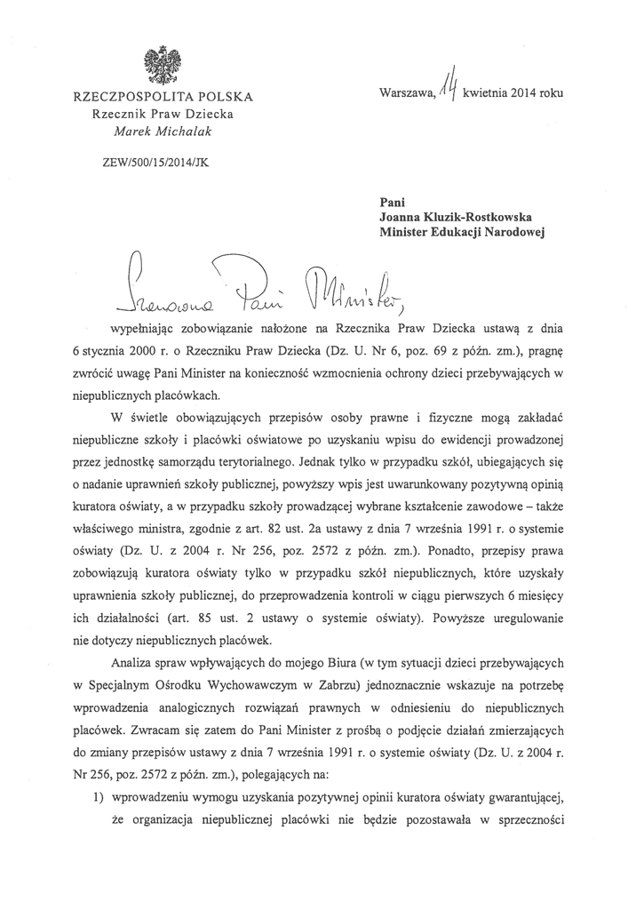 RZECZPOSPOLITA POLSKA Rzecznik Praw Dziecka Marek Michalak Warszawa, kwietnia 2014 roku ZEW/500/15/201 4/JK Pani Joanna Kluzik-Rostkowska Minister Edukacji Narodowej R 2 L L) wypełniając zobowiązanie nałożone na Rzecznika Praw Dziecka ustawą z dnia 6 stycznia 2000 r. o Rzeczniku Praw Dziecka (Dz. U. Nr 6, poz. 69 z późn. zm.), pragnę zwrócić uwagę Pani Minister na konieczność wzmocnienia ochrony dzieci przebywających w niepublicznych placówkach. W świetle obowiązujących przepisów osoby prawne i ńzyczne mogą zakładać niepubliczne szkoły i placówki oświatowe po uzyskaniu wpisu do ewidencji prowadzonej przez jednostkę samorządu terytorialnego. Jednak tylko w przypadku szkół, ubiegających się o nadanie uprawnień szkoły publicznej, powyższy wpis jest uwarunkowany pozytywną opinią kuratora oświaty, a w przypadku szkoły prowadzącej wybrane kształcenie zawodowe — także właściwego ministra, zgodnie z art. 82 ust. 2a ustawy z dnia 7 września 1991 r. o systemie oświaty (Dz. U. z 2004 r. Nr 256, poz. 2572 z późn. zm.). Ponadto, przepisy prawa zobowiązują kuratora oświaty tylko w przypadku szkół niepublicznych, które uzyskały uprawnienia szkoły publicznej, do przeprowadzenia kontroli w ciągu pierwszych 6 miesięcy ich działalności (art. 85 ust. 2 ustawy o systemie oświaty). Powyższe uregulowanie nie dotyczy niepublicznych placówek. Analiza spraw wpływających do mojego Biura (w tym sytuacji dzieci przebywających w Specjalnym Ośrodku Wychowawczym w Zabrzu) jednoznacznie wskazuje na potrzebę wprowadzenia analogicznych rozwiązań prawnych w odniesieniu do niepublicznych placówek. Zwracam się zatem do Pani Minister z prośbą o podjęcie działań zmierzających do zmiany przepisów ustawy z dnia 7 września 1991 r. o systemie oświaty (Dz. U. z 2004 r. Nr 256, poz. 2572 z późn. zm.), polegających na: 1) wprowadzeniu wymogu uzyskania pozytywnej opinii kuratora oświaty gwarantującej, że organizacja niepublicznej placówki nie będzie pozostawała w sprzeczności z realizacją praw dziecka, przed dokonaniem jej wpisu do ewidencji prowadzonej przez jednostkę samorządu terytoriahiego, 2) wprowadzeniu wymogu zbadania jej działalności przez kuratora oświaty w ciągu pierwszych 6 miesięcy od rozpoczęcia działalności, a w szczególności zaś stwierdzenia, czy sposób jej funkcjonowania jest zgodny z obowiązującymi przepisami, w tym z prawami dziecka. - Jednocześnie zwracam uwagę Pani Minister na niedostateczne uregulowania w zakresie nadzoru pedagogicznego funkcjonujące w obecnym prawie oświatowym. Rozporządzenie Ministra Edukacji Narodowej z dnia 7 października 2009 r. w sprawie nadzoru pedagogicznego (Dz. U. Nr 168, poz. 1324 z późn. zm.) nie określa częstotliwości z jaką kuratorzy oświaty powinni wykonywać zadania z zakresu nadzoru pedagogicznego w szkołach i placówkach (zarówno publicznych, jak i niepublicznych). Praktyka pokazuje, że placówki funkcjonują bez nadzoru pedagogicznego nawet po kilka lat. W przypadku Specjalnego Ośrodka Wychowawczego w Zabrzu, od chwili wejścia w życie nowego rozporządzenia w sprawie nadzoru pedagogicznego (tj. od 2009 r.), placówka ta nie była kontrolowana ani razu, pomimo wcześniej stwierdzonych nieprawidłowości, skutkujących wyrokiem karnym wobec jej dyrektora i koniecznością wymiany większości pracowników. Śląski Kurator Oświaty poinformował Rzecznika, że placówki tej nie iiylosowano do czynności planowych oraz nie wskazano do kontroli doraźnej z powodu braku skarg i interwencji. Niezbędne wydaje się więc wprowadzenie w cytowanym rozporządzeniu takich zmian, które eliminowałyby ww. sytuacje i uniezależniały prowadzenie nadzoru od wyniku losowania bądź braku skarg. Na podstawie art. 11 ustawy z dnia 6 stycznia 2000 r. o Rzeczniku Praw Dziecka (Dz. U. Nr 6, poz. 69 z późn. zm.) proszę Panią Minister o analizę problemu, a także podjęcie działań, które będą służyły realizacji przedstawionych przeze ninie postulatów. Będę wdzięczny za poinformowanie mnie o zajętym stanowisku. 2
