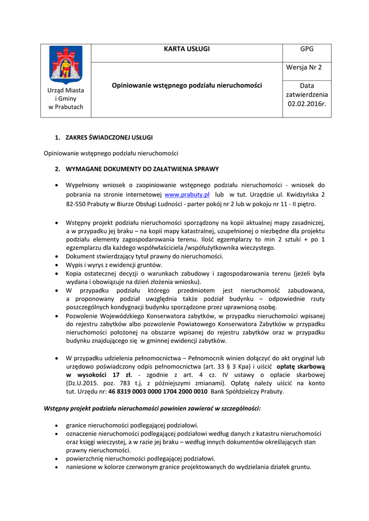 KARTA USŁUGI GPG Wersja Nr 2 Urząd Miasta i Gminy w Prabutach Opiniowanie wstępnego podziału nieruchomości Data zatwierdzenia 02.02.2016r. 1. ZAKRES ŚWIADCZONEJ USŁUGI Opiniowanie wstępnego podziału nieruchomości 2. WYMAGANE DOKUMENTY DO ZAŁATWIENIA SPRAWY • Wypełniony wniosek o zaopiniowanie wstępnego podziału nieruchomości - wniosek do pobrania na stronie internetowej www.prabuty.pl lub w tut. Urzędzie ul. Kwidzyńska 2 82-550 Prabuty w Biurze Obsługi Ludności - parter pokój nr 2 lub w pokoju nr 11 - II piętro. • Wstępny projekt podziału nieruchomości sporządzony na kopii aktualnej mapy zasadniczej, a w przypadku jej braku – na kopii mapy katastralnej, uzupełnionej o niezbędne dla projektu podziału elementy zagospodarowania terenu. Ilość egzemplarzy to min 2 sztuki + po 1 egzemplarzu dla każdego współwłaściciela /współużytkownika wieczystego. Dokument stwierdzający tytuł prawny do nieruchomości. Wypis i wyrys z ewidencji gruntów. Kopia ostatecznej decyzji o warunkach zabudowy i zagospodarowania terenu (jeżeli była wydana i obowiązuje na dzień złożenia wniosku). W przypadku podziału którego przedmiotem jest nieruchomość zabudowana, a proponowany podział uwzględnia także podział budynku – odpowiednie rzuty poszczególnych kondygnacji budynku sporządzone przez uprawnioną osobę. Pozwolenie Wojewódzkiego Konserwatora zabytków, w przypadku nieruchomości wpisanej do rejestru zabytków albo pozwolenie Powiatowego Konserwatora Zabytków w przypadku nieruchomości położonej na obszarze wpisanej do rejestru zabytków oraz w przypadku budynku znajdującego się w gminnej ewidencji zabytków. • • • • • • W przypadku udzielenia pełnomocnictwa – Pełnomocnik winien dołączyć do akt oryginał lub urzędowo poświadczony odpis pełnomocnictwa (art. 33 § 3 Kpa) i uiścić opłatę skarbową w wysokości 17 zł. - zgodnie z art. 4 cz. IV ustawy o opłacie skarbowej (Dz.U.2015. poz. 783 t.j. z późniejszymi zmianami). Opłatę należy uiścić na konto tut. Urzędu nr: 46 8319 0003 0000 1704 2000 0010 Bank Spółdzielczy Prabuty. Wstępny projekt podziału nieruchomości powinien zawierać w szczególności: • • • • granice nieruchomości podlegającej podziałowi. oznaczenie nieruchomości podlegającej podziałowi według danych z katastru nieruchomości oraz księgi wieczystej, a w razie jej braku – według innych dokumentów określających stan prawny nieruchomości. powierzchnię nieruchomości podlegającej podziałowi. naniesione w kolorze czerwonym granice projektowanych do wydzielania działek gruntu. • • przedstawione w kolorze czerwonym powierzchnie projektowanych do wydzielenia działek gruntu. przedstawioną w formie graficznej w kolorze czerwonym lub w formie opisowej propozycję sposobu zapewnienia dostępu projektowanych do wydzielenia działek gruntu do drogi publicznej. Jeżeli przedmiotem podziału jest nieruchomość zabudowana, a proponowany jej podział powoduje także podział budynku, granice projektowanych do wydzielenia działek gruntu powinny przebiegać wzdłuż pionowych płaszczyzn, które tworzone są przez ściany oddzielenia przeciwpożarowego usytuowane na całej wysokości budynku od fundamentu do przekrycia dachu. W budynkach, w których nie ma ścian oddzielenia przeciwpożarowego, granice projektowanych do wydzielenia działek gruntu powinny przebiegać wzdłuż pionowych płaszczyzn, które tworzone są przez ściany usytuowane na całej wysokości budynku od fundamentu do przekrycia dachu, wyraźnie dzielące budynek na dwie odrębnie wykorzystywane części, które mają własne wejścia i są wyposażone w odrębne instalacje. W takim przypadku odcinek granicy wewnątrz budynku przedstawia się na rzutach poszczególnych kondygnacji budynku. 3. ZŁOŻENIE WNIOSKU DROGĄ ELEKTRONICZNĄ Wnioski można składać w wersji elektronicznej za pośrednictwem elektronicznej platformy usług administracji publicznej ePUAP. Wypełniony wniosek należy podpisać za pomocą bezpiecznego podpisu elektronicznego weryfikowanego kwalifikowanym certyfikatem lub profilem zaufanym ePUAP. 4. OPŁATY Nie pobiera się opłaty za wydanie postanowienia. • 17 zł za pełnomocnictwo. W przypadku, gdy Wnioskodawcę reprezentuje Pełnomocnik – art. 4 cz. IV ustawy o opłacie skarbowej (Dz.U.2015. poz. 783 t.j. z późniejszymi zmianami). Opłatę należy uiścić na konto tut. Urzędu nr: 46 8319 0003 0000 1704 2000 0010 Bank Spółdzielczy Prabuty. Obowiązek dokonania opłaty skarbowej powstaje z chwilą złożenia wniosku. Nie pobiera się opłaty za pełnomocnictwo, jeżeli : -udzielane ono jest małżonkowi, wstępnemu, zstępnemu lub rodzeństwu - upoważnia ono do odbioru dokumentów - jeżeli mocodawcą jest podmiot określony w art. 7 pkt 1-5 ustawy o opłacie skarbowej 5. MIEJSCE ZŁOŻENIA DOKUMENTÓW Wniosek należy składać w Biurze Obsługi Ludności ul. Kwidzyńska 2 82-550 Prabuty, parter pokój 30 00 30 00 30 30 nr 2 (w dniach pracy Urzędu w godzinach 7 – 13 w piątki i 7 - 18 w środy oraz 7 - 15 w pozostałe dni tygodnia ) lub przesłać pocztą na adres: Urząd Miasta I Gminy Prabuty ul. Kwidzyńska 2 82-550 Prabuty. 6. OSOBY DO KONTAKTU Agata Klimkowska – Inspektor ds. gospodarki gruntami Tel: 55-262-41-49 e-mail: [email protected] 7. SPOSÓB I TERMIN ZAŁATWIENIA Organ wydaje postanowienie w terminie do 30 dni. Termin może zostać przedłużony w przypadku: prowadzenia postępowania wyjaśniającego lub z innych przyczyn niezależnych od organu. Zgodnie z art. 36 Kpa (Dz.U.2016. poz. 23 t.j.) o każdym przypadku niezałatwienia sprawy w terminie określonym w art. 35 Kpa organ administracji publicznej jest obowiązany zawiadomić strony, podając przyczyny zwłoki i wskazując nowy termin załatwienia sprawy. 8. TRYB ODWOŁAWCZY Zażalenie od postanowienia wnosi się do Samorządowego Kolegium Odwoławczego w Gdańsku za pośrednictwem Burmistrza Miasta i G
