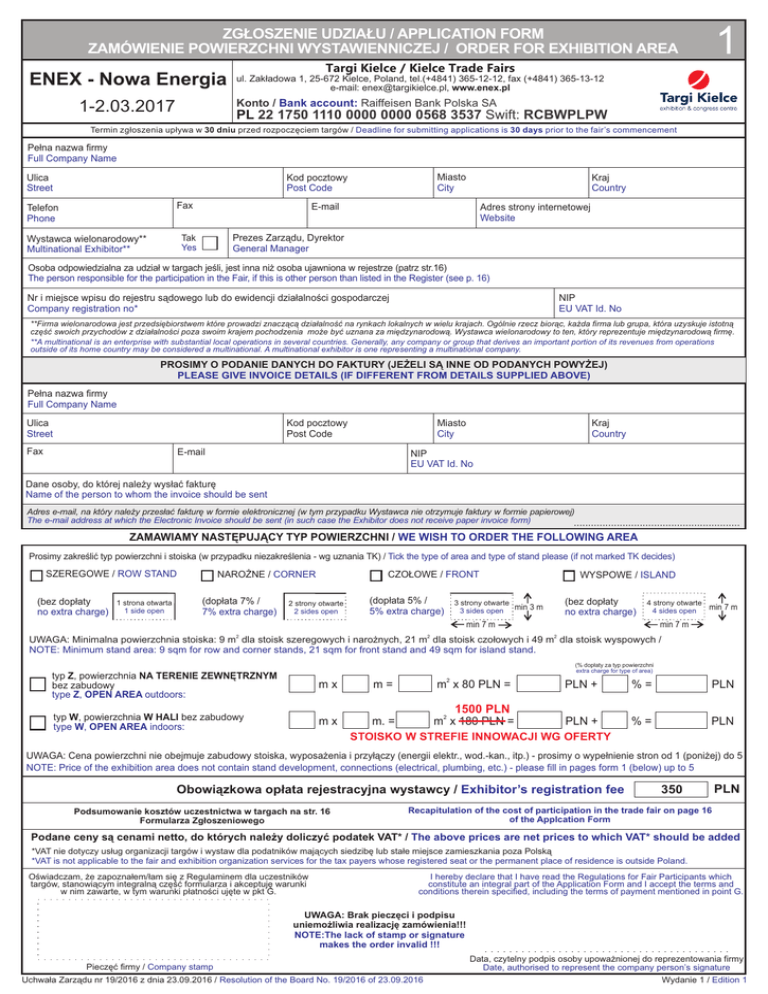 1 ZG£OSZENIE UDZIA£U / APPLICATION FORM ZAMÓWIENIE POWIERZCHNI WYSTAWIENNICZEJ / ORDER FOR EXHIBITION AREA ENEX - Nowa Energia Targi Kielce / Kielce Trade Fairs ul. Zak³adowa 1, 25-672 Kielce, Poland, tel.(+4841) 365-12-12, fax (+4841) 365-13-12 e-mail: [email protected], www.enex.pl Konto / Bank account: Raiffeisen Bank Polska SA 1-2.03.2017 PL 22 1750 1110 0000 0000 0568 3537 Swift: RCBWPLPW Termin zg³oszenia up³ywa w 30 dniu przed rozpoczêciem targów / Deadline for submitting applications is 30 days prior to the fair’s commencement Pe³na nazwa firmy Full Company Name Miasto City Kod pocztowy Post Code Ulica Street Fax Telefon Phone E-mail Adres strony internetowej Website Prezes Zarz¹du, Dyrektor General Manager Tak Yes Wystawca wielonarodowy** Multinational Exhibitor** Kraj Country Osoba odpowiedzialna za udzia³ w targach jeœli, jest inna ni¿ osoba ujawniona w rejestrze (patrz str.16) The person responsible for the participation in the Fair, if this is other person than listed in the Register (see p. 16) Nr i miejsce wpisu do rejestru s¹dowego lub do ewidencji dzia³alnoœci gospodarczej Company registration no* NIP EU VAT Id. No **Firma wielonarodowa jest przedsiêbiorstwem które prowadzi znacz¹c¹ dzia³alnoœæ na rynkach lokalnych w wielu krajach. Ogólnie rzecz bior¹c, ka¿da firma lub grupa, która uzyskuje istotn¹ czêœæ swoich przychodów z dzia³alnoœci poza swoim krajem pochodzenia mo¿e byæ uznana za miêdzynarodow¹. Wystawca wielonarodowy to ten, który reprezentuje miêdzynarodow¹ firmê. **A multinational is an enterprise with substantial local operations in several countries. Generally, any company or group that derives an important portion of its revenues from operations outside of its home country may be considered a multinational. A multinational exhibitor is one representing a multinational company. PROSIMY O PODANIE DANYCH DO FAKTURY (JE¯ELI S¥ INNE OD PODANYCH POWY¯EJ) PLEASE GIVE INVOICE DETAILS (IF DIFFERENT FROM DETAILS SUPPLIED ABOVE) Pe³na nazwa firmy Full Company Name Miasto City Kod pocztowy Post Code Ulica Street Fax E-mail Kraj Country NIP EU VAT Id. No Dane osoby, do której nale¿y wys³aæ fakturê Name of the person to whom the invoice should be sent Adres e-mail, na który nale¿y przes³aæ fakturê w formie elektronicznej (w tym przypadku Wystawca nie otrzymuje faktury w formie papierowej) The e-mail address at which the Electronic Invoice should be sent (in such case the Exhibitor does not receive paper invoice form) .......................................................... ZAMAWIAMY NASTÊPUJ¥CY TYP POWIERZCHNI / WE WISH TO ORDER THE FOLLOWING AREA Prosimy zakreœliæ typ powierzchni i stoiska (w przypadku niezakreœlenia - wg uznania TK) / Tick the type of area and type of stand please (if not marked TK decides) SZEREGOWE / ROW STAND (bez dop³aty no extra charge) 1 strona otwarta 1 side open NARO¯NE / CORNER (dop³ata 7% / 7% extra charge) CZO£OWE / FRONT 2 strony otwarte 2 sides open (dop³ata 5% / 5% extra charge) WYSPOWE / ISLAND (bez dop³aty no extra charge) 3 strony otwarte 3 sides open min 3 m 4 strony otwarte min 7 m 4 sides open min 7 m 2 2 min 7 m 2 UWAGA: Minimalna powierzchnia stoiska: 9 m dla stoisk szeregowych i naro¿nych, 21 m dla stoisk czo³owych i 49 m dla stoisk wyspowych / NOTE: Minimum stand area: 9 sqm for row and corner stands, 21 sqm for front stand and 49 sqm for island stand. (% dop³aty za typ powierzchni extra charge for type of area) typ Z, powierzchnia NA TERENIE ZEWNÊTRZNYM bez zabudowy type Z, OPEN AREA outdoors: mx m= m x 80 PLN = typ W, powierzchnia W HALI bez zabudowy type W, OPEN AREA indoors: mx m. = m x 180 PLN = 2 2 PLN + %= PLN PLN + %= PLN 1500 PLN STOISKO W STREFIE INNOWACJI WG OFERTY UWAGA: Cena powierzchni nie obejmuje zabudowy stoiska, wyposa¿enia i przy³¹czy (energii elektr., wod.-kan., itp.) - prosimy o wype³nienie stron od 1 (poni¿ej) do 5 NOTE: Price of the exhibition area does not contain stand development, connections (electrical, plumbing, etc.) - please fill in pages form 1 (below) up to 5 Obowi¹zkowa op³ata rejestracyjna wystawcy / Exhibitor’s registration fee Podsumowanie kosztów uczestnictwa w targach na str. 16 Formularza Zg³oszeniowego 350 PLN Recapitulation of the cost of participation in the trade fair on page 16 of the Applcation Form Podane ceny s¹ cenami netto, do których nale¿y doliczyæ podatek VAT* / The above prices are net prices to which VAT* should be added *VAT nie dotyczy us³ug organizacji targów i wystaw dla podatników maj¹cych siedzibê lub sta³e miejsce zamieszkania poza Polsk¹ *VAT is not applicable to the fair and exhibition organization services for the tax payers whose registered seat or the permanent place of residence is outside Poland. Oœwiadczam, ¿e zapozna³em/³am siê z Regulaminem dla uczestników targów, stanowi¹cym integraln¹ czêœæ formularza i akceptujê warunki w nim zawarte, w tym warunki p³atnoœci ujête w pkt G. I hereby declare that I have read the Regulations for Fair Participants which constitute an integral part of the Application Form and I accept the terms and conditions therein specified, including the terms of payment mentioned in point G. UWAGA: Brak pieczêci i podpisu uniemo¿liwia realizacjê zamówienia!!! NOTE:The lack of stamp or signature makes the order invalid !!! Pieczêæ firmy / Company stamp Uchwa³a Zarz¹du nr 19/2016 z dnia 23.09.2016 / Resolution of the Board No. 19/2016 of 23.09.2016 Data, czytelny podpis osoby upowa¿nionej do reprezentowania firmy Date, authorised to represent the company person’s signature Wydanie 1 / Edition 1