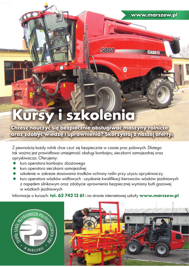 www.marszew.pl Kursy i szkolenia Chcesz nauczyć się bezpiecznie obsługiwać maszyny rolnicze oraz zdobyć wiedzę i uprawnienia? Skorzystaj z naszej oferty. Z pewnością każdy rolnik chce czuć się bezpiecznie w czasie prac polowych. Dlatego tak ważna jest prawidłowa umiejętność obsługi kombajnu, sieczkarni samojezdnej oraz opryskiwacza. Oferujemy: kurs operatora kombajnu zbożowego kurs operatora sieczkarni samojezdnej szkolenie w zakresie stosowania środków ochrony roślin przy użyciu opryskiwaczy. kurs operatora wózków widłowych - uzyskanie kwalifikacji kierowców wózków jezdniowych z napędem silnikowym oraz zdobycie uprawnienia bezpiecznej wymiany butli gazowej w wózkach jezdniowych Informacje o kursach: tel. 62 742 13 61 i na stronie internetowej szkoły www.marszew.pl ... .