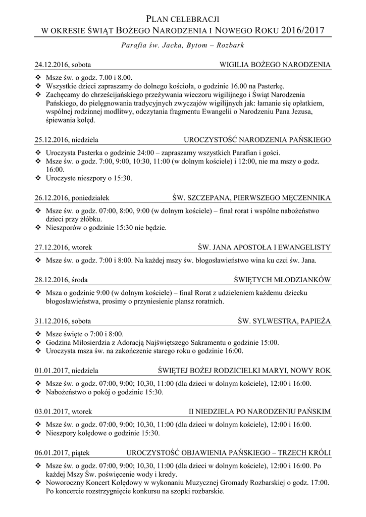 PLAN CELEBRACJI W OKRESIE ŚWIĄT BOŻEGO NARODZENIA I NOWEGO R OKU 2016/2017 Parafia św. Jacka, Bytom – Rozbark 24.12.2016, sobota WIGILIA BOŻEGO NARODZENIA Msze św. o godz. 7.00 i 8.00. Wszystkie dzieci zapraszamy do dolnego kościoła, o godzinie 16.00 na Pasterkę. Zachęcamy do chrześcijańskiego przeżywania wieczoru wigilijnego i Świąt Narodzenia Pańskiego, do pielęgnowania tradycyjnych zwyczajów wigilijnych jak: łamanie się opłatkiem, wspólnej rodzinnej modlitwy, odczytania fragmentu Ewangelii o Narodzeniu Pana Jezusa, śpiewania kolęd. 25.12.2016, niedziela UROCZYSTOŚĆ NARODZENIA PAŃSKIEGO Uroczysta Pasterka o godzinie 24:00 – zapraszamy wszystkich Parafian i gości. Msze św. o godz. 7:00, 9:00, 10:30, 11:00 (w dolnym kościele) i 12:00, nie ma mszy o godz. 16:00. Uroczyste nieszpory o 15:30. 26.12.2016, poniedziałek ŚW. SZCZEPANA, PIERWSZEGO MĘCZENNIKA Msze św. o godz. 07:00, 8:00, 9:00 (w dolnym kościele) – finał rorat i wspólne nabożeństwo dzieci przy żłóbku. Nieszporów o godzinie 15:30 nie będzie. 27.12.2016, wtorek ŚW. JANA APOSTOŁA I EWANGELISTY Msze św. o godz. 7:00 i 8:00. Na każdej mszy św. błogosławieństwo wina ku czci św. Jana. 28.12.2016, środa ŚWIĘTYCH MŁODZIANKÓW Msza o godzinie 9:00 (w dolnym kościele) – finał Rorat z udzieleniem każdemu dziecku błogosławieństwa, prosimy o przyniesienie plansz roratnich. 31.12.2016, sobota ŚW. SYLWESTRA, PAPIEŻA Msze święte o 7:00 i 8:00. Godzina Miłosierdzia z Adoracją Najświętszego Sakramentu o godzinie 15:00. Uroczysta msza św. na zakończenie starego roku o godzinie 16:00. 01.01.2017, niedziela ŚWIĘTEJ BOŻEJ RODZICIELKI MARYI, NOWY ROK Msze św. o godz. 07:00, 9:00; 10,30, 11:00 (dla dzieci w dolnym kościele), 12:00 i 16:00. Nabożeństwo o pokój o godzinie 15:30. 03.01.2017, wtorek II NIEDZIELA PO NARODZENIU PAŃSKIM Msze św. o godz. 07:00, 9:00; 10,30, 11:00 (dla dzieci w dolnym kościele), 12:00 i 16:00. Nieszpory kolędowe o godzinie 15:30. 06.01.2017, piątek UROCZYSTOŚĆ OBJAWIENIA PAŃSKIEGO – TRZECH KRÓLI Msze św. o godz. 07:00, 9:00; 10,30, 11:00 (dla dzieci w dolnym kościele), 12:00 i 16:00. Po każdej Mszy Św. poświęcenie wody i kredy. Noworoczny Koncert Kolędowy w wykonaniu Muzycznej Gromady Rozbarskiej o godz. 17:00. Po koncercie rozstrzygnięcie konkursu na szopki rozbarskie.