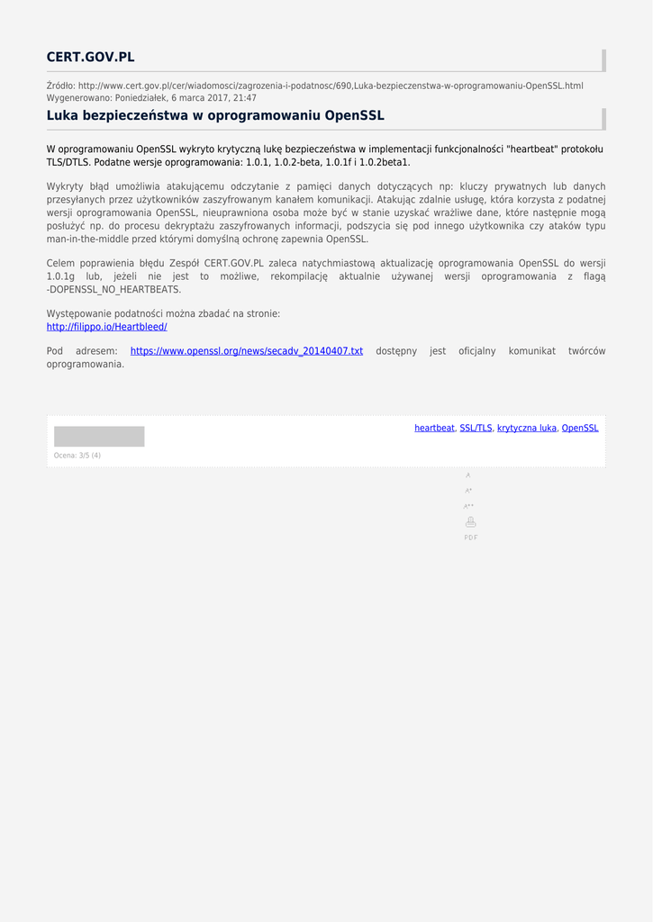 CERT.GOV.PL Źródło: http://www.cert.gov.pl/cer/wiadomosci/zagrozenia-i-podatnosc/690,Luka-bezpieczenstwa-w-oprogramowaniu-OpenSSL.html Wygenerowano: Poniedziałek, 6 marca 2017, 21:47 Luka bezpieczeństwa w oprogramowaniu OpenSSL W oprogramowaniu OpenSSL wykryto krytyczną lukę bezpieczeństwa w implementacji funkcjonalności "heartbeat" protokołu TLS/DTLS. Podatne wersje oprogramowania: 1.0.1, 1.0.2-beta, 1.0.1f i 1.0.2beta1. Wykryty błąd umożliwia atakującemu odczytanie z pamięci danych dotyczących np: kluczy prywatnych lub danych przesyłanych przez użytkowników zaszyfrowanym kanałem komunikacji. Atakując zdalnie usługę, która korzysta z podatnej wersji oprogramowania OpenSSL, nieuprawniona osoba może być w stanie uzyskać wrażliwe dane, które następnie mogą posłużyć np. do procesu dekryptażu zaszyfrowanych informacji, podszycia się pod innego użytkownika czy ataków typu man-in-the-middle przed którymi domyślną ochronę zapewnia OpenSSL. Celem poprawienia błędu Zespół CERT.GOV.PL zaleca natychmiastową aktualizację oprogramowania OpenSSL do wersji 1.0.1g lub, jeżeli nie jest to możliwe, rekompilację aktualnie używanej wersji oprogramowania z flagą -DOPENSSL_NO_HEARTBEATS. Występowanie podatności można zbadać na stronie: http://filippo.io/Heartbleed/ Pod adresem: https://www.openssl.org/news/secadv_20140407.txt oprogramowania. dostępny jest oficjalny komunikat twórców heartbeat, SSL/TLS, krytyczna luka, OpenSSL Ocena: 3/5 (4)