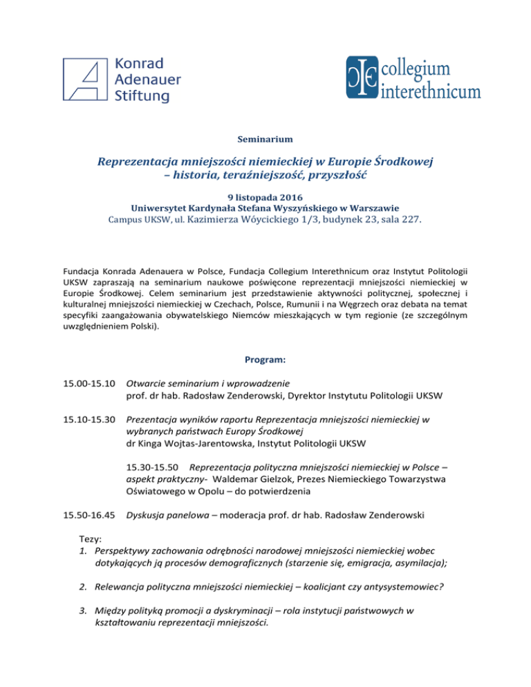 Seminarium Reprezentacja mniejszości niemieckiej w Europie Środkowej – historia, teraźniejszość, przyszłość 9 listopada 2016 Uniwersytet Kardynała Stefana Wyszyńskiego w Warszawie Campus UKSW, ul. Kazimierza Wóycickiego 1/3, budynek 23, sala 227. Fundacja Konrada Adenauera w Polsce, Fundacja Collegium Interethnicum oraz Instytut Politologii UKSW zapraszają na seminarium naukowe poświęcone reprezentacji mniejszości niemieckiej w Europie Środkowej. Celem seminarium jest przedstawienie aktywności politycznej, społecznej i kulturalnej mniejszości niemieckiej w Czechach, Polsce, Rumunii i na Węgrzech oraz debata na temat specyfiki zaangażowania obywatelskiego Niemców mieszkających w tym regionie (ze szczególnym uwzględnieniem Polski). Program: 15.00-15.10 Otwarcie seminarium i wprowadzenie prof. dr hab. Radosław Zenderowski, Dyrektor Instytutu Politologii UKSW 15.10-15.30 Prezentacja wyników raportu Reprezentacja mniejszości niemieckiej w wybranych państwach Europy Środkowej dr Kinga Wojtas-Jarentowska, Instytut Politologii UKSW 15.30-15.50 Reprezentacja polityczna mniejszości niemieckiej w Polsce – aspekt praktyczny- Waldemar Gielzok, Prezes Niemieckiego Towarzystwa Oświatowego w Opolu – do potwierdzenia 15.50-16.45 Dyskusja panelowa – moderacja prof. dr hab. Radosław Zenderowski Tezy: 1. Perspektywy zachowania odrębności narodowej mniejszości niemieckiej wobec dotykających ją procesów demograficznych (starzenie się, emigracja, asymilacja); 2. Relewancja polityczna mniejszości niemieckiej – koalicjant czy antysystemowiec? 3. Między polityką promocji a dyskryminacji – rola instytucji państwowych w kształtowaniu reprezentacji mniejszości. Uczestnicy dyskusji: prof. dr hab. Aleksandra Trzcielińska-Polus, Uniwersytet Opolski – do potwierdzenia dr Anna Drożdż-Kwiatkowska, Ośrodek Studiów Wschodnich im. Marka Karpia Dobiesław Rzemieniewski, Naczelnik Wydziału Mniejszości Narodowych i Etnicznych, Departament Wyznań Religijnych oraz Mniejszości Narodowych i Etnicznych MSWiA Autorzy raportów - mgr Martyna Wasiuta (UKSW), mgr Dominik Hejj (UKSW), mgr Jakub Pieńkowski (Społeczna Akademia Nauk w Łodzi) 16.45 Zakończenie seminarium Koordynator: dr Kinga Wojtas-Jarentowska [email protected]
