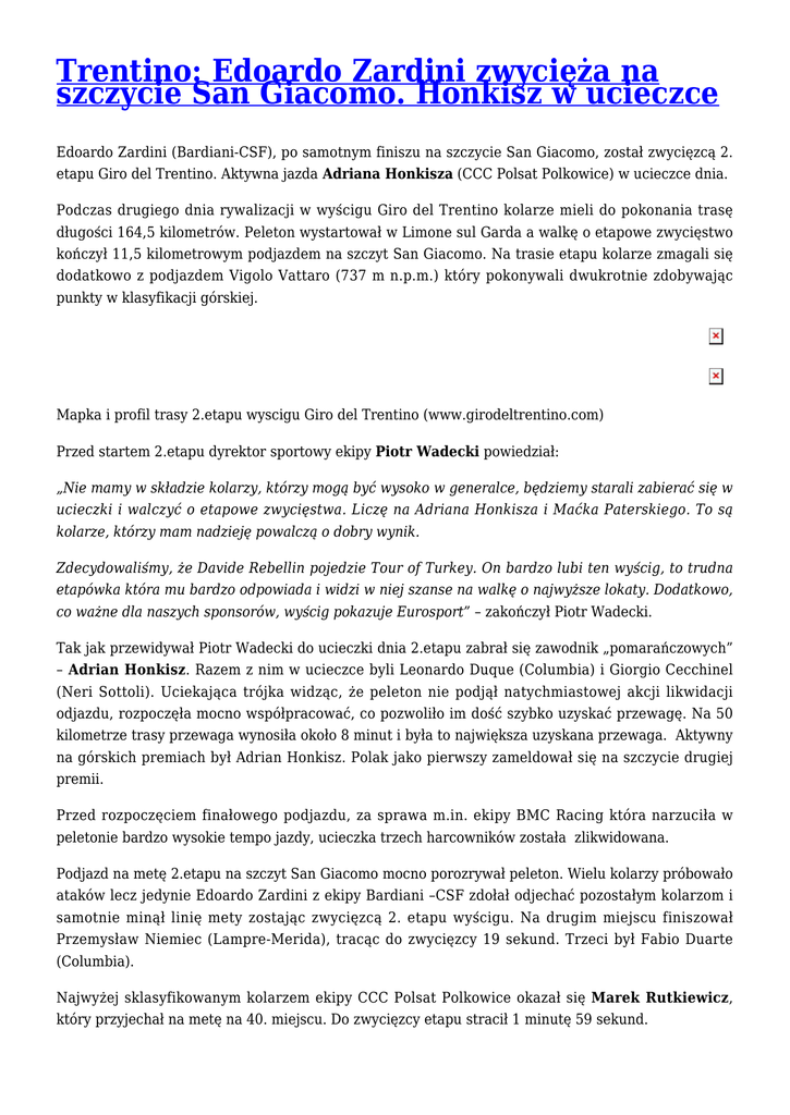 Trentino: Edoardo Zardini zwycięża na szczycie San Giacomo. Honkisz w ucieczce Edoardo Zardini (Bardiani-CSF), po samotnym finiszu na szczycie San Giacomo, został zwycięzcą 2. etapu Giro del Trentino. Aktywna jazda Adriana Honkisza (CCC Polsat Polkowice) w ucieczce dnia. Podczas drugiego dnia rywalizacji w wyścigu Giro del Trentino kolarze mieli do pokonania trasę długości 164,5 kilometrów. Peleton wystartował w Limone sul Garda a walkę o etapowe zwycięstwo kończył 11,5 kilometrowym podjazdem na szczyt San Giacomo. Na trasie etapu kolarze zmagali się dodatkowo z podjazdem Vigolo Vattaro (737 m n.p.m.) który pokonywali dwukrotnie zdobywając punkty w klasyfikacji górskiej. Mapka i profil trasy 2.etapu wyscigu Giro del Trentino (www.girodeltrentino.com) Przed startem 2.etapu dyrektor sportowy ekipy Piotr Wadecki powiedział: „Nie mamy w składzie kolarzy, którzy mogą być wysoko w generalce, będziemy starali zabierać się w ucieczki i walczyć o etapowe zwycięstwa. Liczę na Adriana Honkisza i Maćka Paterskiego. To są kolarze, którzy mam nadzieję powalczą o dobry wynik. Zdecydowaliśmy, że Davide Rebellin pojedzie Tour of Turkey. On bardzo lubi ten wyścig, to trudna etapówka która mu bardzo odpowiada i widzi w niej szanse na walkę o najwyższe lokaty. Dodatkowo, co ważne dla naszych sponsorów, wyścig pokazuje Eurosport” – zakończył Piotr Wadecki. Tak jak przewidywał Piotr Wadecki do ucieczki dnia 2.etapu zabrał się zawodnik „pomarańczowych” – Adrian Honkisz. Razem z nim w ucieczce byli Leonardo Duque (Columbia) i Giorgio Cecchinel (Neri Sottoli). Uciekająca trójka widząc, że peleton nie podjął natychmiastowej akcji likwidacji odjazdu, rozpoczęła mocno współpracować, co pozwoliło im dość szybko uzyskać przewagę. Na 50 kilometrze trasy przewaga wynosiła około 8 minut i była to największa uzyskana przewaga. Aktywny na górskich premiach był Adrian Honkisz. Polak jako pierwszy zameldował się na szczycie drugiej premii. Przed rozpoczęciem finałowego podjazdu, za sprawa m.in. ekipy BMC Racing która narzuciła w peletonie bardzo wysokie tempo jazdy, ucieczka trzech harcowników została zlikwidowana. Podjazd na metę 2.etapu na szczyt San Giacomo mocno porozrywał peleton. Wielu kolarzy próbowało ataków lecz jedynie Edoardo Zardini z ekipy Bardiani –CSF zdołał odjechać pozostałym kolarzom i samotnie minął linię mety zostając zwycięzcą 2. etapu wyścigu. Na drugim miejscu finiszował Przemysław Niemiec (Lampre-Merida), tracąc do zwycięzcy 19 sekund. Trzeci był Fabio Duarte (Columbia). Najwyżej sklasyfikowanym kolarzem ekipy CCC Polsat Polkowice okazał się Marek Rutkiewicz, który przyjechał na metę na 40. miejscu. Do zwycięzcy etapu stracił 1 minutę 59 sekund. Wyniki Giro del Trentino, etap 2: Limone sul Garda – San Giacomo di Brentonico (164.5 km); 1. Edoardo Zardini (Bardiani-CSF) 4:25:39 2. Przemyslaw Niemiec (Lampre-Merida) 0:19 3. Fabio Duarte (Colombia) 40. Marek Rutkiewicz 1:59 48. Mateusz Taciak 3:02 55. Łukasz Owsian 4:26 67. Adrian Honkisz 6:20 73. Bartłomiej Matysiak 7:27 92. Jarosław Marycz 10:12 102. Maciej Paterski 11:51 104. Josef Cerny info: A.Dyszyński + naszosie.pl