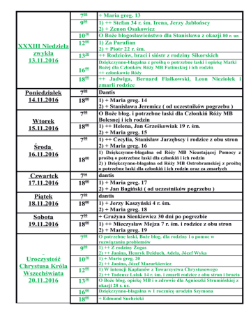 700 900 XXXIII Niedziela zwykła 13.11.2016 1030 1200 1330 1600 1800 Poniedziałek 14.11.2016 700 1800 700 Wtorek 15.11.2016 1800 700 Środa 16.11.2016 00 18 Czwartek 17.11.2016 700 1800 Piątek 18.11.2016 700 1800 Sobota 19.11.2016 700 1800 700 900 Uroczystość Chrystusa Króla Wszechświata 20.11.2016 1030 1200 1330 1600 1800 + Maria greg. 13 1) ++ Stefan 34 r. śm. Irena, Jerzy Jabłońscy 2) + Zenon Osakowicz O Boże błogosławieństwo dla Stanisława z okazji 80 r. ur. 1) Za Parafian 2) + Piotr 22 r. śm. ++ Rodziców, braci i sióstr z rodziny Sikorskich Dziękczynno-błagalna z prośbą o potrzebne łaski i opiekę Matki Bożej dla Członków Róży MB Fatimskiej i ich rodzin ++ członkowie Róży ++ Jadwiga, Bernard Fiałkowski, Leon Nieziołek i zmarli rodzice Dantis 1) + Maria greg. 14 2) + Stanisława Jeremicz ( od uczestników pogrzebu ) O Boże błog. i potrzebne łaski dla Członkiń Róży MB Bolesnej i ich rodzin 1) ++ Helena, Jan Grześkowiak 19 r. śm. 2) + Maria greg. 15 1) ++ Cecylia, Stanisław Jarzębscy i rodzice z obu stron 2) + Maria greg. 16 1) Dziękczynno-błagalna od Róży MB Nieustającej Pomocy z prośbą o potrzebne łaski dla członkiń i ich rodzin 2) ) Dziękczynno-błagalna od Róży MB Ostrobramskiej z prośbą o potrzebne łaski dla członkiń i ich rodzin oraz za zmarłych dantis 1) + Maria greg. 17 2) + Jan Bagiński ( od uczestników pogrzebu ) dantis 1) + Jerzy Kaszyński 4 r. śm. 2) + Maria greg. 18 + Grażyna Sienkiewicz 30 dni po pogrezbie 1) ++ Mieczysław Mejza 7 r. śm. i rodzice z obu stron 2) + Maria greg. 19 O potrzebne łaski, Boże błog. dla rodziny i o pomoc w rozwiązaniu problemów 1) ++ Z rodziny Żogas 2) ++ Janina, Henryk Dziduch, Adela, Józef Wyka 1) + Maria greg. 20 2) ++ Janina, Józef Mazurkiewicz 1) W intencji Kapłanów z Towarzystwa Chrystusowego 2) ++ Tadeusz Lalak 14 r. śm. i zmarli rodzice z obu stron i bracia O Boże błog. opiekę MB i o zdrowie dla Agnieszki Strumińskiej z okazji 28 r. ur. Dziękczynno-błagalna w 1 rocznicę urodzin Szymona + Edmund Suchcicki