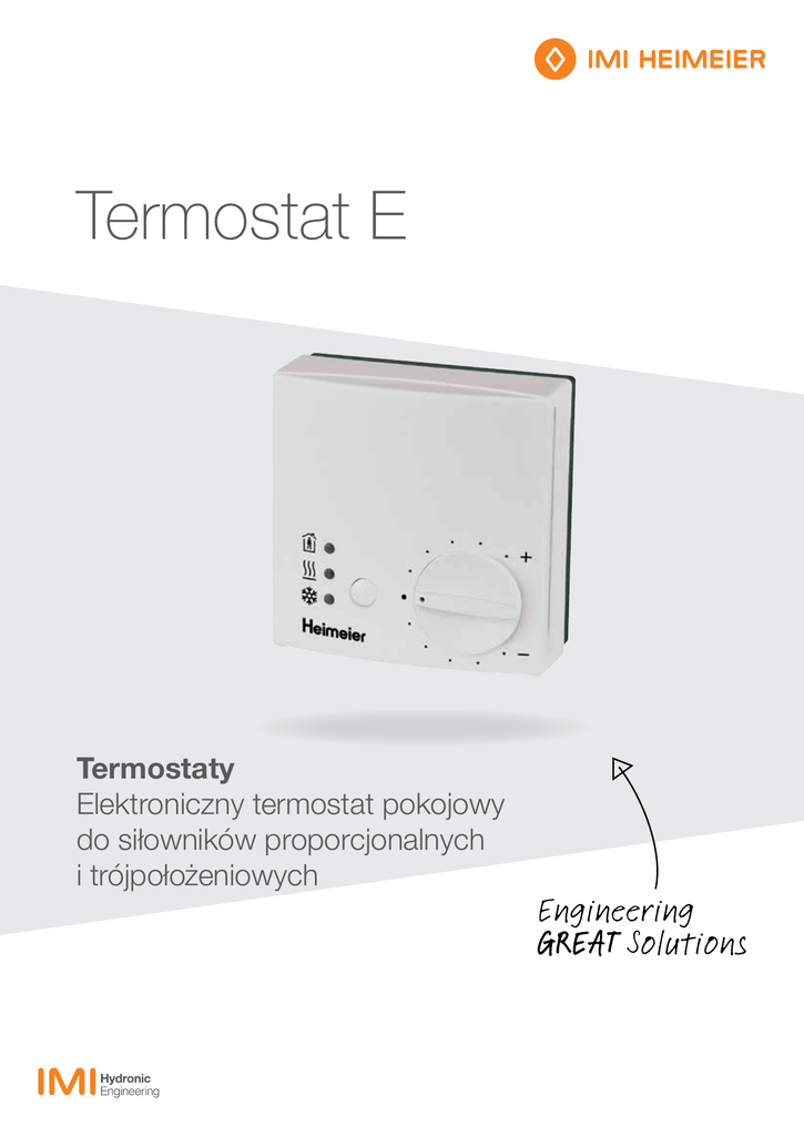 Termostat E Termostaty Elektroniczny termostat pokojowy do siłowników proporcjonalnych i trójpołożeniowych IMI HEIMEIER / Termostaty i siłowniki / Termostat E Termostat E Termostaty pokojowe E 1 oraz E 3 w połączeniu z odpowiednimi siłownikami znajdują zastosowanie w instalacjach grzewczych i chłodniczych. Zwłaszcza w tych przypadkach, gdzie są podwyższone wymagania dotyczące dokładnej regulacja temperatury. Wyróżniające cechy >> Łatwe obniżenie temperatury za pomocą przycisku obecności >> Nastawiane górne i dolne wartości zakresu wielkości zadanej >> Elastyczność stosowania dzięki możliwości dopasowania parametrów regulacji >> W termostacie E 3 można ustawić sygnał wyjściowy z modulowaną szerokością impulsu (PWM) Opis Termostaty E 1 i E 3 są sterowanymi mikroprocesorowo elektronicznymi regulatorami typu PI temperatury pokojowej z wbudowanym czujnikiem i zmienianą nastawą. Termostat E 1 z płynną charakterystyką regulacji (0-10 V) umożliwia przyłączenie proporcjonalnych siłowników nastawczych, np. EMO 1. Termostat E 3 z trójpołożeniowym sygnałem wyjściowym stosowany jest do siłowników trójpołożeniowych, np. E 3 lub po ustawieniu sygnału wyjściowego na sygnał o modulowanej szerokości impulsu (PWM) do nastawników dwupołożeniowych, np. EMO T. Wartość zadaną nastawia się pomiędzy 10°C a 30°C. Za pomocą ukrytych ograniczników można dobrać górne i dolne ograniczenie zakresu wielkości zadanej. Stosowny przycisk obecności umożliwia na przykład podczas trybu grzania obniżenie temperatury pokojowej o ok. 4 K. Lampki kontrolne sygnalizują stan pracy, tj. obecność grzania lub chłodzenia. Do dwóch wejść dla bezpotencjałowych styków NC można podłączyć zewnętrzny zegar przełączający do obniżania temperatury (Xt) lub np. zmiany trybu pracy z ogrzewania na wychładzanie (c/o). Dodatkowo istnieje możliwość podłączenia zewnętrznego czujnika temperatury (Text), czujnika punktu rosy (TP) i zmiany wartości zadanej (w). Termostaty E 1 i E 3 są przeznaczone do montażu naściennego i na puszkach rozdzielczych. Budowa Termostat E 1. Sygnalizacja trybu chłodzenia 2. Sygnalizacja trybu grzania 3. Sygnalizacja obecności 4. Nastawa wartoci zadanej 5. Przycisk obecności 6. Bezpiecznik (w Termostacie E3) 7. Wewnętrzny przełącznik 8. Czujnik 2 Działanie Trójpołożeniowy sygnał wyjściowy do regulacji PI dla siłowników trójpołożeniowych. Tryb „grzanie” można za pomocą zewnętrznego przełącznika (change over) przestawić na tryb „chłodzenie”. Sygnał wyjściowy o modulowanej szerokości impulsu do regulacji P(I) dla siłowników dłwupołożeniowych. W trybie „grzanie” i „chłodzenie” wyjście regulatora y1 wysyła sygnał „grzać”, a wyjście y2 sygnał „chłodzić”. W trybie „grzanie” lub „chłodzenie” mo˝na za pomocą zewnętrznego przełącznika (change over) spowodować wysyłanie na wyjściu regulatora y1 zmianę sygnału „grzać” na „chłodzić”. W przypadku termostatów E 1 i E 3 sygnał sterujący z przycisku obecności lub zewnętrznego przełącznika zmienia odpowiednio wartość zadaną o ok. 4 K. Fabryczne nastawy parametrów regulacji można dopasować do aktualnych warunków danej instalacji (patrz dane techniczne). Nastawione wartości nie zmieniają się nawet po zaniku napięcia. Zmierzona temperatura powietrza w pomieszczeniu (xi) jest porównywana z wartością zadaną (xs). Wynikające stąd odchyłki są wzmacniane zgodnie z nastawionym współczynnikiem proporcjonalności (xp) i przetwarzane na następujące sygnały wyjściowe: Termostat E 1 Ciągły sygnał wyjściowy do regulacji P(I) siłowników proporcjonalnych. Dla trybu pracy „grzanie” i „chłodzenie” wyjście regulatora y1 wysyła sygnał „grzać”, a wyjście y2 sygnał „chłodzić”. Dla trybu pracy „grzanie” lub „chłodzenie” można za pomocą zewnętrznego przełącznika (change over) spowodować wysyłanie na wyjściu regulatora y1 zmianę sygnału „grzać” na „chłodzić”. Termostat E 3 Wewnętrzny przełącznik umożliwia dobór różnych sygnałów wyjściowych. Wykres działania Tryb działania grzanie i/ lub chłodzenie Dla temperatur normalnych Xtn Xp E3 Xp E3 100% 10V 0% 0V X tn 4K Xp E1 100% 10V y1 5V 4K Xp E1 50% Dla temperatur obniżonych y1 y2 50% 5V 0% 0V xi Xtr y2 xi XS XS Schemat połączeń Thermostat E 1 1960-01.500 sequence change-over B 8 7 6 w TP E T ext ws 7 1 6 10 c/o E wsbr 1 0-10V dead zone RH = 100% shift setpoint 5 y2 gn y1 gn Xt change-over 0-10V 0-10V dead zone 4 3 10 c/o 1860 9 RH = 100% T int ⊥ change-over shift setpoint 1 ⊥ B/A 4 3 Xt 5 y1 gn 1860 S1/1 24 V Xp; (Tn); Xt A 0-10V Xp; Tn; Xt 2 E br 1860 S2 Xs 1 ws br Thermostat E 3 8 7 10 6 w T ext c/o dead zone RH = 100% T int ⊥ 9 change-over shift setpoint 1 ⊥ PI S1/2 B/A B 3 TP Xt 4 5 EMO T/ EMOtec 4 EMO T/ EMOtec 5 7 6 c/o 10 3 Xt 4 5 gn br EMO 3 1880 S1/2 S1/1 shift setpoint 2 Xp; Tn; Xt; Ty change-over sequence dead zone P(I) A RH = 100% Xp; (Tn); Xt; Tp Xs 24V PI (3pt) S1/2 = Off P (2pt) S1/2 = On S2 change-over 1980-01.500 ws 3 IMI HEIMEIER / Termostaty i siłowniki / Termostat E Zastosowanie Regulatory temperatury pokojowej do regulacji płynnej i trójpołożeniowej, tj termostat E 1 lub termostat E 3 są stosowane w połączeniu z odpowiednimi siłownikami (np. EMO 1 i EMO 3) w technice grzewczej, wentylacyjnej i klimatyzacyjnej. Do regulacji temperatury w poszczególnych pomieszczeniach mieszkalnych i użytkowych z grzejnikami, ogrzewaniem podłogowym, chłodzeniem sufitowym lub kurtynami stosuje się regulatory ciągłe i trójpołożeniowe. Optymalne wyniki regulacji otrzymuje się szczególnie w przypadku podwyższonych wymagań co do dokładności regulacji lub gdy jest ona utrudniona. Do regulacji prawie ciągłej za pomocą siłowników dwupołożeniowych (np. EMO T) można w termostacie E 3 zastosować sygnał wyjściowy o modulowanej 