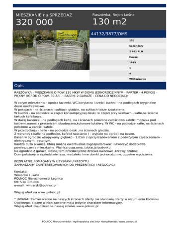 MIESZKANIE na SPRZEDAŻ 320 000 Raszówka, Rejon Leśna 130 m2 44132/3877/OMS 130 Secondary 2 462 PLN House 1945 1 4 WithWindow Opis RASZÓWKA - MIESZKANIE O POW.130 MKW W DOMU JEDNORODZINNYM - PARTER - 4 POKOJE PIĘKNY OGRÓD O POW. 30 AR . - BASEN- 2 GARAŻE - CENA DO NEGOCJACJI W całym mieszkaniu - oprócz łazienki, WC,korytarza i części kuchni - na podłogach oryginalne deski modrzewiowe. W pokojach - na ścianach i sufitach gładzie, na sufitach także sztukateria. W kuchni - na podłodze w części konsumpcyjnej deski, w części przy szafkach - kafle,na ścianie fartuch kafelkowy. W dużej łazience - na podłogach kafle, na i ścianach położone całościowo kafelki,mozajka pod lustrem,wanna z prysznicem obudowana,kolorowe luksfery. W WC - na podłodze kafle, na ścianach położone w całości kafelki. W przedpokoju - hallu - na podłodze deski ,na ścianach gładzie. Z werandy ( kafle na podłodze, kafelki naścianie ) - wyjście na ogród i na basen. Basen w ogrodzie wkopywany glęboko - 1,05m z oprzyrządowaniem z podwójnym czyszczeniem elektrycznym i ręcznym. Bardzo duża piwnica, którą można ewentualnie zagospodarować i utworzyć dodatkowe pomieszczenia mieszkalne. Piwnica osuszona, izlolacja budynku. Na ogrodzie 2 garaże, Rosną tam przedwojenne drzewa owocowe ,krzewy ozobne. Dom położony w sąsiedztwie lasu, niedaleko inne domki jednorodzinne, zupełne wyciszenie. BEZPŁATNIE POMAGAMY W UZYSKANIU KREDYTU ZAPRASZAMY ZAINTERESOWANYCH DO PREZENTACJI I NEGOCJACJI Kontakt: Winiarski Lukasz PÓŁNOC Nieruchomości Legnica tel: 534 335 866 e-mail: [email protected] Więcej ofert na www.polnoc.pl * UWAGA! Zamieszczone na naszych stronach oferty nie stanowią oferty w rozumieniu Kodeksu Cywilnego, a dane w nich zawarte mają jedynie charakter informacyjny. Więcej ofert znajdziesz na naszej stronie www.polnoc.pl PÓŁNOC Nieruchomości - ogólnopolska sieć biur nieruchomości www.polnoc.pl * UWAGA! Zamieszczone na naszych stronach oferty nie stanowią oferty w rozumieniu Kodeksu Cywilnego, a dane w nich zawarte mają jedynie charakter informacyjny. Łukasz Winiarski tel. 534-335-866 email: [email protected] PÓŁNOC Nieruchomości - ogólnopolska sieć biur nieruchomości www.polnoc.pl Powered by TCPDF (www.tcpdf.org)