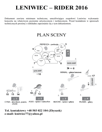 LENIWIEC – RIDER 2016 Dokument zawiera minimum techniczne, umożliwiające zespołowi Leniwiec wykonanie koncertu na właściwym poziomie artystycznym i technicznym. Przed kontaktem w sprawach technicznych prosimy o dokładne zapoznanie się z tym dokumentem. PLAN SCENY Tel. kontaktowy +48 503 022 104 (Zbyszek) e-mail: [email protected] INPUTLISTA nr instrument 1 2 stopa werbel 3 4 5 6 7 8 9 hi-hat tom tom floor tom overhead L overhead R gitara basowa WINIAL gitara solowa RUSEK gitara rytmiczna MUCHA wokal MUCHA 10 11 12 13 14 15 16 17 18 Mikrofon/Di/XLR statyw mikrofon dynamiczny Shure Beta 52 mikrofon dynamiczny SM 57, SM Beta 56 mikrofon pojemnościowy SM 81 mikrofon dynamiczny SM Beta 56 mikrofon dynamiczny SM Beta 56 mikrofon dynamiczny SM Beta 56 Mikrofon pojemnościowy SM 81 mikrofon pojemnościowy SM 81 XLR niski niski/klips mikrofon dynamiczny SM 57 niski, łamany mikrofon dynamiczny SM 57 niski, łamany mikrofon dynamiczny SM 58, Shure Beta 58 wokal AGIS mikrofon dynamiczny bezprzewodowy SM 58, Shure Beta 58 chórek CYNA mikrofon dynamiczny SM 58, Shure Beta 58 akordeon CYNA XLR, mikrofon własny, zasilany baterią puzon XLR, mikrofon własny, wymaga CYNA zasialania phantom saksofon XLR, mikrofon własny, zasilany AGIS baterią gitara akustyczna DiBox RUSEK niski klips klips klips wysoki, łamany wysoki, łamany insert gate gate gate gate compressor wysoki, łamany compressor wysoki, łamany compressor wysoki, łamany compressor TORY MONITOROWE nr muzyk toru 1 CYNA (akordeon, puzon, chórek) instrumenty w torze akordeon(14) , puzon(15), chórek(13), wokal Muchy(11), gitara akustyczna(17) 2 AGIS (wokal, saksofon) wokal Agis(12), saksofon(16), gitara Ruska(9), gitara akustyczna(17) 3 MUCHA (wokal, gitara) wokal Muchy(11), wokal Agis(12) 4 RUSEK (gitary) wokal Muchy(11), wokal Agis(12), saksofon(16), puzon(15), akordeon(14), gitara akustyczna(17) 5 PEPESZA (perkusja) wokal Muchy(11), wokal Agis(12), stopa(1), werbel(2), gitara basowa(8), gitara Ruska(9), gitara akustyczna(17) Uwaga: na szczególnie dużych scenach dodatkowo stopa+werbel do wszystkich monitorów WARUNKI OGÓLNE: Cały system nagłośnieniowy MUSI być prawidłowo uziemiony. W przypadku braku uziemienia lub ryzyka porażenia muzyków prądem koncert nie rozpocznie się do czasu usunięcia problemu !!! Nie uznajemy gąbek na mikrofony „eliminujących kopanie”. Organizator musi liczyć się z tym, że w przypadku braku rozwiązania „kopiących” mikrofonów zespół może odmówić wykonania koncertu. - zamykana garderoba dla 6 osób lub namiot pilnowany przez ochronę. W garderobie: wieszak, 6 krzeseł, stolik, lustro, odpowiednie oświetlenie. - ciepły posiłek (dla 6 osób, w tym 2x wegetariański) - woda mineralna niegazowana - kawa i herbata - bezpieczne miejsce parkingowe dla samochodu z przyczepą - noclegi (jeśli zawarto w umowie) - pokoje 1-osobowy, 2-osobowy, 3-osobowy. Przy hotelu musi być strzeżony parking. Prosimy o przesłanie danych muzyków potrzebnych do zameldowania do hotelu w celu usprawnienia/skrócenia procedury meldunkowej Jeśli powyższe wymagania z różnych względów nie mogą być spełnione każdorazowo prosimy o kontakt w tej sprawie w celu znalezienia wspólnego rozwiązania problemu Tel. kontaktowy +48 503 022 104 (Zbyszek) e-mail: [email protected] Rider techniczny stanowi integralną część umowy, Niespełnienie jego warunków oznacza niewywiązanie się z warunków umowy zawartej z zespołem