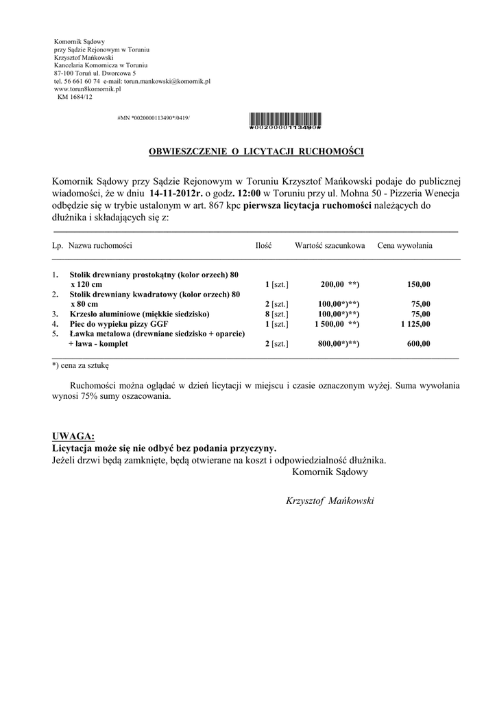 Komornik Sądowy przy Sądzie Rejonowym w Toruniu Krzysztof Mańkowski Kancelaria Komornicza w Toruniu 87-100 Toruń ul. Dworcowa 5 tel. 56 661 60 74 e-mail: [email protected] www.torun8komornik.pl KM 1684/12 #MN *0020000113490*/0419/ *0020000113490* OBWIESZCZENIE O LICYTACJI RUCHOMOŚCI Komornik Sądowy przy Sądzie Rejonowym w Toruniu Krzysztof Mańkowski podaje do publicznej wiadomości, że w dniu 14-11-2012r. o godz. 12:00 w Toruniu przy ul. Mohna 50 - Pizzeria Wenecja odbędzie się w trybie ustalonym w art. 867 kpc pierwsza licytacja ruchomości należących do dłużnika i składających się z: ________________________________________________________________________________________________ Lp. Nazwa ruchomości Ilość Wartość szacunkowa Cena wywołania _________________________________________________________________________________________________ 1. 2. 3. 4. 5. Stolik drewniany prostokątny (kolor orzech) 80 x 120 cm Stolik drewniany kwadratowy (kolor orzech) 80 x 80 cm Krzesło aluminiowe (miękkie siedzisko) Piec do wypieku pizzy GGF Ławka metalowa (drewniane siedzisko + oparcie) + ława - komplet 1 [szt.] 200,00 **) 150,00 2 [szt.] 8 [szt.] 1 [szt.] 100,00*)**) 100,00*)**) 1 500,00 **) 75,00 75,00 1 125,00 2 [szt.] 800,00*)**) 600,00 _______________________________________________________________________________________________________________________ *) cena za sztukę Ruchomości można oglądać w dzień licytacji w miejscu i czasie oznaczonym wyżej. Suma wywołania wynosi 75% sumy oszacowania. UWAGA: Licytacja może się nie odbyć bez podania przyczyny. Jeżeli drzwi będą zamknięte, będą otwierane na koszt i odpowiedzialność dłużnika. Komornik Sądowy Krzysztof Mańkowski