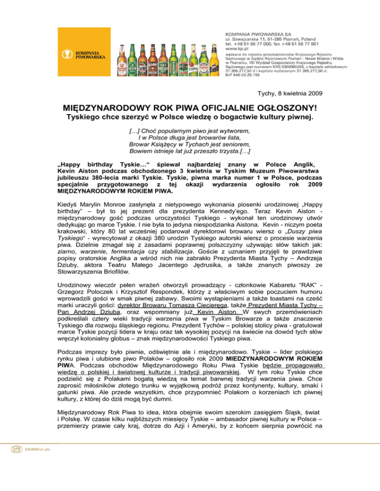 Tychy, 8 kwietnia 2009 MIĘDZYNARODOWY ROK PIWA OFICJALNIE OGŁOSZONY! Tyskiego chce szerzyć w Polsce wiedzę o bogactwie kultury piwnej. […] Choć popularnym piwo jest wytworem, I w Polsce długa jest browarów lista, Browar Książęcy w Tychach jest seniorem, Bowiem istnieje lat już przeszło trzysta.[…] „Happy birthday Tyskie…“ śpiewał najbardziej znany w Polsce Anglik, Kevin Aiston podczas obchodzonego 3 kwietnia w Tyskim Muzeum Piwowarstwa jubileuszu 380-lecia marki Tyskie. Tyskie, piwna marka numer 1 w Polsce, podczas specjalnie przygotowanego z tej okazji wydarzenia ogłosiło rok 2009 MIĘDZYNARODOWYM ROKIEM PIWA. Kiedyś Marylin Monroe zasłynęła z nietypowego wykonania piosenki urodzinowej „Happy birthday” – był to jej prezent dla prezydenta Kennedy’ego. Teraz Kevin Aiston międzynarodowy gość podczas uroczystości Tyskiego - wykonał ten urodzinowy utwór dedykując go marce Tyskie. I nie była to jedyna niespodzianka Aistona. Kevin - niczym poeta krakowski, który 80 lat wcześniej podarował dyrektorowi browaru wiersz o „Duszy piwa Tyskiego“ - wyrecytował z okazji 380 urodzin Tyskiego autorski wiersz o procesie warzenia piwa. Dzielnie zmagał się z zasadami poprawnej polszczyzny używając słów takich jak: ziarno, warzenie, fermentacja czy stabilizacja. Goście z uznaniem przyjęli te prawdziwe popisy oratorskie Anglika a wśród nich nie zabrakło Prezydenta Miasta Tychy – Andrzeja Dziuby, aktora Teatru Małego Jacentego Jędrusika, a także znanych piwoszy ze Stowarzyszenia Briofilów. Urodzinowy wieczór pełen wrażeń otworzyli prowadzący - członkowie Kabaretu “RAK” Grzegorz Poloczek i Krzysztof Respondek, którzy z właściwym sobie poczuciem humoru wprowadzili gości w smak piwnej zabawy. Swoimi wystąpieniami a także toastami na cześć marki uraczyli gości: dyrektor Browaru Tomasza Ciecieręga, także Prezydent Miasta Tychy – Pan Andrzej Dziuba, oraz wspomniany już Kevin Aiston. W swych przemówieniach podkreślali cztery wieki tradycji warzenia piwa w Tyskim Browarze a także znaczenie Tyskiego dla rozwoju śląskiego regionu. Prezydent Tychów – polskiej stolicy piwa - gratulował marce Tyskie pozycji lidera w kraju oraz tak wysokiej pozycji na świecie na dowód tych słów wręczył kolonialny globus – znak międzynarodowości Tyskiego piwa. Podczas imprezy było piwnie, odświętnie ale i międzynarodowo. Tyskie – lider polskiego rynku piwa i ulubione piwo Polaków – ogłosiło rok 2009 MIEDZYNARODOWYM ROKIEM PIWA. Podczas obchodów Międzynarodowego Roku Piwa Tyskie będzie propagowało wiedzę o polskiej i światowej kulturze i tradycji piwowarskiej. W tym roku Tyskie chce podzielić się z Polakami bogatą wiedzą na temat barwnej tradycji warzenia piwa. Chce zaprosić miłośników złotego trunku w wyjątkową podróż przez kontynenty, kultury, smaki i gatunki piwa. Ale przede wszystkim, chce przypomnieć Polakom o korzeniach ich piwnej kultury, z której do dziś mogą być dumni. Międzynarodowy Rok Piwa to idea, która obejmie swoim szerokim zasięgiem Śląsk, świat i Polskę. W czasie kilku najbliższych miesięcy Tyskie – ambasador piwnej kultury w Polsce – przemierzy prawie cały kraj, dotrze do Azji i Ameryki, by z końcem sierpnia powrócić na Śląsk, gdzie 380 lat temu wszystko się zaczęło, aby zainaugurować w Polsce kolejną, prawdziwie piwną tradycję. To będzie wyjątkowo piwny rok. Już w maju w Polskę wyruszy mobilny konwój Tyskiego pod nazwą Tyski Festiwal Piwa. Dzięki mobilnej akademii piwowarskiej, która będzie częścią konwoju rzesze Polaków będą miały szansę poznać smak kilku międzynarodowych piw, a dzięki obecności ekspertów i specjalnie zbudowanej części edukacyjnej nauczyć się smakować, rozróżniać i badać smak piwa. Tyski Konwój odwiedzi blisko 70 polskich miast i miasteczek. Poprzez tę inicjatywę Tyskie będzie zachęcać Polaków do szukania bogactwa piwnych tradycji i zapraszać do zabawy piwnym smakiem. W ramach Międzynarodowego Roku Piwa marka Tyskie odwiedzi także Tokio, Toronto i Berlin. Na największych, międzynarodowych piwnych festiwalach będzie godnie reprezentować Polskę. Warto zaznaczyć, że wszystkie trzy festiwale: japoński „The Great Japan Beer Festival”, kanadyjski „Toronto’s Festival of Beers” i niemiecki „Internationales Berliner Bierfestival” to partnerzy obchodów. Na sali podczas urodzinowej uroczystości rozbrzmiały hasła Tyskiego Manifestu Piwnego – dokutemu przypominającego piwoszom o bogatej, wielowiekowej tradycji warzenia piwa. „Piwo to światowe dobro“, „Piwo to tradycja i smak“, a przede wszystkim „Piwo to trunek demokratyczny“ Piwosze! Przyłączcie się do obchodów Międzynarodowego Roku Piwa! - odczytywał Grzegorz Poloczek. Zacni goście złożyli swe podpisy, pod manifestem otwierając tym samym Pierwszego Powszechny Spis Piwoszy i wspierając idee Międzynarodowego Roku Piwa. Spis na koniec swej wędrówki spocznie w Tyskim Muzeum Piwowarstwa, by stanowić drugi, obok urbarza pszczyńskiego z 1629 roku, symbol i dowód siły polskiej kultury piwnej. Na uroczystości urodzinowej nie mogło zabraknąć też muzycznej atrakcji wieczoru, był nią młody, śląski, utalentowany i już utytułowany zespołu muzyczny Kid A, który specjalnie na to wydarzenie “urwał się” z trasy koncertowej grupy Myslovitz. Goście docenili kunszt i rockowego ducha, które swoim występem wprowadzili młodzi muzycy. Poza atrakcjami artystycznymi marka Tyskie przygotowała także piwne uciechy dla podniebienia, a była nią degustacja, zgromadzonych specjalnie na tę uroczystość, międzynarodowych piw z Czech, Słowacji, Węgier a także z Wysp Kanaryjskich. Przyłącz się do Międzynarodowego Roku Piwa - Tyskie zaprasza! Więcej na: www.tyskie.pl *** Tyskie. Z Polski. Tyskie to czołowa marka Kompanii Piwowarskiej - jest niekwestionowanym liderem wśród wszystkich polskich 