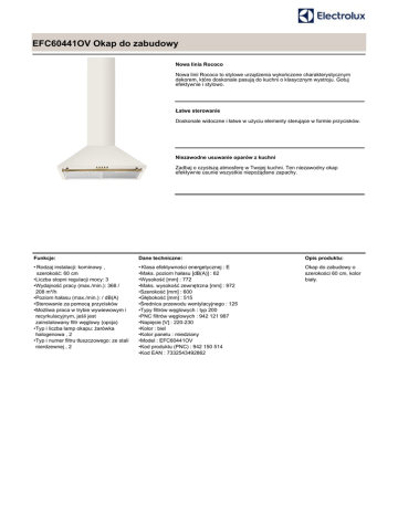 EFC60441OV Okap do zabudowy Nowa linia Rococo Nowa linii Rococo to stylowe urządzenia wykończone charakterystycznym dekorem, które doskonale pasują do kuchni o klasycznym wystroju. Gotuj efektywnie i stylowo. Łatwe sterowanie Doskonale widoczne i łatwe w użyciu elementy sterujące w formie przycisków. Niezawodne usuwanie oparów z kuchni Zadbaj o czystszą atmosferę w Twojej kuchni. Ten niezawodny okap efektywnie usunie wszystkie niepożądane zapachy. Funkcje: Dane techniczne: Opis produktu: • Rodzaj instalacji: kominowy , szerokość: 60 cm •Liczba stopni regulacji mocy: 3 •Wydajność pracy (max./min.): 368 / 208 m³/h •Poziom hałasu (max./min.): / dB(A) •Sterowanie za pomocą przycisków •Możliwa praca w trybie wywiewowym i recyrkulacyjnym, jeśli jest zainstalowany filtr węglowy (opcja) •Typ i liczba lamp okapu: żarówka halogenowa , 2 •Typ i numer filtru tłuszczowego: ze stali nierdzewnej , 2 • Klasa efektywności energetycznej : E •Maks. poziom hałasu [dB(A)] : 62 •Wysokość [mm] : 772 •Maks. wysokość zewnętrzna [mm] : 972 •Szerokość [mm] : 600 •Głębokość [mm] : 515 •Średnica przewodu wentylacyjnego : 125 •Typy filtrów węglowych : typ 200 •PNC filtrów węglowych : 942 121 987 •Napięcie [V] : 220-230 •Kolor : biel •Kolor panelu : miedziany •Model : EFC60441OV •Kod produktu (PNC) : 942 150 514 •Kod EAN : 7332543492862 Okap do zabudowy o szerokości 60 cm, kolor biały.