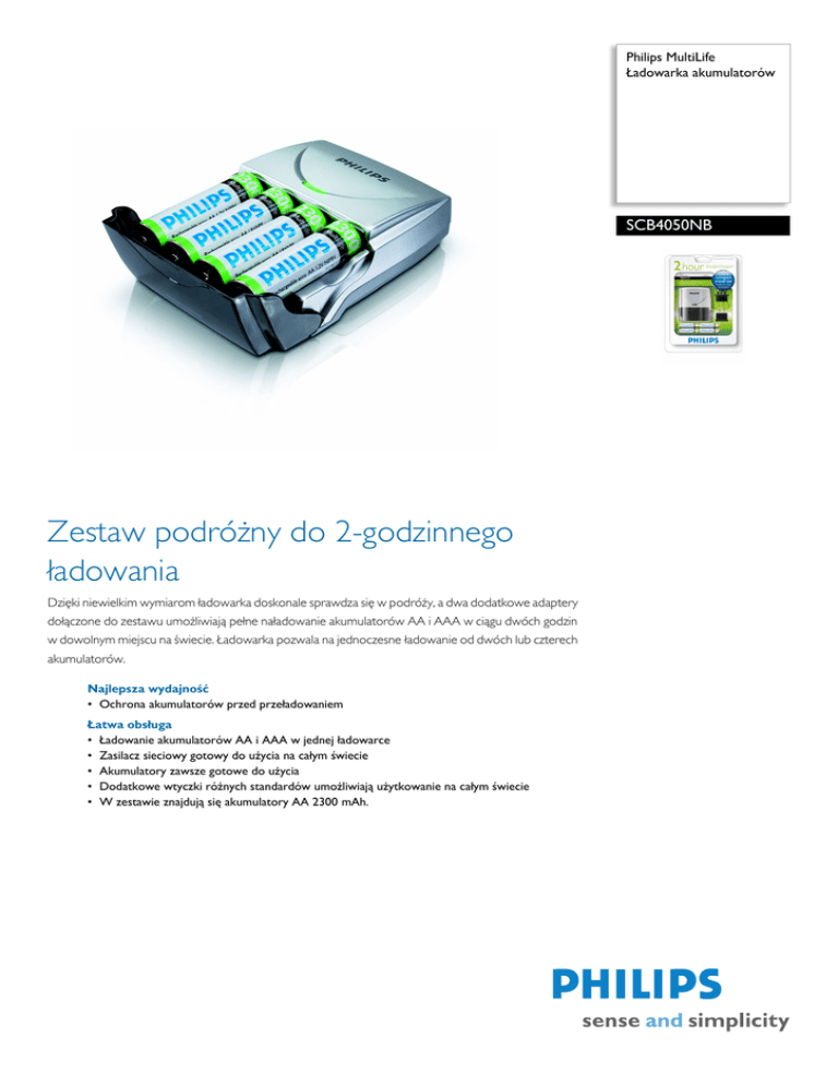 Philips MultiLife Ładowarka akumulatorów SCB4050NB Zestaw podróżny do 2-godzinnego ładowania Dzięki niewielkim wymiarom ładowarka doskonale sprawdza się w podróży, a dwa dodatkowe adaptery dołączone do zestawu umożliwiają pełne naładowanie akumulatorów AA i AAA w ciągu dwóch godzin w dowolnym miejscu na świecie. Ładowarka pozwala na jednoczesne ładowanie od dwóch lub czterech akumulatorów. Najlepsza wydajność • Ochrona akumulatorów przed przeładowaniem Łatwa obsługa • Ładowanie akumulatorów AA i AAA w jednej ładowarce • Zasilacz sieciowy gotowy do użycia na całym świecie • Akumulatory zawsze gotowe do użycia • Dodatkowe wtyczki różnych standardów umożliwiają użytkowanie na całym świecie • W zestawie znajdują się akumulatory AA 2300 mAh. SCB4050NB/12 Ładowarka akumulatorów Dane techniczne Zalety produktu Zasilanie • Baterie w zestawie • Pojemność baterii: 2300 mAh • Zasilanie: 100–240 V AC, 50/60 Hz Specyfikacja techniczna • Materiał obudowy: Tworzywo ABS Charakterystyka ekologiczna • Metale ciężkie: Bezkadmowe, Bezrtęciowy, Bezołowiowy • Materiały opakowaniowe: tworzywo PET • Rodzaj opakowania: Blister składany Ładowanie akumulatorów AA i AAA Ładowarka umożliwia ładowanie akumulatorów AA i AAA. Wymiary Do użytku na całym świecie Zasilacz sieciowy umożliwiający korzystanie z napięcia wejściowego w zakresie od 100 do 240 V. Dodając konwerter wtyku odpowiedni dla danego kraju, można używać ładowarki na całym świecie. • Wymiary blistra (SxGxW): 18 x 25 x 6 cm • Wymiary wewnętrzne kartonu (SxDxW): 17 x 26,2 x 21 cm • Ilość szt. w opakowaniu zbiorczym: 4 • Inteligentna ochrona ładowania Specjalny czujnik wykrywa stan pełnego naładowania akumulatorów i przełącza ładowarkę w tryb powolnego ładowania, co pozwala utrzymać całkowicie naładowane akumulatory w gotowości do użycia. Ochrona przed przeładowaniem zwiększa żywotność akumulatorów i zapobiega ich uszkodzeniu. Powolne ładowanie Wszystkie akumulatory rozładowują się w miarę upływu czasu. Automatycznie uruchamiane powolne ładowanie pozwala na utrzymanie pełnej gotowości akumulatorów po umieszczeniu ich w ładowarce i podłączeniu do gniazdka elektrycznego. W zestawie wtyczki różnych standardów Dwa dodatkowe adaptery można podłączyć do oryginalnej wtyczki zasilacza, aby umożliwić korzystanie z ładowarki w krajach, które mają angielskie lub amerykańskie standardy gniazdek elektrycznych. 2300 mAh MultiLife AA w zestawie 2300 mAh energii pozwala na dłuższe działanie odtwarzacza audio lub aparatu cyfrowego. Data wydania 2008-04-04 © 2008 Koninklijke Philips Electronics N.V. Wszelkie prawa zastrzeżone. Wersja: 1.0.5 Dane techniczne mogą ulec zmianie bez powiadomienia. Znaki towarowe są własnością Koninklijke Philips Electronics N.V. lub własnością odpowiednich firm. 12 NC: 9082 100 07939 EAN: 87 10895 95923 0 www.philips.com