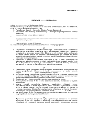 Załącznik Nr 3 UMOWA NR ............/2012 (projekt) w dniu .........................r. w Rzekuniu pomiędzy: Ośrodkiem Pomocy Społecznej w Rzekuniu, ul. Kolonia 1b, 07-411 Rzekuń, NIP: 758-18-57-041, REGON: 550709340 reprezentowanym przez: 1. Panią Danutę Orzołek – Kierownika Ośrodka Pomocy Społecznej 2. przy udziale Pani Wiesławy Dzierżanowskiej – Głównego księgowego Ośrodka Pomocy Społecznej zwanym w treści umowy „Zamawiającym” a ............................................................................................................................................... reprezentowanym przez : ............................................................................................................................................... zwanym w treści umowy Wykonawcą na podstawie oferty Wykonawcy została zawarta umowa o następującej treści: § 1. Na podstawie rozstrzygnięcia zapytania ofertowego - Zamawiający zleca a Wykonawca przyjmuje do wykonania świadczenie usługi transportowej samochodem osobowym polegającej na przewozie pracowników Ośrodka w celu realizacji zadań statutowych na terenie gminy Rzekuń, w granicach administracyjnych, jak również na terenie województwa mazowieckiego, zgodnie ze złożoną ofertą – załącznik do niniejszej Umowy stanowiący jej integralną część. 2. Wykonawca w ramach wykonywania określonych w ust. 1 usług, zobowiązuje się przez trzy dni w każdym tygodniu, w dniach poniedziałek, środa, czwartek w godz. 10.00 do 15.00 podstawić do dyspozycji Zamawiającego – Ośrodek Pomocy Społecznej w Rzekuniu, ul. Kolonia 1b - określony w ust. 1 samochód osobowy. 1. § 2. 1. Za wykonaną usługę Wykonawca będzie otrzymywał wynagrodzenie brutto ustalone jako iloczyn przejechanych kilometrów i kwoty ....................... zł brutto (słownie złotych:.................................) za 1 kilometr przebiegu pojazdu. 2. Rozliczenie będzie następowało w cyklach miesięcznych na podstawie potwierdzanej codziennie przez Zamawiającego i Wykonawcę w zeszycie wyjazdów samochodu liczby przejechanych kilometrów według wskazań stanu licznika samochodu. 3. Określona w ust.1 stawka pozostaje niezmienna na czas trwania umowy. 4. Termin płatności wynosi 7 dni od dnia otrzymania rachunku, realizowany w cyklach miesięcznych. 5. Łączną wartość zamówienia będącego przedmiotem niniejszej umowy przy obowiązującym na okres objęty umową limicie kilometrów wynoszącym 9 000 km (licząc z miejsca odjazdu: Ośrodek Pomocy Społecznej w Rzekuniu, ul. Kolonia 1b i kończąc na miejscu: Ośrodek Pomocy Społecznej w Rzekuniu, ul. Kolonia 1b), strony określają jako iloczyn przejechanych kilometrów i kwoty ....................... zł brutto. 6. Nie wykorzystanie w ust. 5 limitu kilometrów pozbawia Wykonawcę prawa do roszczenia o wynagrodzenie za niewykorzystanie kilometry. § 3. Wykonawca gwarantuje dostępność wyżej wymienionego samochodu w terminach określonych w ust. 2 i 3 paragrafu 1 umowy i w razie jakiejkolwiek awarii lub choroby zobowiązuje się udostępnić zastępczy pojazd, ewentualnie rezerwowego kierowcę. W przypadku nie wywiązania się z obowiązku podstawienia pojazdu zastępczego Zamawiający wynajmie inny transport na koszt Wykonawcy według stawek obowiązujących w transporcie publicznym. § 4. 1. Umowa obowiązuje od dnia 01 września 2012 r. do dnia 301 grudnia 2013 r. 2. Każda ze stron może rozwiązać umowę z zachowaniem miesięcznego okresu wypowiedzenia. § 5. Zmiany niniejszej umowy wymagają formy pisemnej pod rygorem nieważności. § 6. W sprawach nie uregulowanych w umowie zastosowanie mają przepisy ustawy – Prawo Zamówień Publicznych oraz Kodeksu Cywilnego. § 7. Umowę sporządzono w dwóch jednobrzmiących egzemplarzach po jednym egzemplarzu dla każdej ze stron. Zamawiający: Wykonawca: