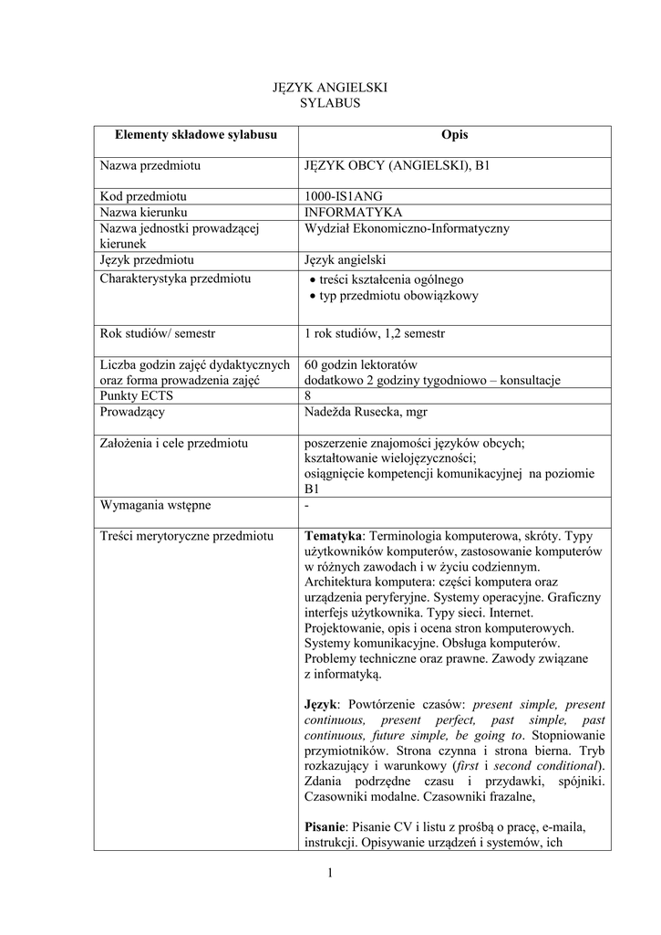 JĘZYK ANGIELSKI SYLABUS Elementy składowe sylabusu Opis Nazwa przedmiotu JĘZYK OBCY (ANGIELSKI), B1 Kod przedmiotu Nazwa kierunku Nazwa jednostki prowadzącej kierunek Język przedmiotu Charakterystyka przedmiotu 1000-IS1ANG INFORMATYKA Wydział Ekonomiczno-Informatyczny Rok studiów/ semestr 1 rok studiów, 1,2 semestr Liczba godzin zajęć dydaktycznych oraz forma prowadzenia zajęć Punkty ECTS Prowadzący 60 godzin lektoratów dodatkowo 2 godziny tygodniowo – konsultacje 8 Nadežda Rusecka, mgr Założenia i cele przedmiotu poszerzenie znajomości języków obcych; kształtowanie wielojęzyczności; osiągnięcie kompetencji komunikacyjnej na poziomie B1 - Wymagania wstępne Treści merytoryczne przedmiotu Język angielski treści kształcenia ogólnego typ przedmiotu obowiązkowy Tematyka: Terminologia komputerowa, skróty. Typy użytkowników komputerów, zastosowanie komputerów w różnych zawodach i w życiu codziennym. Architektura komputera: części komputera oraz urządzenia peryferyjne. Systemy operacyjne. Graficzny interfejs użytkownika. Typy sieci. Internet. Projektowanie, opis i ocena stron komputerowych. Systemy komunikacyjne. Obsługa komputerów. Problemy techniczne oraz prawne. Zawody związane z informatyką. Język: Powtórzenie czasów: present simple, present continuous, present perfect, past simple, past continuous, future simple, be going to. Stopniowanie przymiotników. Strona czynna i strona bierna. Tryb rozkazujący i warunkowy (first i second conditional). Zdania podrzędne czasu i przydawki, spójniki. Czasowniki modalne. Czasowniki frazalne, Pisanie: Pisanie CV i listu z prośbą o pracę, e-maila, instrukcji. Opisywanie urządzeń i systemów, ich 1 Zawartość tematyczna poszczególnych ćwiczeń zastosowania i funkcji. Opisy wykresów i diagramów. Wypełnianie formularzy i tabeli. 1. Zajęcie organizacyjno-informacyjne (zaliczenia, egzamin, metody i style uczenia się języka obcego, wyrazy i zwroty międzynarodowe, zwroty grzecznościowe, polecenia). Powtórzenie czasów. (2 godz.) 2. Użytkownicy komputerów. Present Perfect, Past Simple: twierdzenia, przeczenia, pytania, porównanie zastosowania. (2 godz.) 3. Architektura komputera. Opis funkcjonowania przyrządu. Przyimki miejsca. Wymiana informacji technicznej, podawanie instrukcji. Test 1 (2 godz.) 4. Strona bierna, Present Simple Passive. Odczytywanie wykresów. Opis procesu. (2 godz.) 5. Powtórzenie stopniowania przymiotników. Kontrast i porównywanie. Opis funkcji. (2 godz.) 6. Dialog: wywiad ze studentem informatyki. Powtórzenie. Test 2. (2 godz.) 7. Systemy operacyjne. Opis funkcji i zastosowania tych systemów. Użycie formy Verb-ing w funkcji podmiotu, dopełnienia oraz po przyimkach. (2 godz.) 8. Graficzny interfejs użytkownika. Modele użycia czasowników make, let, allow, enable, help, permit. Odczytywanie i objaśnianie wykresów. (2 godz.) 9. Programy aplikacyjne. Złożone instrukcje oraz rekomendacje. Praca z tekstem. Wymiana informacji. Test 3. (2 godz.) 10. Programy multimedialne. Wyszukiwanie informacji w tekstach i na diagramach. Objaśnianie przyczyn i skutków. (2 godz.) 11. Sprawdzian pracy samodzielnej. Prezentacje na wybrany temat. (2 godz.) 12. Zdania warunkowe 1 przypuszczający. (2 godz.) i 2 typu, tryb 13. Rzeczowniki złożone: Noun + Noun. Porównywanie wysłuchanego tekstu i wykresu. (2 godz.) 2 14. Dialog: wywiad z pracownikiem obsługi technicznej. Rozwiązywanie problemów i udzielanie rad. (2 godz.) Powtórzenie. Test 4. (2 godz.) 15. 16. Sieć. Topologia sieci. Zdania podrzędne przydawki: which, who, that, whose, where, when, why. Objaśnianie zalet i braków. (2 godz.) 17. Internet. Ostrzeżenia, plusy i minusy sieci. Pisanie artykułu pt Komunikacja za pośrednictwem komputera. (2 godz.) 18. Sieć globalna, zdania podrzędne czasu: when, after, before, etc. Przekazywanie informacji, robienie notatek. Stylistyka korespondencji elektronicznej. Pisanie emaila. Test 5. (2 godz.) 19. Strony internetowe. Praca z tekstem: odczytywanie intencji autora. Wymiana informacji. Opis i ocena strony internetowej. (2 godz.) 20. Dialog: rozmowa z projektantem stron internetowych. Tryb przypuszczający, użycie would. Układanie definicji, zwoty złożone, kolokacje. (2 godz.) Powtórzenie. Test 6. (2 godz.) 21. 22. Systemy komunikacyjne. Przewidywanie przyszłości, wyrażanie pewności. Wymiana informacji w celu ułożenia diagramu. Opis systemu. (2 godz.) 23. Obsługa komputerów. Diagnozowanie usterek, wyjaśnianie przyczyn. Rozmowa telefoniczna, zapełnianie formy. Udzielanie rad w rozwiązywaniu problemów technicznych. Pisanie raportu. (2 godz.) 24. Bezpieczeństwo informacji. Wyrażanie przyczyn i skutków, czasowniki cause, make, allow, prevent, etc oraz spójniki as, because, therefore, etc. Odczytywanie i układanie tabeli danych. (2 godz.) 25. Dyskusja: komputeryzacja a przestępczość. Wyrażanie opinii, podawanie argumentów, zgadzanie się, przeczenie. Czasowniki frazalne. (2 godz.) 3 26. Programowanie. Typy błędów. Diagramy sekwencji działań. Opis diagramu, wykresu. Test 7. (2 godz.) 27. Zawody w IT. Wymagania dla specjalisty, czasowniki i zwroty modalne: need, have, must, be+critical, be+ essential. Rozmowa kwalifikacyjna. Pisanie CV i listu z prośbą o pracę. (2 godz.) 28. Sprawdzian pracy samodzielnej. Prezentacje na wybrany temat. (2 godz.) Forma i warunki zaliczenia przedmiotu Wykaz literatury podstawowej i uzupełniającej 29. Powtórzenie. Test 8. (2 godz.) 30. Omówienie rezultatów. Zaliczenie. (2 godz.) Regularna obecność na zajęciach - można opuścić dwa zajęcia w semestrze. W wypadku nieusprawiedliwionej nieobecności na zajęciach student jest zobowiązany do opracowania tekstu wskazanego przez lektora (długość tekstu- strona A4) i wykazać się podczas konsultacji lektora umiejętnością poprawnego przeczytania i streszczenia/ interpretacji przygotowanego tekstu. Aktywność na zajęciach. Praca własna studenta (odrabi