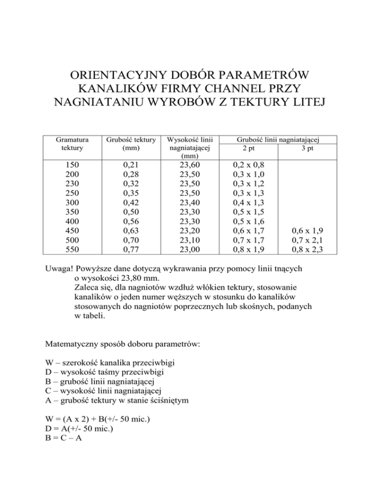 ORIENTACYJNY DOBÓR PARAMETRÓW KANALIKÓW FIRMY CHANNEL PRZY NAGNIATANIU WYROBÓW Z TEKTURY LITEJ Gramatura tektury Grubość tektury (mm) Wysokość linii nagniatającej (mm) 150 200 230 250 300 350 400 450 500 550 0,21 0,28 0,32 0,35 0,42 0,50 0,56 0,63 0,70 0,77 23,60 23,50 23,50 23,50 23,40 23,30 23,30 23,20 23,10 23,00 Grubość linii nagniatającej 2 pt 3 pt 0,2 x 0,8 0,3 x 1,0 0,3 x 1,2 0,3 x 1,3 0,4 x 1,3 0,5 x 1,5 0,5 x 1,6 0,6 x 1,7 0,7 x 1,7 0,8 x 1,9 0,6 x 1,9 0,7 x 2,1 0,8 x 2,3 Uwaga! PowyŜsze dane dotyczą wykrawania przy pomocy linii tnących o wysokości 23,80 mm. Zaleca się, dla nagniotów wzdłuŜ włókien tektury, stosowanie kanalików o jeden numer węŜszych w stosunku do kanalików stosowanych do nagniotów poprzecznych lub skośnych, podanych w tabeli. Matematyczny sposób doboru parametrów: W – szerokość kanalika przeciwbigi D – wysokość taśmy przeciwbigi B – grubość linii nagniatającej C – wysokość linii nagniatającej A – grubość tektury w stanie ściśniętym W = (A x 2) + B(+/- 50 mic.) D = A(+/- 50 mic.) B=C–A