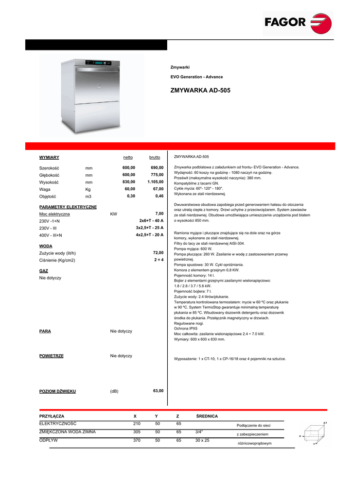 Zmywarki EVO Generation - Advance ZMYWARKA AD-505 netto WYMIARY brutto Szerokość mm 600,00 690,00 Głębokość mm 600,00 775,00 Wysokość mm 830,00 1.105,00 Waga Kg 60,00 67,00 Objętość m3 0,30 0,46 PARAMETRY ELEKTRYCZNE Moc elektryczna 7,00 KW 2x6+T - 40 A 230V -1+N 230V - III 3x2,5+T - 25 A 400V - III+N 4x2,5+T - 20 A WODA Zużycie wody (lit/h) 72,00 Ciśnienie (Kg/cm2) 2÷4 GAZ Nie dotyczy PARA Nie dotyczy POWIETRZE Nie dotyczy POZIOM DŹWIĘKU (dB) ZMYWARKA AD-505 Zmywarka podblatowa z załadunkiem od frontu- EVO Generation - Advance. Wydajność: 60 koszy na godzinę - 1080 naczyń na godzinę. Prześwit (maksymalna wysokość naczynia): 380 mm. Kompatybilne z tacami GN. Cykle mycia: 60"- 120" - 180". Wykonana ze stali nierdzewnej. Dwuwarstwowa obudowa zapobiega przed generowaniem hałasu do otoczenia oraz utratą ciepła z komory. Drzwi uchylne z przeciwciężarem. System zawiasów ze stali nierdzewnej. Obudowa umożliwiająca umieszczenie urządzenia pod blatem o wysokości 850 mm. Ramiona myjące i płuczące znajdujące się na dole oraz na górze komory, wykonane ze stali nierdzewnej. Filtry do tacy ze stali nierdzewnej AISI-304. Pompa myjąca: 600 W. Pompa płucząca: 260 W. Zasilanie w wodę z zastosowaniem przerwy powietrznej. Pompa spustowa: 30 W. Cykl opróżniania. Komora z elementem grzejnym 0,8 KW. Pojemność komory: 14 l. Bojler z elementami grzejnymi zasilanymi wielonapięciowo: 1.8 / 2.8 / 3.7 / 5.6 kW. Pojemność bojlera: 7 l. Zużycie wody: 2.4 litrów/płukanie. Temperatura kontrolowana termostatem: mycie w 60 ºC oraz płukanie w 90 ºC. System TermoStop gwarantuje minimalną temperaturę płukania w 85 ºC. Wbudowany dozownik detergentu oraz dozownik środka do płukania. Przełącznik magnetyczny w drzwiach. Regulowane nogi. Ochrona IPX5 Moc całkowita: zasilanie wielonapięciowe 2.4 ÷ 7.0 kW. Wymiary: 600 x 600 x 830 mm. Wyposażenie: 1 x CT-10, 1 x CP-16/18 oraz 4 pojemniki na sztućce. 63,00 PRZYŁĄCZA X Y Z ELEKTRYCZNOŚĆ 210 50 65 ŚREDNICA ZMIĘKCZONA WODA ZIMNA 305 50 65 3/4" ODPŁYW 370 50 65 30 x 25 Podłączenie do sieci z zabezpieczeniem różnicowoprądowym Together we evolve para más información: 943 71 80 30 / [email protected] / Barrio Sancholopetegui C.P: 20560