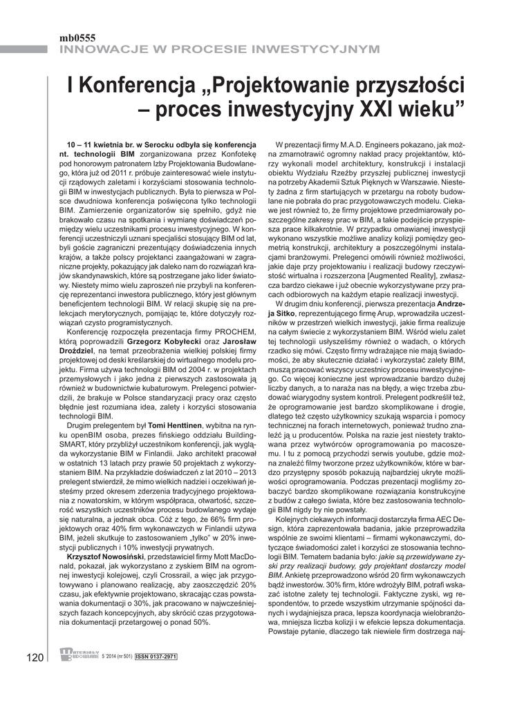 mb0555 INNOWACJE W PROCESIE INWESTYCYJNYM I Konferencja „Projektowanie przyszłości – proces inwestycyjny XXI wieku” 10 – 11 kwietnia br. w Serocku odbyła się konferencja nt. technologii BIM zorganizowana przez Konfotekę pod honorowym patronatem Izby Projektowania Budowlanego, która już od 2011 r. próbuje zainteresować wiele instytucji rządowych zaletami i korzyściami stosowania technologii BIM w inwestycjach publicznych. Była to pierwsza w Polsce dwudniowa konferencja poświęcona tylko technologii BIM. Zamierzenie organizatorów się spełniło, gdyż nie brakowało czasu na spotkania i wymianę doświadczeń pomiędzy wielu uczestnikami procesu inwestycyjnego. W konferencji uczestniczyli uznani specjaliści stosujący BIM od lat, byli goście zagraniczni prezentujący doświadczenia innych krajów, a także polscy projektanci zaangażowani w zagraniczne projekty, pokazujący jak daleko nam do rozwiązań krajów skandynawskich, które są postrzegane jako lider światowy. Niestety mimo wielu zaproszeń nie przybyli na konferencję reprezentanci inwestora publicznego, który jest głównym beneficjentem technologii BIM. W relacji skupię się na prelekcjach merytorycznych, pomijając te, które dotyczyły rozwiązań czysto programistycznych. Konferencję rozpoczęła prezentacja firmy PROCHEM, którą poprowadzili Grzegorz Kobyłecki oraz Jarosław Droździel, na temat przeobrażenia wielkiej polskiej firmy projektowej od deski kreślarskiej do wirtualnego modelu projektu. Firma używa technologii BIM od 2004 r. w projektach przemysłowych i jako jedna z pierwszych zastosowała ją również w budownictwie kubaturowym. Prelegenci potwierdzili, że brakuje w Polsce standaryzacji pracy oraz często błędnie jest rozumiana idea, zalety i korzyści stosowania technologii BIM. Drugim prelegentem był Tomi Henttinen, wybitna na rynku openBIM osoba, prezes fińskiego oddziału BuildingSMART, który przybliżył uczestnikom konferencji, jak wygląda wykorzystanie BIM w Finlandii. Jako architekt pracował w ostatnich 13 latach przy prawie 50 projektach z wykorzystaniem BIM. Na przykładzie doświadczeń z lat 2010 – 2013 prelegent stwierdził, że mimo wielkich nadziei i oczekiwań jesteśmy przed okresem zderzenia tradycyjnego projektowania z nowatorskim, w którym współpraca, otwartość, szczerość wszystkich uczestników procesu budowlanego wydaje się naturalna, a jednak obca. Cóż z tego, że 66% firm projektowych oraz 40% firm wykonawczych w Finlandii używa BIM, jeżeli skutkuje to zastosowaniem „tylko” w 20% inwestycji publicznych i 10% inwestycji prywatnych. Krzysztof Nowosiński, przedstawiciel firmy Mott MacDonald, pokazał, jak wykorzystano z zyskiem BIM na ogromnej inwestycji kolejowej, czyli Crossrail, a więc jak przygotowywano i planowano realizację, aby zaoszczędzić 20% czasu, jak efektywnie projektowano, skracając czas powstawania dokumentacji o 30%, jak pracowano w najwcześniejszych fazach koncepcyjnych, aby skrócić czas przygotowania dokumentacji przetargowej o ponad 50%. 120 5 ’2014 (nr 501) ISSN 0137-2971 W prezentacji firmy M.A.D. Engineers pokazano, jak można zmarnotrawić ogromny nakład pracy projektantów, którzy wykonali model architektury, konstrukcji i instalacji obiektu Wydziału Rzeźby przyszłej publicznej inwestycji na potrzeby Akademii Sztuk Pięknych w Warszawie. Niestety żadna z firm startujących w przetargu na roboty budowlane nie pobrała do prac przygotowawczych modelu. Ciekawe jest również to, że firmy projektowe przedmiarowały poszczególne zakresy prac w BIM, a takie podejście przyspiesza prace kilkakrotnie. W przypadku omawianej inwestycji wykonano wszystkie możliwe analizy kolizji pomiędzy geometrią konstrukcji, architektury a poszczególnymi instalacjami branżowymi. Prelegenci omówili również możliwości, jakie daje przy projektowaniu i realizacji budowy rzeczywistość wirtualna i rozszerzona [Augmented Reality], zwłaszcza bardzo ciekawe i już obecnie wykorzystywane przy pracach odbiorowych na każdym etapie realizacji inwestycji. W drugim dniu konferencji, pierwsza prezentacja Andrzeja Sitko, reprezentującego firmę Arup, wprowadziła uczestników w przestrzeń wielkich inwestycji, jakie firma realizuje na całym świecie z wykorzystaniem BIM. Wśród wielu zalet tej technologii usłyszeliśmy również o wadach, o których rzadko się mówi. Często firmy wdrażające nie mają świadomości, że aby skutecznie działać i wykorzystać zalety BIM, muszą pracować wszyscy uczestnicy procesu inwestycyjnego. Co więcej konieczne jest wprowadzanie bardzo dużej liczby danych, a to naraża nas na błędy, a więc trzeba zbudować wiarygodny system kontroli. Prelegent podkreślił też, że oprogramowanie jest bardzo skomplikowane i drogie, dlatego też często użytkownicy szukają wsparcia i pomocy technicznej na forach internetowych, ponieważ trudno znaleźć ją u producentów. Polska na razie jest niestety traktowana przez wytwórców oprogramowania po macoszemu. I tu z pomocą przychodzi serwis youtube, gdzie można znaleźć filmy tworzone przez użytkowników, które w bardzo przystępny sposób pokazują najbardziej ukryte możliwości oprogramowania. Podczas prezentacji mogliśmy zobaczyć bardzo skomplikowane rozwiązania konstrukcyjne z budów z całego świata, które bez zastosowania technologii BIM nigdy by nie powstały. Kolejnych ciekawych informacji dostarczyła firma AEC Design, która zaprezentowała badania, jakie przeprowadziła wspólnie ze swoimi klientami – firmami wykonawczymi, dotyczące świadomości zalet i korzyści ze stosowania technologii BIM. Tematem badania było: jakie są przewidywane zyski przy realizacji budowy, gdy projektant dostarczy model BIM. Ankietę przeprowadzono wśród 20 firm wykonawczych bądź inwestorów. 30% firm, które wdrożyły BIM, potrafi wskazać istotne zalety tej technologii. Faktyczne zyski, wg respondentów, to przede wszys