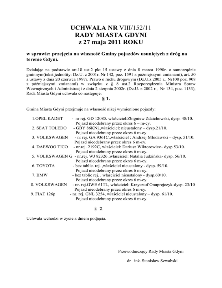 UCHWAŁA NR VIII/152/11 RADY MIASTA GDYNI z 27 maja 2011 ROKU w sprawie: przejęcia na własność Gminy pojazdów usuniętych z dróg na terenie Gdyni. Działając na podstawie art.18 ust.2 pkt 15 ustawy z dnia 8 marca 1990r. o samorządzie gminnym(tekst jednolity: Dz.U. z 2001r. Nr 142, poz. 1591 z późniejszymi zmianami), art. 50 a ustawy z dnia 20 czerwca 1997r. Prawo o ruchu drogowym (Dz.U.z 2005 r., Nr108 poz. 908 z późniejszymi zmianami) w związku z § 8 ust.2 Rozporządzenia Ministra Spraw Wewnętrznych i Administracji z dnia 2 sierpnia 2002r. (Dz.U. z 2002 r., Nr 134, poz. 1133), Rada Miasta Gdyni uchwala co następuje: § 1. Gmina Miasta Gdyni przejmuje na własność niŜej wymienione pojazdy: - nr rej. GD 12085. właściciel:Zbigniew Zdzichowski, dysp. 48/10. Pojazd nieodebrany przez okres 6 – m-cy. 2. SEAT TOLEDO - GBY 86KNj.,właściciel: nieustalony – dysp.21/10. Pojazd nieodebrany przez okres 6 m-cy 3. VOLKSWAGEN - nr rej. GA 9361C.,właściciel : Andrzej Młodawski – dysp. 51/10. Pojazd nieodebrany przez okres 6 m-cy. 4. DAEWOO TICO - nr.rej. 2192C, właściciel: Dariusz Wiktorowicz– dysp.53/10. Pojazd nieodebrany przez okres 6 m-cy. 5. VOLKSWAGEN G - nr.rej. WJ 82326 ,właściciel: Natalia Judzińska- dysp. 56/10. Pojazd nieodebrany przez okres 6 m-cy. 6. TOYOTA - bez tablic. rej. ,właściciel nieustalony - dysp. 59/10. Pojazd nieodebrany przez okres 6 m-cy. 7. BMW - bez tablic rej. , właściciel nieustalony - dysp.60/10. Pojazd nieodebrany przez okres 6 m-cy. 8. VOLKSWAGEN - nr. rej.GWE 61TL, właściciel: Krzysztof Onuprejczyk-dysp. 23/10 Pojazd nieodebrany przez okres 6 m-cy. 9. FIAT 126p - nr. rej. GNL 3254, właściciel nieustalony – dysp. 61/10. Pojazd nieodebrany przez okres 6 m-cy. 1.OPEL KADET § 2. Uchwała wchodzi w Ŝycie z dniem podjęcia. Przewodniczący Rady Miasta Gdyni dr inŜ. Stanisław Szwabski
