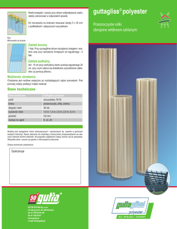 Strefy krawędzi i naroży przy silnym oddziaływaniu wiatru należy zamocować w odpowiedni sposób. Do mocowania na ścianach stosować wkręty 5 x 25 mm z podkładkami i załączonymi uszczelkami. Rys. Mocowanie na ścianie Zakład boczny 1 fala. Przy szczególnie silnym obciążeniu śniegiem i wiatrem oraz przy nachyleniu mniejszym od regularnego - 2 fale. 15 cm Zakład podłużny min. 15 cm przy nachyleniu dachu poniżej regularnego 20 cm, przy czym zaleca się dodatkowe uszczelnienie zakładów za pomocą silikonu. Możliwość chodzenia Chodzenie jest możliwe wyłącznie po rozdzielających ciężar pomostach. Pod pomosty należy podłożyć miękki materiał. Dane techniczne Dane techniczne Guttagliss polyester profil sinusoidalny 76/18 kolory przezroczysty, żółty, zielony długości rolek 30 mb wysokość rolek 1,0 m; 1,5 m; 2,0 m; 2,5 m; 3,0 m grubość 0,8 mm reakcja na ogień E, s3, d0 Możliwe jest wystąpienie różnic kolorystycznych i wymiarowych itp. zawarte w granicach zwykłych tolerancji. Nasze zalecenia nie zwalniają z konieczności przeprowadzenia we własnym zakresie kontroli materiału. W przypadku wątpliwości należy zwrócić się do specjalisty. Wszystkie dane i rysunki są zgodne z informacjami producenta. Zmiany techniczne zastrzeżone. Dystrybucja GUTTA POLSKA Sp. z o.o. ul. Fabryczna 9, 62-200 Gniezno tel. 61 428 20 64÷66 fax 61 428 20 67 www.gutta.pl e-mail: [email protected] guttagliss® polyester Przezroczyste rolki zbrojone włóknem szklanym Przezroczyste rolki zbrojone włóknem szklanym Korzystny cenowo i trwały materiał zespolony Odporność termiczna: od -400C do +1400C Dodatki do układania: Podkładka dystansowa Wkręt 4,5 x 45mm z podkładką i kapturkiem Kalenica PVC Wymagania Altana w ogrodzie Zadaszenie tarasu Nachylenie dachu nachylenie regularne - powyżej 100 (co najmniej 70) Konstrukcja nośna z łat drewnianych: 4 x 6 cm lub metalowa Rozstawy punktów podparcia maks. 50 cm przy grubości płyty 0,8 mm przy przeciętnych wartościach obciążenia śniegiem i wiatrem. Na obszarach o wysokich lub bardzo wysokich obciążeniach, rozstawy należy odpowiednio zmniejszyć. Pergola Hala magazynowa Zalety Zakres stosowania • zbrojenie włóknem szklanym • korzystne cenowo • odporność na działanie czynników atmosferycznych • wytrzymałość • reakcja na ogień E, s3, d0 • trwałość Przygotowanie Podział / cięcie • pokrycia dachowe • okładziny ścienne • obiekty rolnicze • szopy • zadaszenia • wiaty Cięcie wykonywać przy zastosowaniu wysokoobrotowych pilarek ręcznych i stołowych, utwardzoną, nie rozwartą tarczą o drobnym uzębieniu. Zwracać uwagę na dobre ułożenie materiału i korzystanie z prowadnicy, celem uniknięcia powstawania uszkodzeń. Wiercenie Materiał W miarę możliwości należy stosować wiertło stożkowe, stopniowe lub w razie konieczności wiertło HSS o szlifie 600 do 900. Wykonać wiercenie próbne. W przypadku, gdy krawędzie otworów wykazują rysy, należy zmienić narzędzie. Rysy mogą powodować pękanie płyt. Rolka polyester jest zbrojona włóknem szklanym, zespolonym materiałem, sprawdzonym od ponad 30 lat jako pokrycie dachowe i okładzina ścienna. Ten niedrogi materiał budowlany wyróżnia się w szczególny sposób swoją odpornością na działanie czynników atmosferycznych, z promieniowaniem UV włącznie. Płyty polyester są mocne, przepuszczają promienie świetlne bez powstawania odbić świetlnych, są bardzo odporne na przebieg procesów starzenia. Mocowanie Rolka polyester jest zbrojona włóknem szklanym, zespolonym materiałem, sprawdzonym od ponad 30 lat jako pokrycie dachowe i okładzina ścienna. Ten niedrogi materiał budowlany wyróżnia się w szczególny sposób swoją odpornością na działanie czynników atmosferycznych, z promieniowaniem UV włącznie. Płyty polyester są mocne, przepuszczają promienie świetlne bez powstawania odbić świetlnych, są bardzo odporne na przebieg procesów starzenia. gutta.pl Rys. Mocowanie na dachu Dach: na każdej 2 lub 3 fali, w grzbiecie fali. Ściana: na każdej 2 lub 3 fali, w zagłębieniu fali. W strefie zakładu na każdej fali. Mocowanie pokrycia dachu na konstrukcji drewnianej wykonuje się przy użyciu podkładek dystansowych i oryginalnych wkrętów dachowych guttagliss 4,5 x 45 mm z załączonymi uszczelkami. gutta.pl